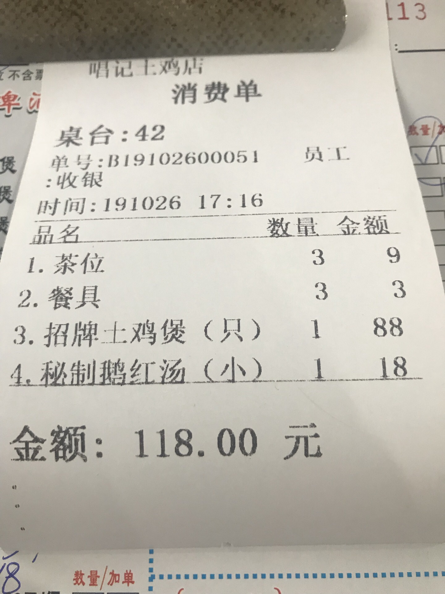 【招牌土鸡煲】上来一大煲,鸡肉结实,鸡味浓郁,非常嫩滑入味。买单118元,人均消费约40元