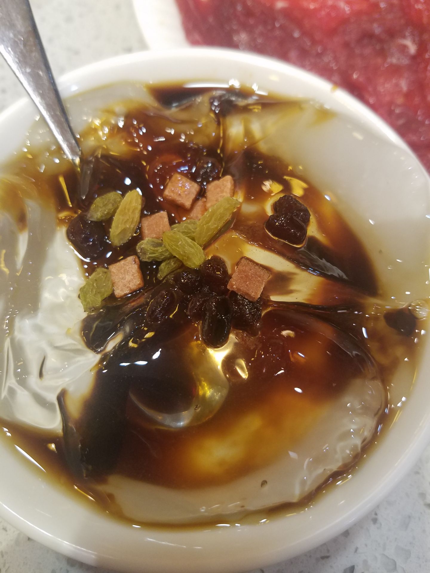 嫩牛肉,午餐肉,土鳝鱼不错,尤其是鳝鱼,很细嫩。菜品也是比较新鲜。要了一个鸳鸯锅,红锅要的是微辣