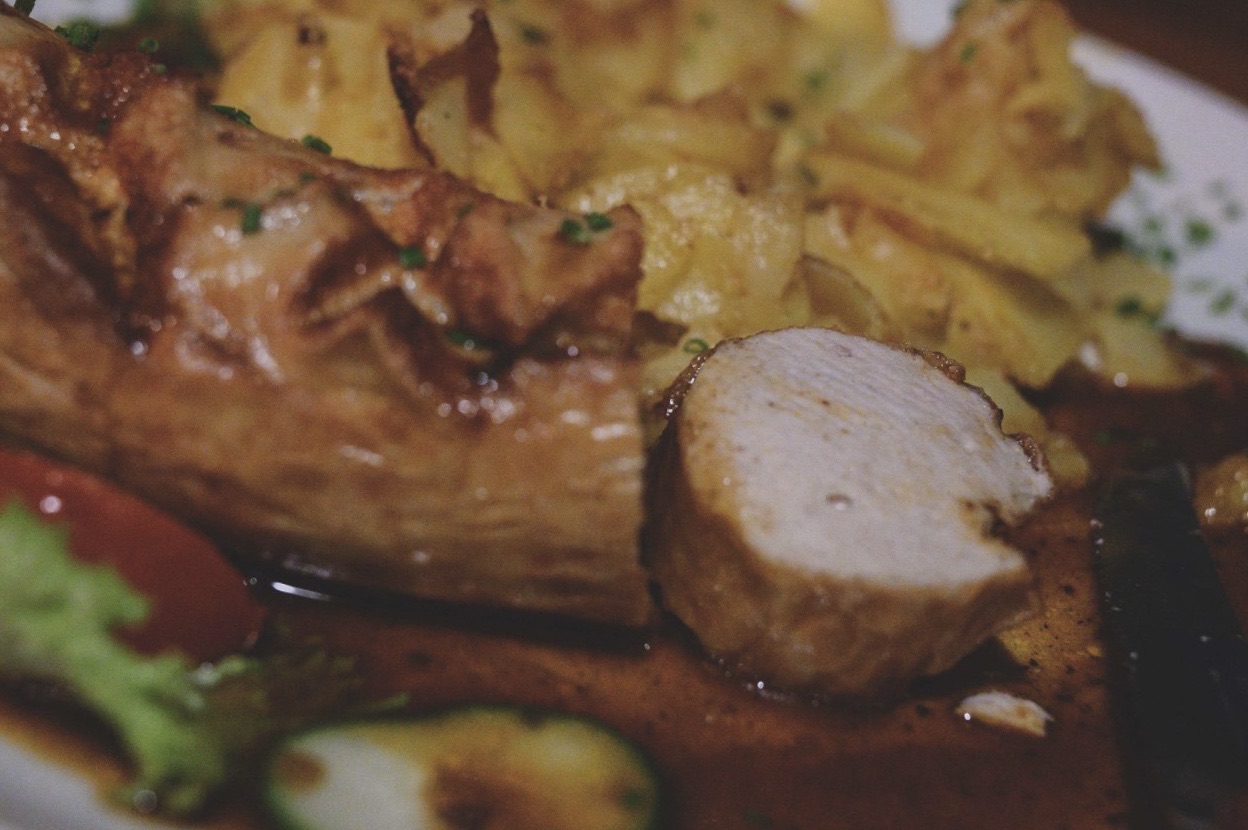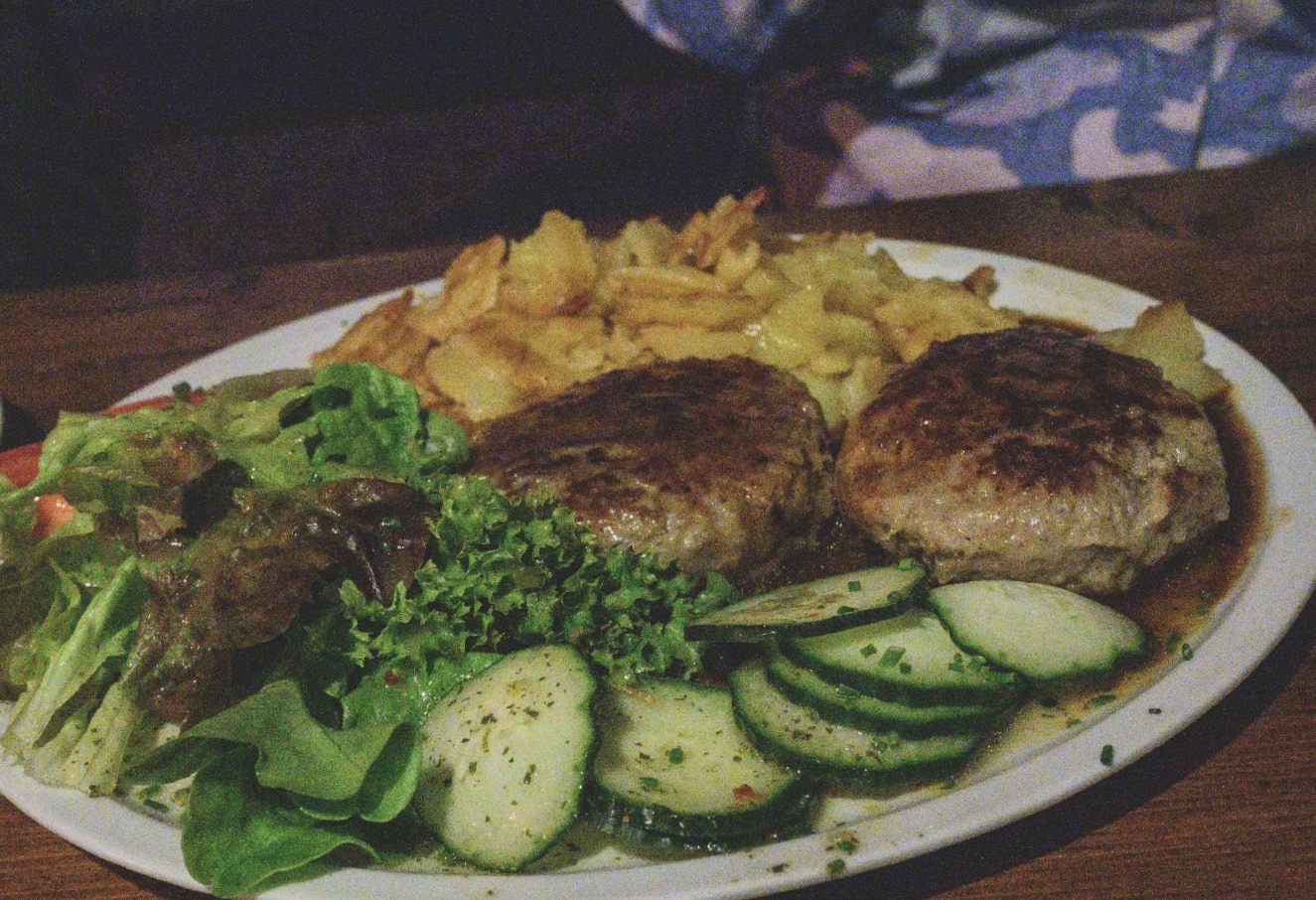 国王湖畔舍瑙Schönau Am Königssee 在airbnb上找的民宿,阳台风景真不错,每日早晨都有仙气可以吸,周边走走看看,步行距离还有一间小餐馆/酒馆。 - leberknödlsuppe:肝丸汤,混着些香草/料还有面包屑,腥味比想象中的少了蛮多,但...还是一盘只有一个人吃的很欢的菜。 - roasted sausage:简直就是巨型烤香肠,大的离谱,一个人根本吃不完!外层烤的有些焦香,配的酱汁不重咸。配的酸菜竟然是也是挺大一碗,点了这道看着这量有点方。来南德这块的时候,对于吃的要求就降低了好多,所以意外的觉得还不错 - meatballs:朋友点的肉饼子,也是好大一盘,感觉她一样方。肉丸子调味挺赞,三人都觉得这盘菜最好吃。同一款酱汁,肉饼子蘸酱吃的真香。一旁的配菜烤土豆单吃还行,但是吃到蘸有酱汁的那部分就觉得偏咸了。 三道菜都是8-9欧/盘,烤香肠和肉饼子都已经不是管饱的量了,简直是要撑死普通胃。实惠量大,基本都是熟客。去的时候被告知室内都满了,好在十月的室外不算太冷