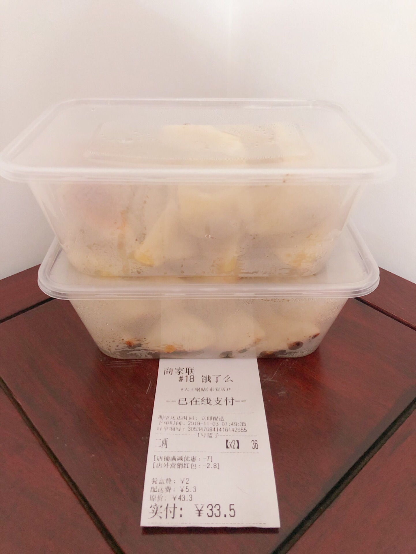 某人早上起来说想吃锅贴,也只有这家锅贴可以叫叫外卖了。 第三次吃大王锅贴,送来得很准时。 可能是因为路途的关系,皮都粘在一起了,但是汤汁还是很足。 肉不新鲜,肉腥气很重。 想着现在猪肉涨价了,是不是这家没涨价所以品质差? 结果打开手机一看,先前7块钱一两,如今9块钱一两,价格上去了,但是品质反而更差。 我觉得,我再也不会吃大王了……