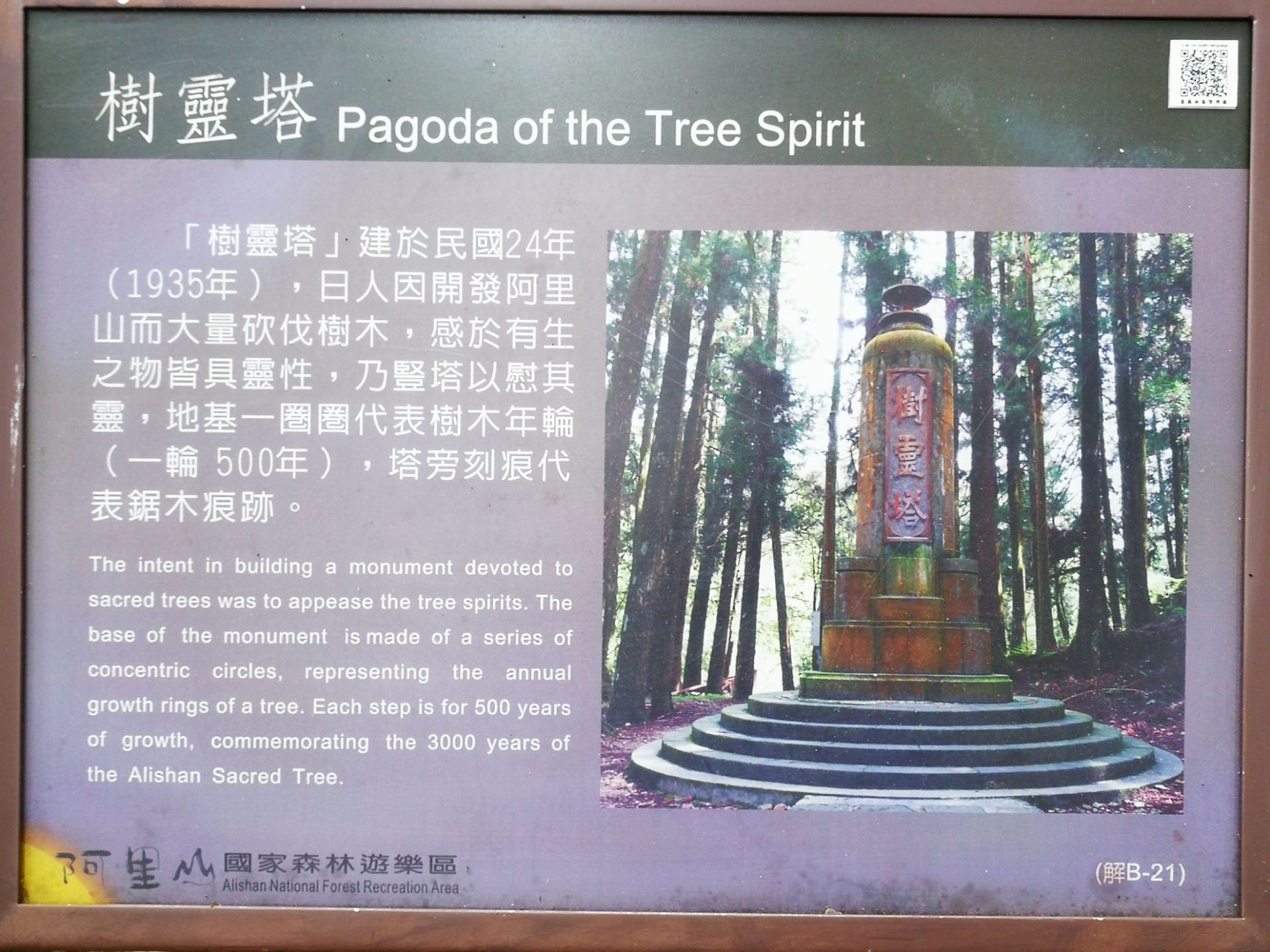 相信树木也有亡灵吗,阿里山那么多树木,应该有神灵保佑,要知道世界万物皆有灵。 灵塔建于民国二十四年(1935年)日本人因开发阿里山大量砍伐千年红桧巨木,砍伐工人先后得怪病死去,为祭祀被砍伐的千年红桧巨木,建造此塔以慰其灵。