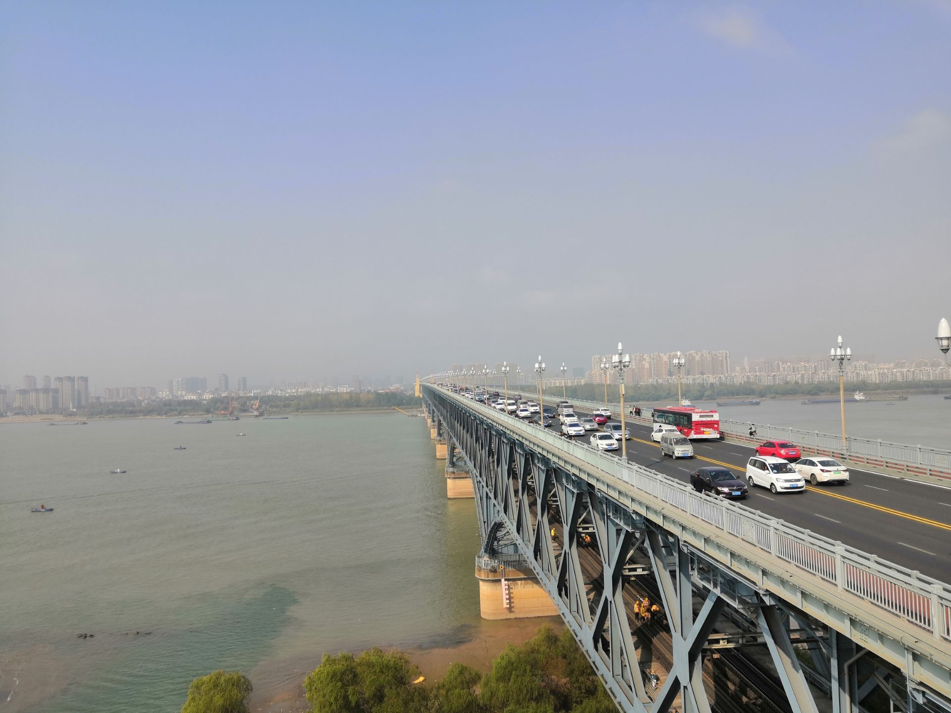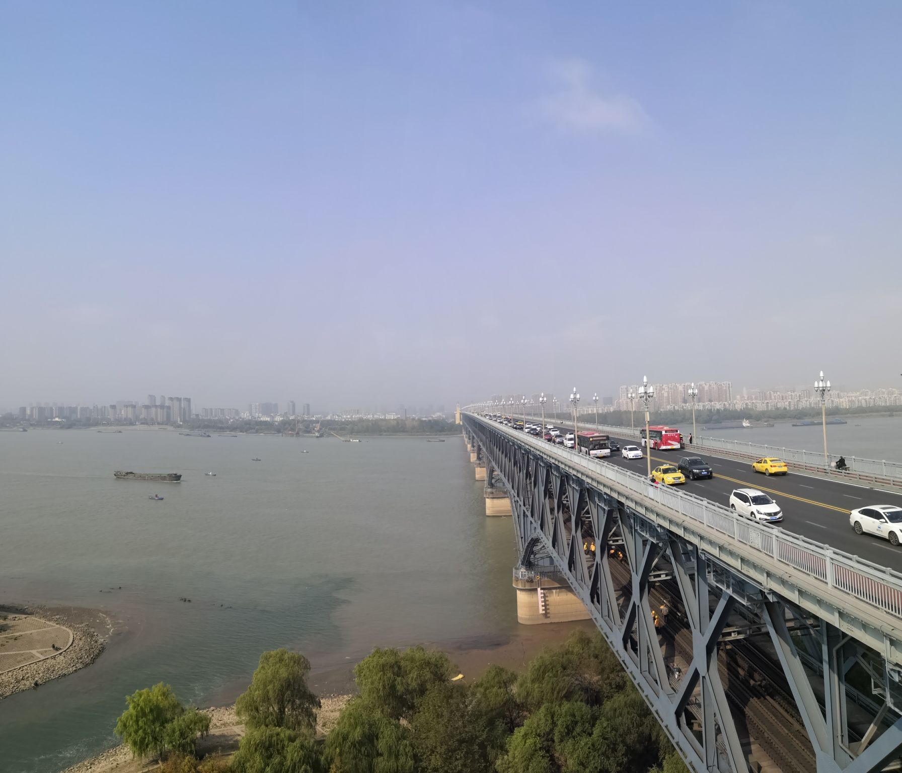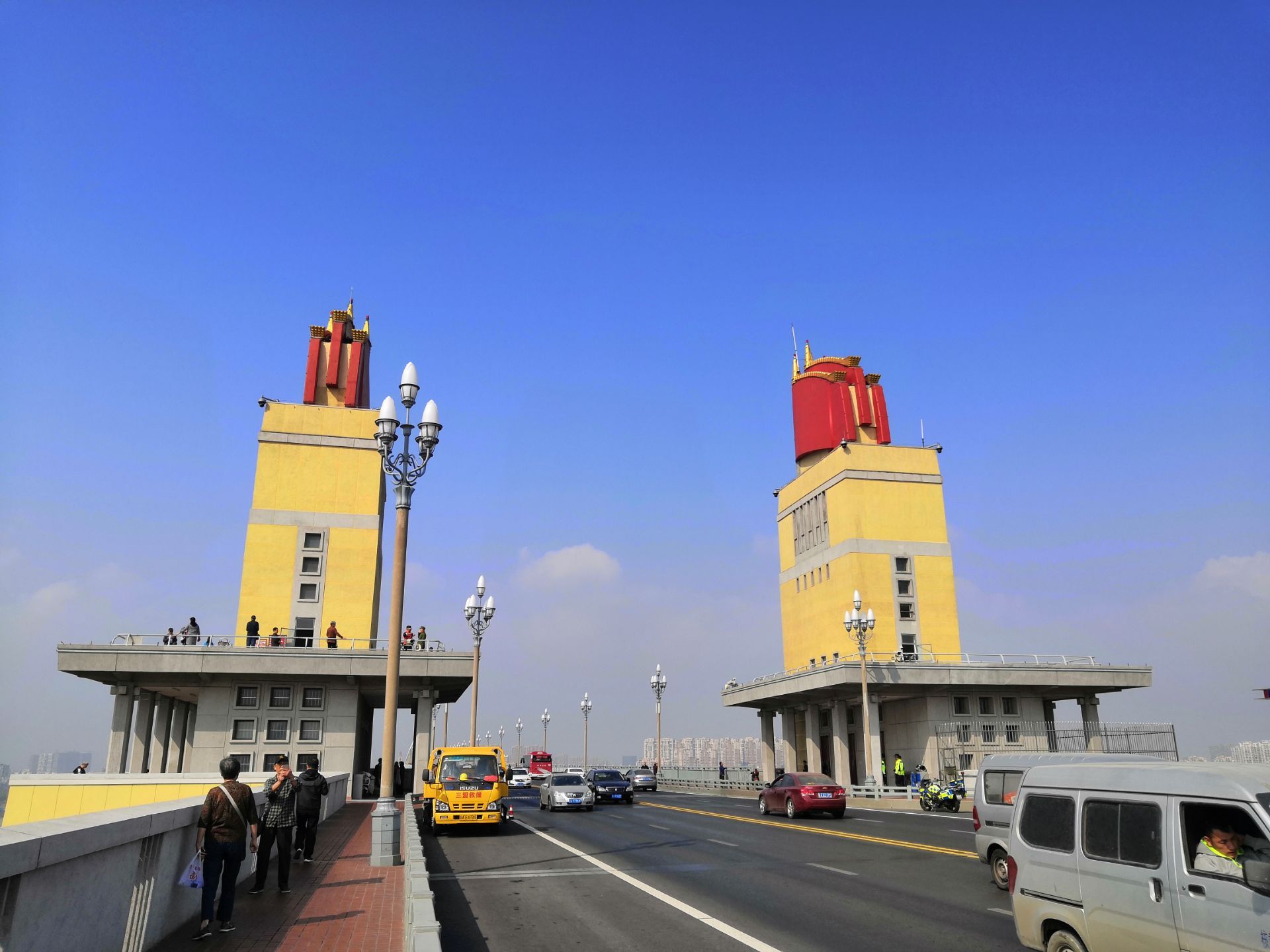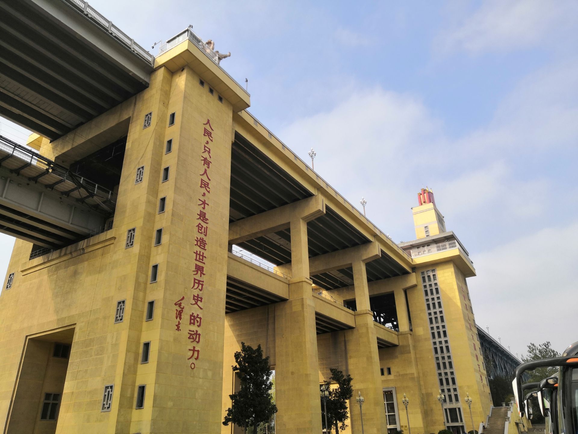 打车定位到【大桥公园】, 门票有两种,一种是【公园门票】,另一种是【电梯票】。 个人认为【公园门票】不用买,因为没有人查票,本地人都不买公园门票,自由入园的。 桥的两边都有登桥楼梯,如果想坐电梯登桥,那就要买【电梯票】。验票位置是“纪念馆”门口,参观完纪念馆,就会看到电梯。 电梯到五楼,是一个纪念品商店,往外走是一个拍照平台。 电梯到四楼,是桥面。人行道与汽车道有隔栏,汽车过桥的车速都很快,别妄想横穿桥面。人行道上有很多电动车穿梭,南京市民基本不会礼让游客,所以要特别注意安全!