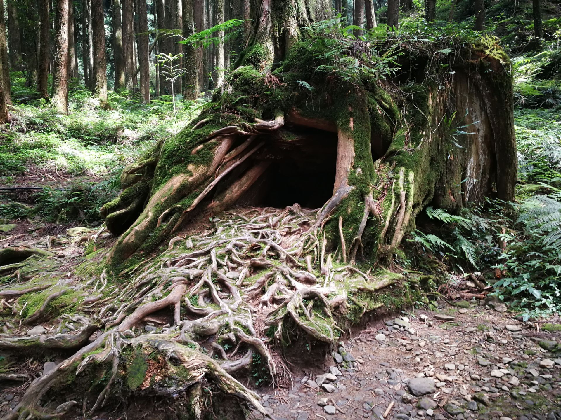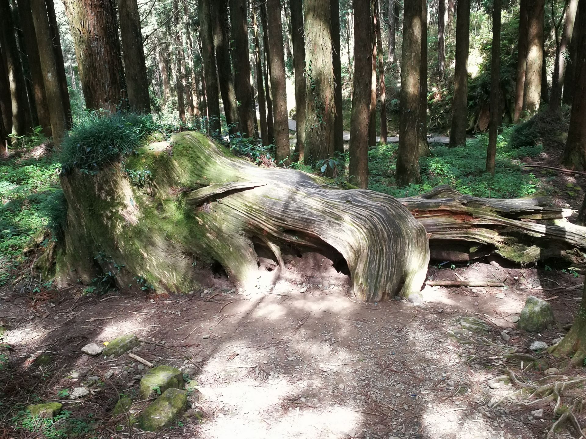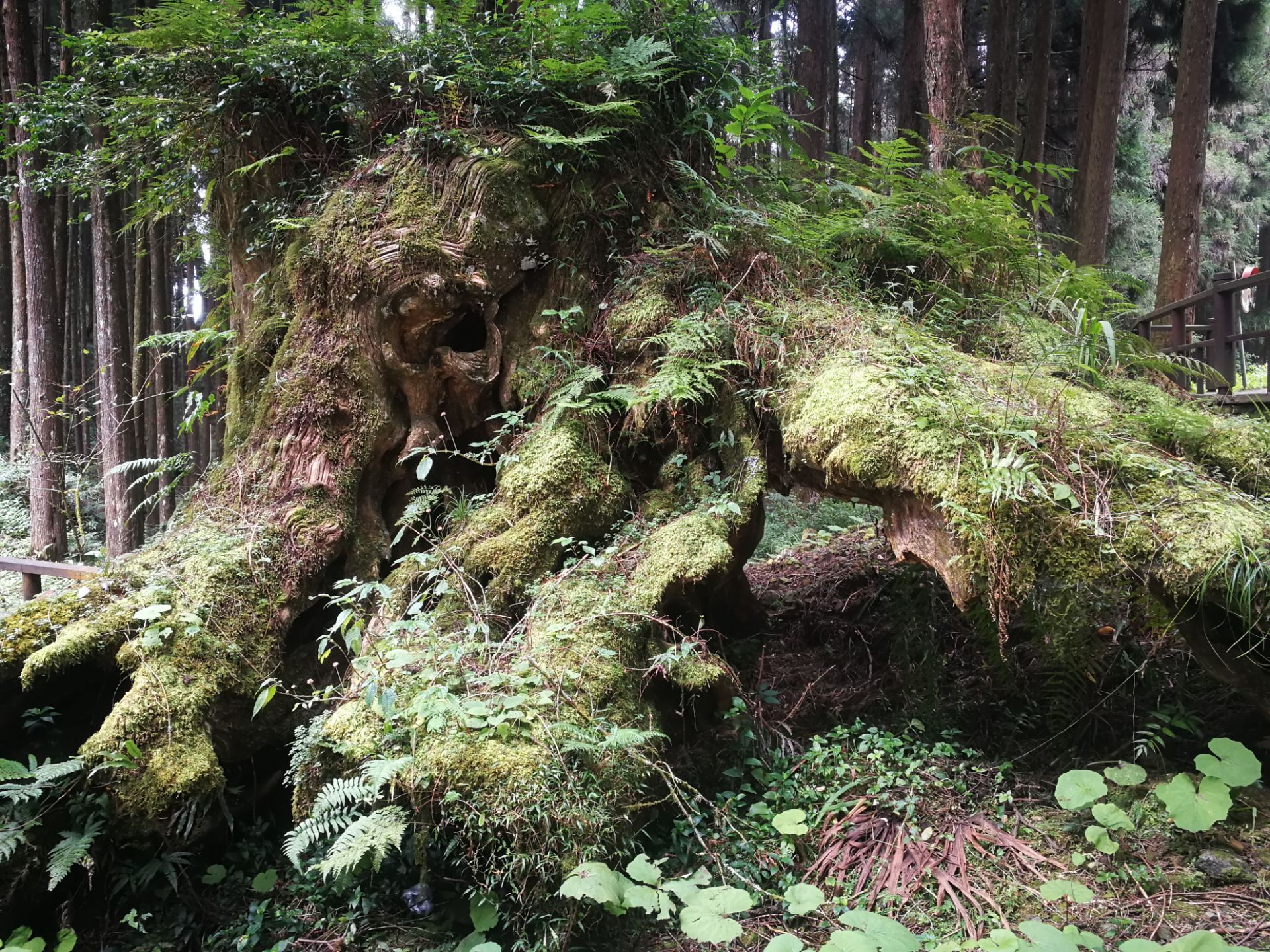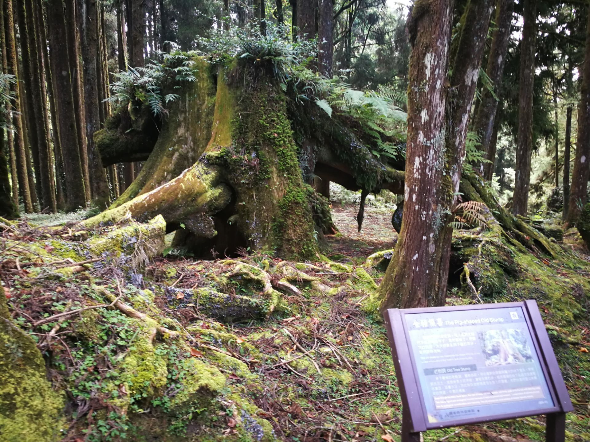 阿里山中有神木,屹立千年仍留存。 森林游乐区内沼平车站到受镇宫步道,有许多奇树怪石,一些未命名的巨根古木,有命名和标识牌的三兄弟,金猪报喜,台湾云蝶,永结同心,木兰园。 象鼻木和三代木紧挨着,名闻遐迩。象鼻木是一棵老桧树的树头,在森林里常年累月遭受飞吹雨打,大自然侵蚀改造打磨下,逐渐呈现出长毛象头脸部的面貌。三代木反映了树木生生不息,旺盛的生命力。 香林神木,28号巨木,巨木群栈道沿线可以看到所有已经标识和未命名的树木,都是为生态文明建设做出贡献神木。 独木不成林,森林就是由那么多树木构成地球的肺,可以吸收二氧化碳,噪音并且过滤尘粒,释放出新鲜的氧气。漫步其中,沐浴在树木散发出“芬多精”中,可以舒解视觉听觉疲劳,深呼吸,有益身心。