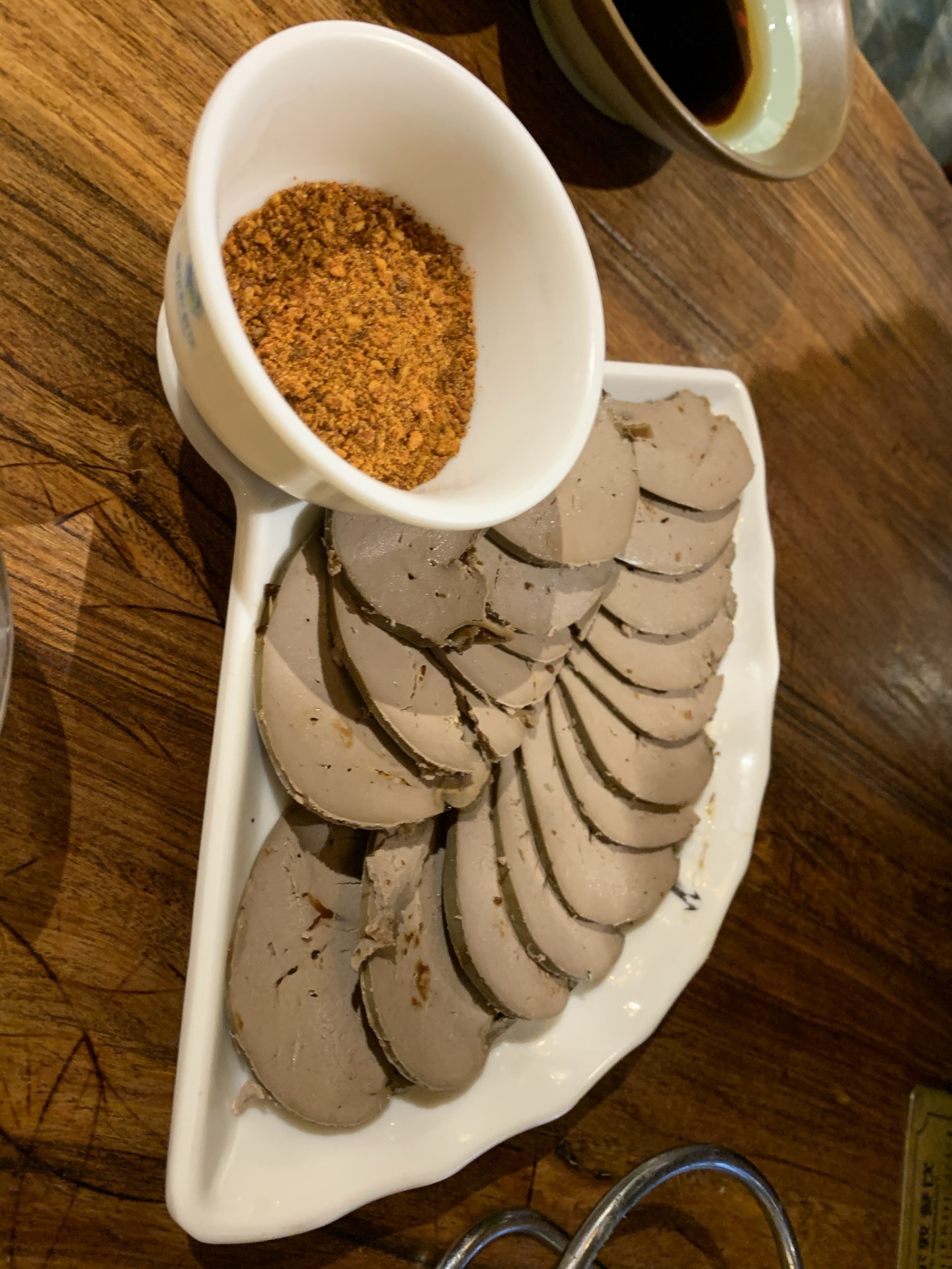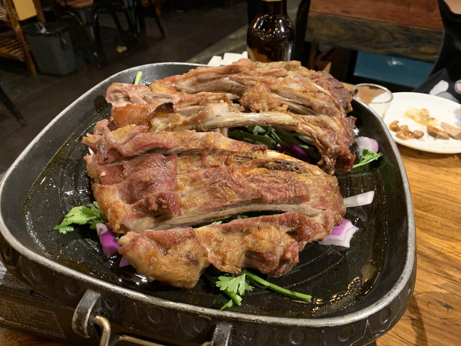 不得不说,味道非常不错,肉味很浓,羊肉没有任何的骚味,只需沾酱油吃,味道就很鲜.不像平常一些餐厅,骚得用很多的酱料都压不住. 价格已不贵,378一大圈羊肉和牛肉.我们6个人,服务员推荐了羊围脖,而且是大的,还好果断点了小的,到外面还有将近两斤是打包走的. 烤羊排也值得一尝,很香,连肥肉都很香. 羊腰还好,我不太喜欢.