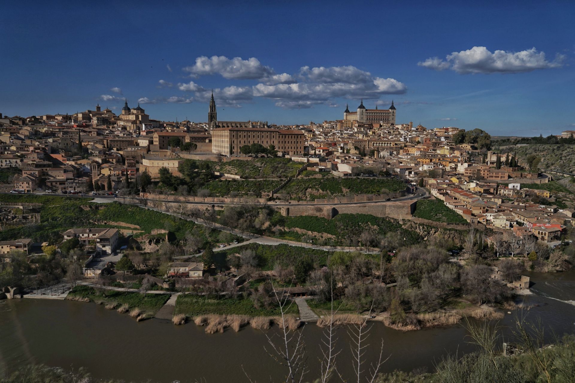 去往托莱多路上,司机走错了路,为了补偿我们,增加一个景点托莱多瞭望台。托莱多瞭望台在托莱多城外山上,山路边狭长一片空地,和托莱多城相向而对,中间是深谷,不是常见的俯视,而是平视远眺。残阳西下,相隔遥远,只能望见远处山顶上密密麻麻的房屋,唯一能辨认的是某位国王突发奇想建造的倒桌子的建筑,四条桌腿太好辨认。 司机指着路边一幢幢古色古香的房子说,有些人住在这里的宾馆中,看托莱多夜景。把夜幕下的古城挂在窗前,让璀璨华灯串起一帘幽梦,雾无限的向往,开始询问宾馆情况,司机第一句话就让雾从梦中惊醒,叁仟美元一晚,比雾整个西班牙旅程费用还贵。谁再跟雾说穷游,跟他急旅游就是奢侈品,要有足够金钱支持的。