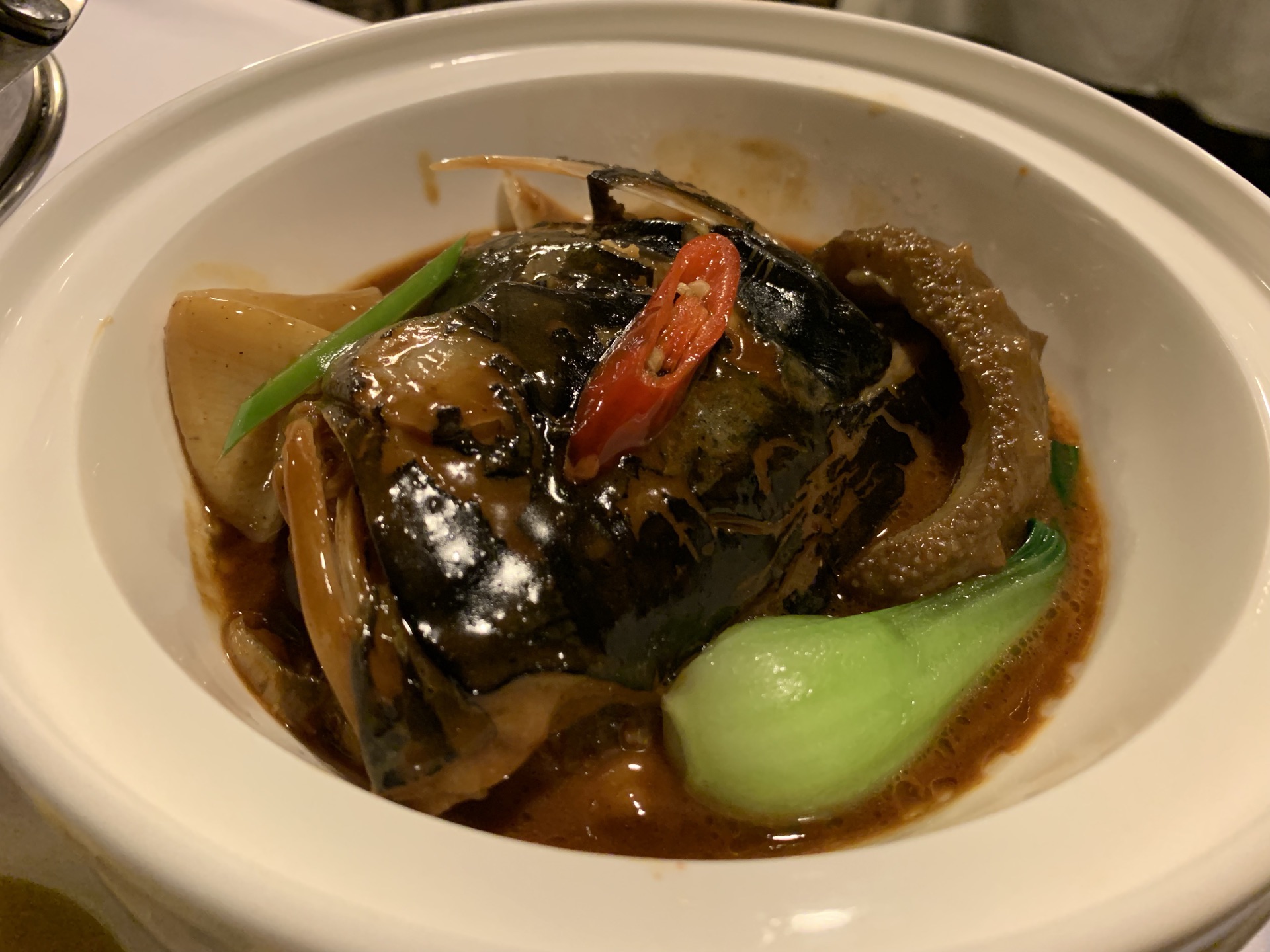 在涵田休息,下午泡了温泉后体力不支,不打算出去了,于是晚饭就选在酒店的中餐厅解决。餐厅需要加收15[%]的服务费,送壶茶,还送了个点心(菱角),熟的菱角粉粉的。 醉虾,酒的味道过浓,因为我平时不喝酒,吃了一个觉得接受不了就没再吃了。 蚌肉豆腐,汤里有黄辣椒,是微微带辣和带酸的。下面还有鸡毛菜。老豆腐带有豆腥气,就是喜欢这个味。 鱼头辽参煲,两份起点,每份半个鱼头半个辽参,也是带有微微辣,有胶原蛋白,还挺好吃的,就是价格不便宜。
