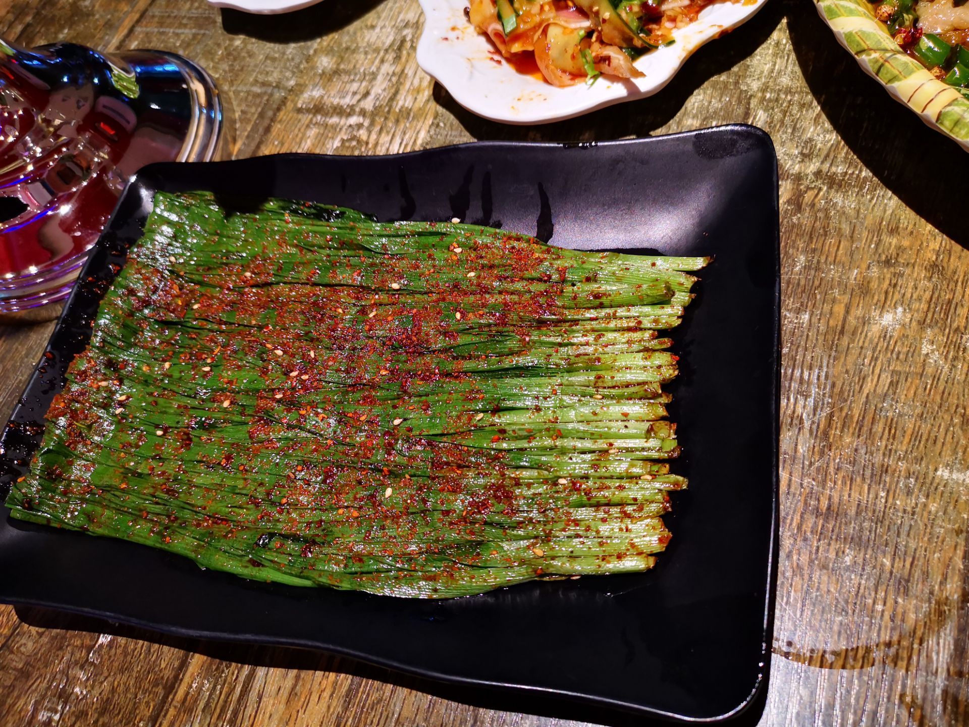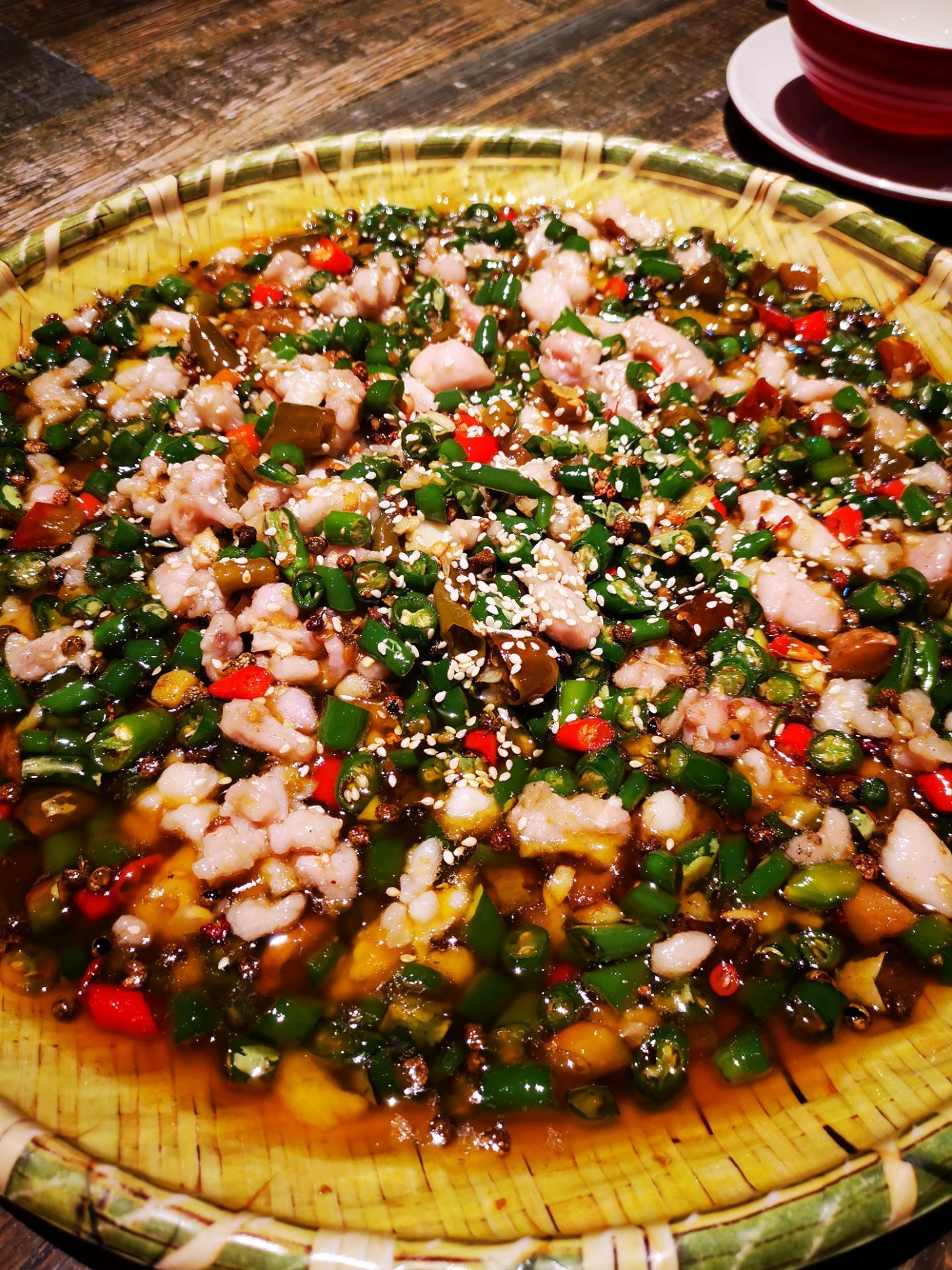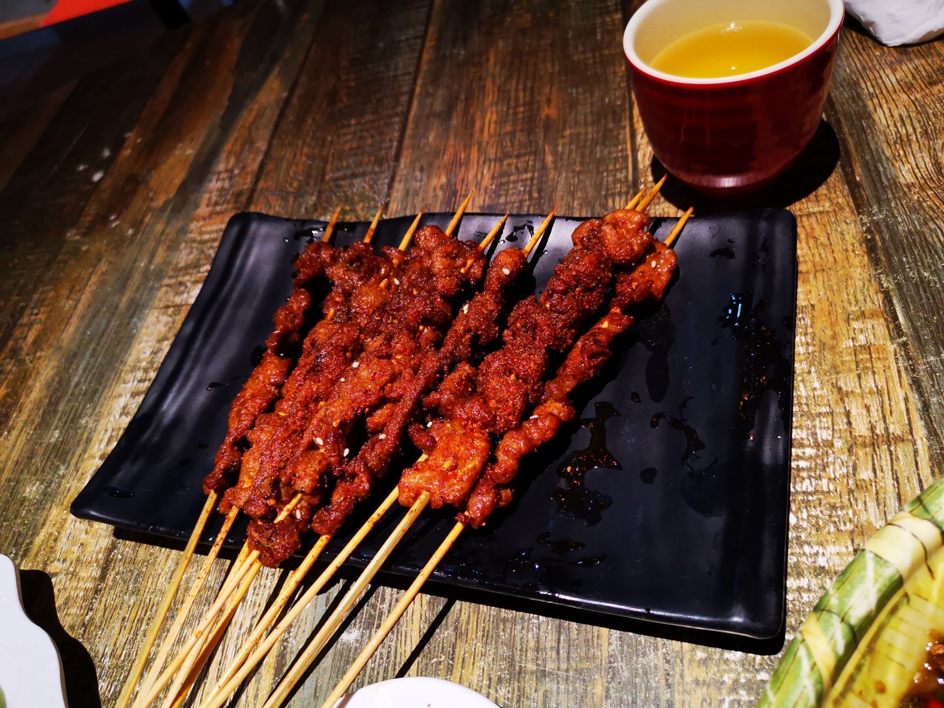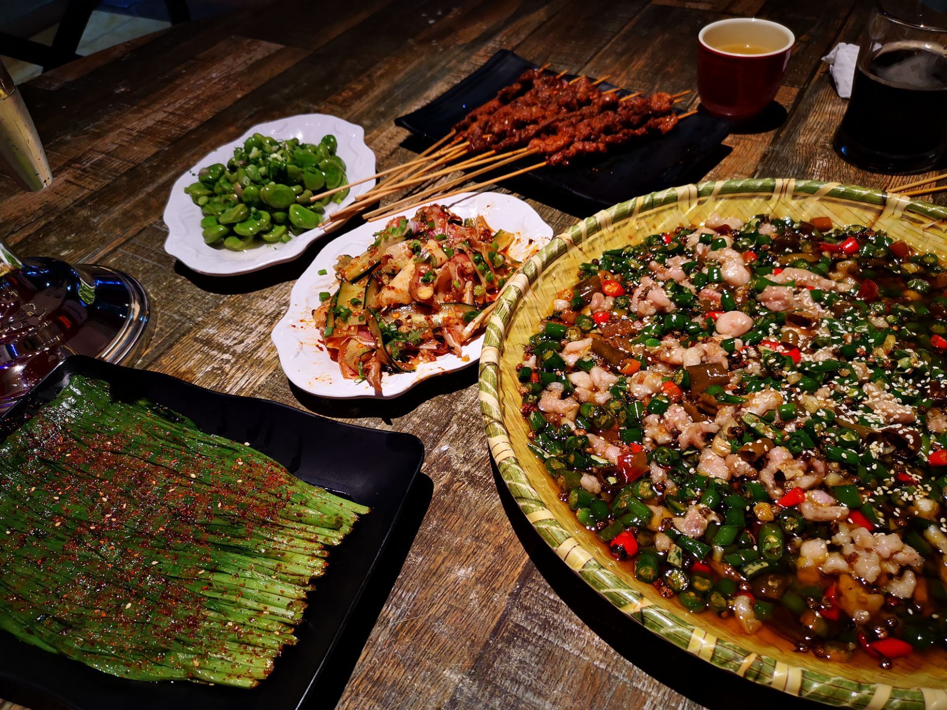 ...几个菜,秘汁肉串,烤韭菜,红油猪儿,蚕豆,大大的一盘霸王兔是主角,麻辣鲜香,兔肉小小块,很入味