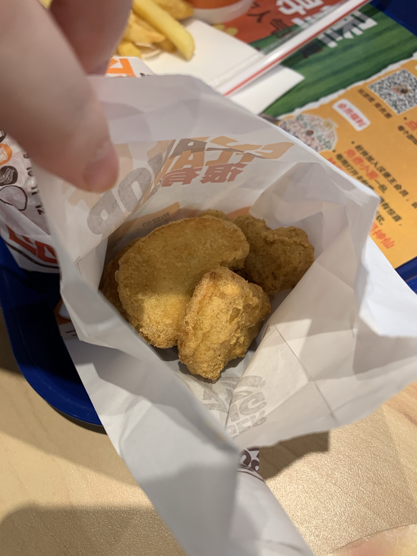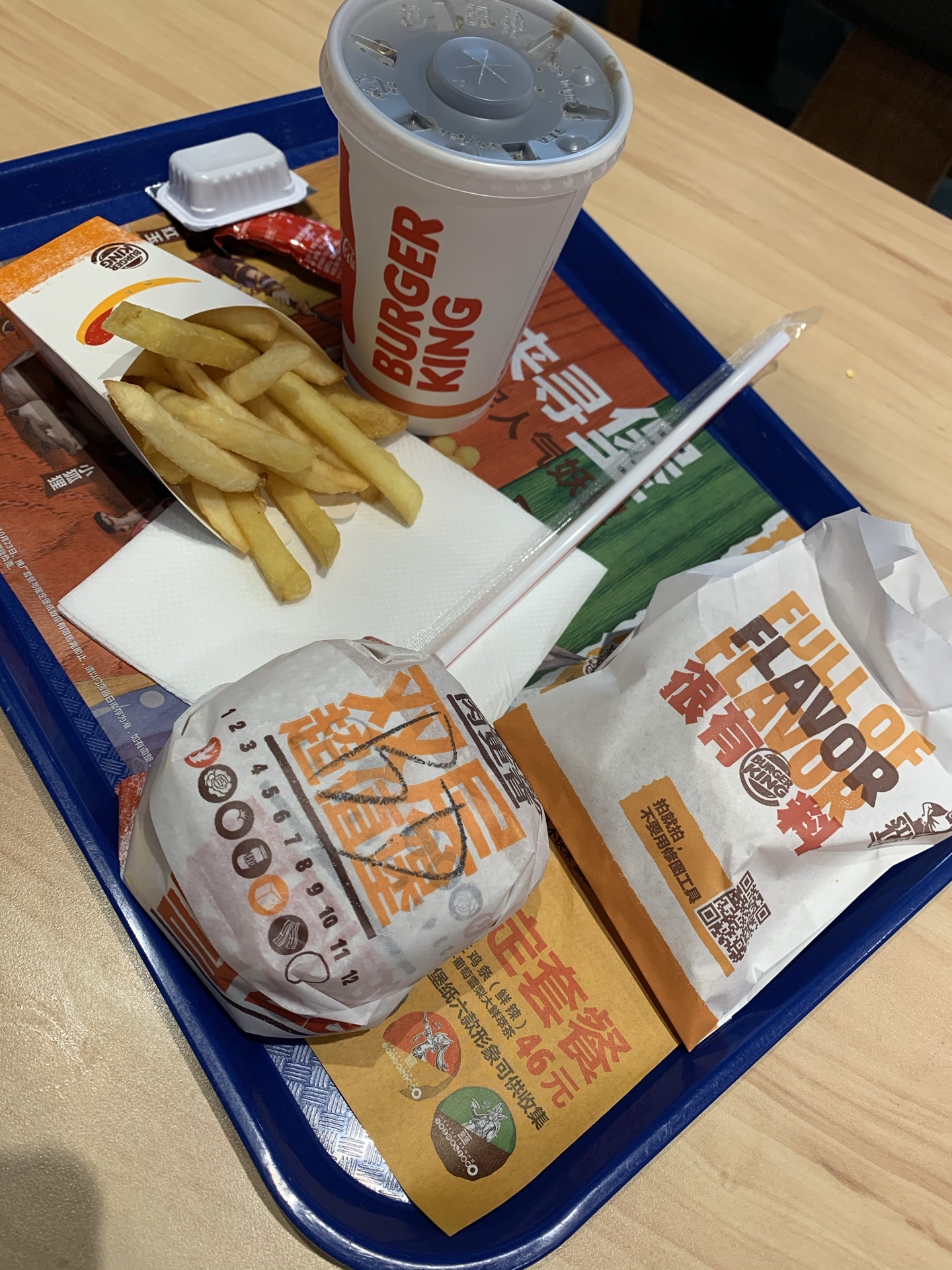 第一次到D32的汉堡王来,店里面的自助机和扫码都不能点餐,只能到人工收银台去,感觉有一点不方便,点了一份套餐,里面有一个汉堡,一杯饮料加上一包薯条,汉堡的味道一般般,其他感觉还行,感觉性价比还是比较高的。
