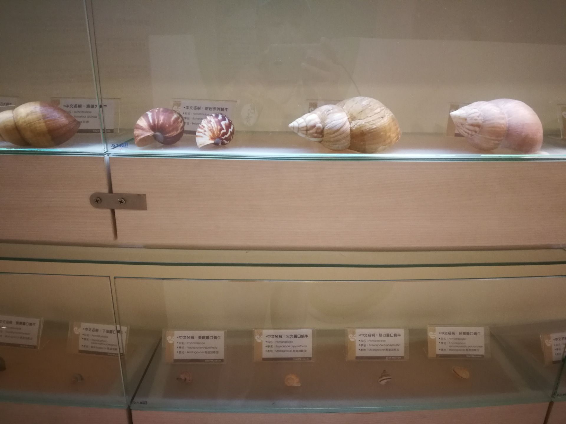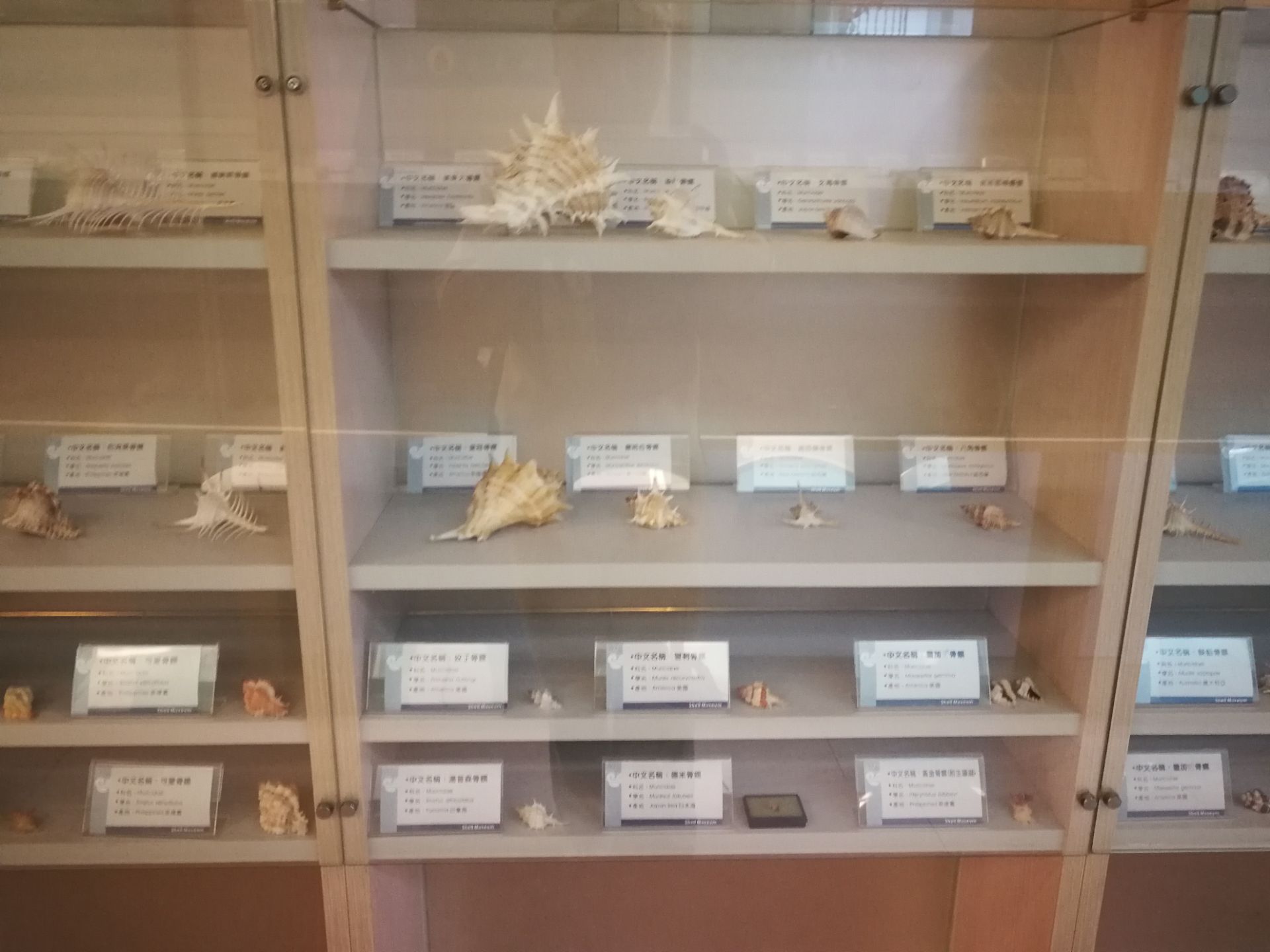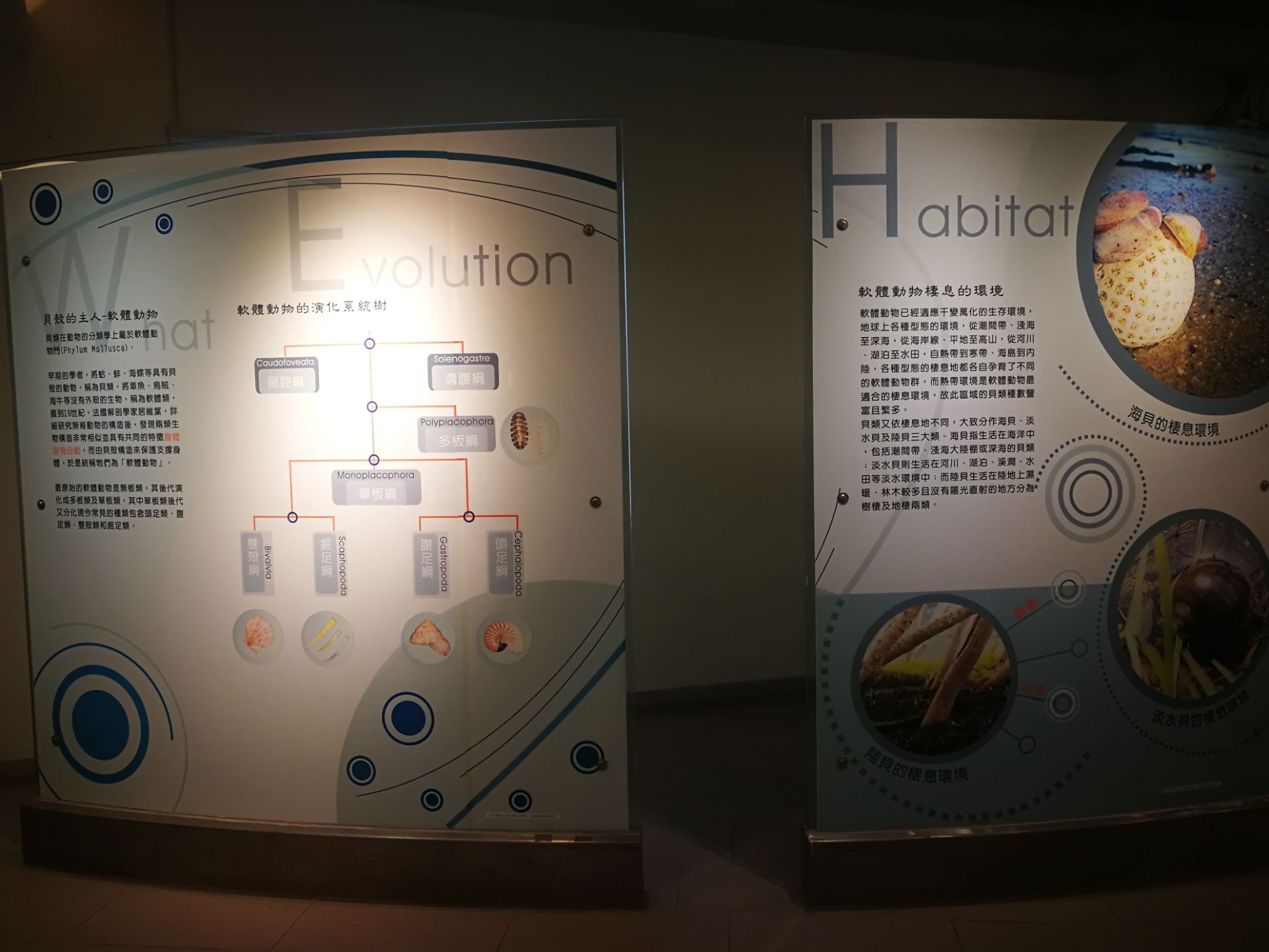 馆内介绍了软体动物的知识,蛤,蚌海螺这些贝类,与章鱼乌贼等没有外壳的动物统称软体动物。双壳纲,掘足纲,头足纲,腹足纲统称单板纲,如贝和螺。 软体动物已经适应千变万化的生活环境。海贝指生活在潮间带,浅海深海的贝类。淡水贝指生活在河川湖泊溪涧水田等淡水环境的贝类。陆贝是生活在湿地林木树栖地栖的贝类。 台湾的洋流有黑潮和涌潮流,让深海的养分给贝类带来了丰富营养物质,又分为,海岸贝,浅海贝,深海贝。 南北纬三十度之间,水质澄清,出现了珊瑚礁生态,让我们更好完成珊瑚的保育工作。