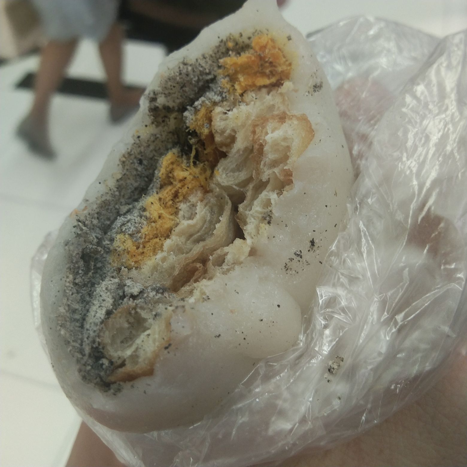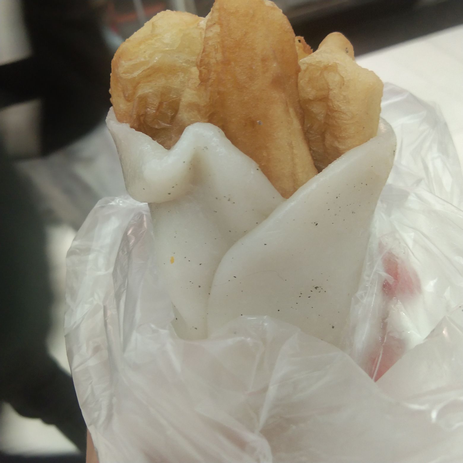 看阿姨那个年糕就揪出来很小一块啊,压的很扁的包油条了,加糖。 味道一般