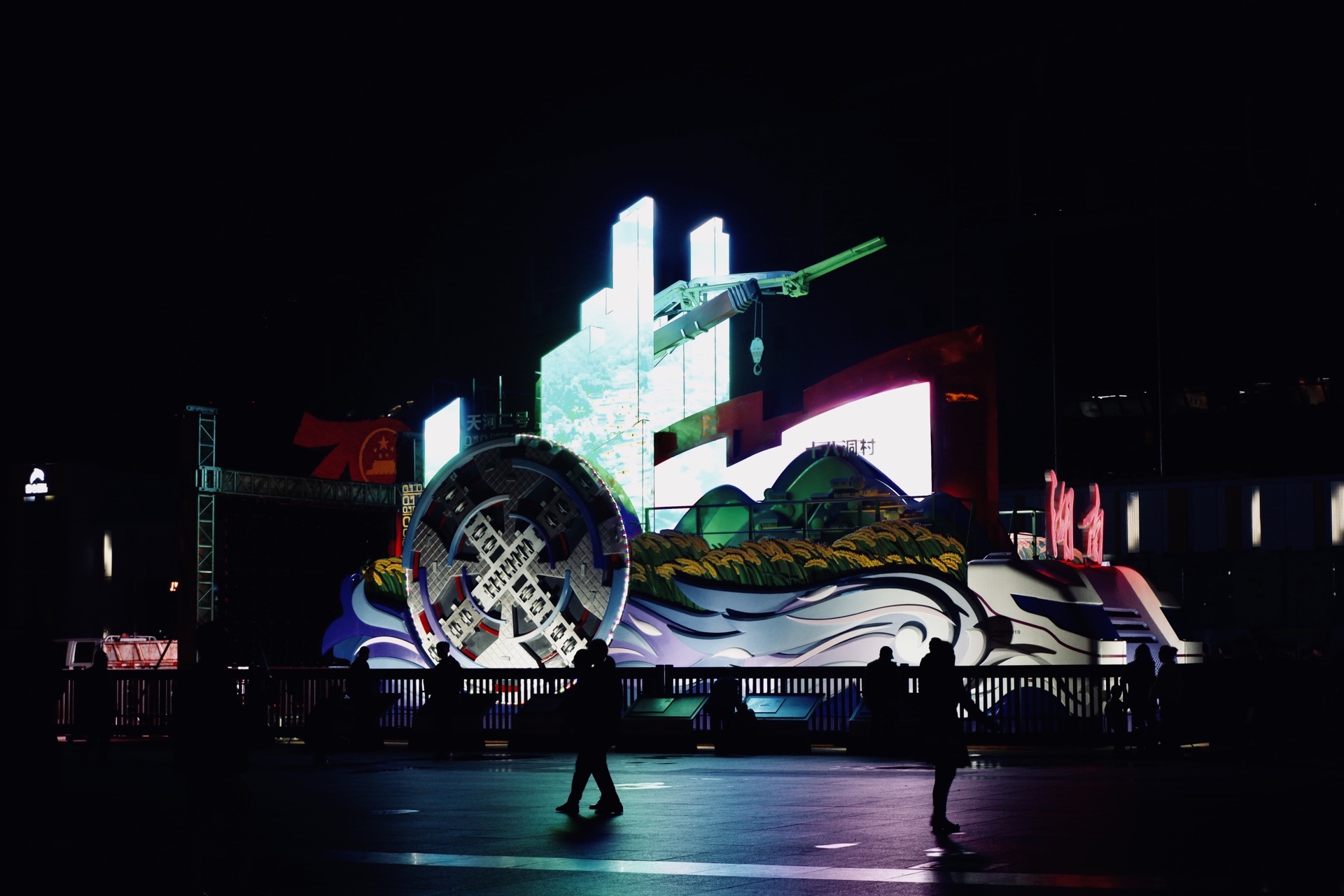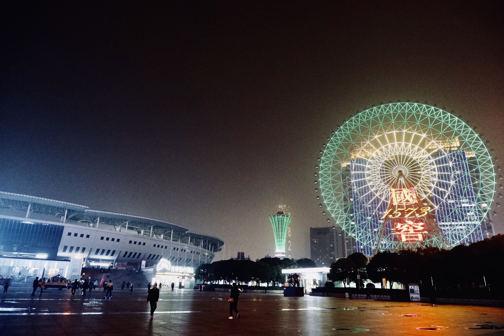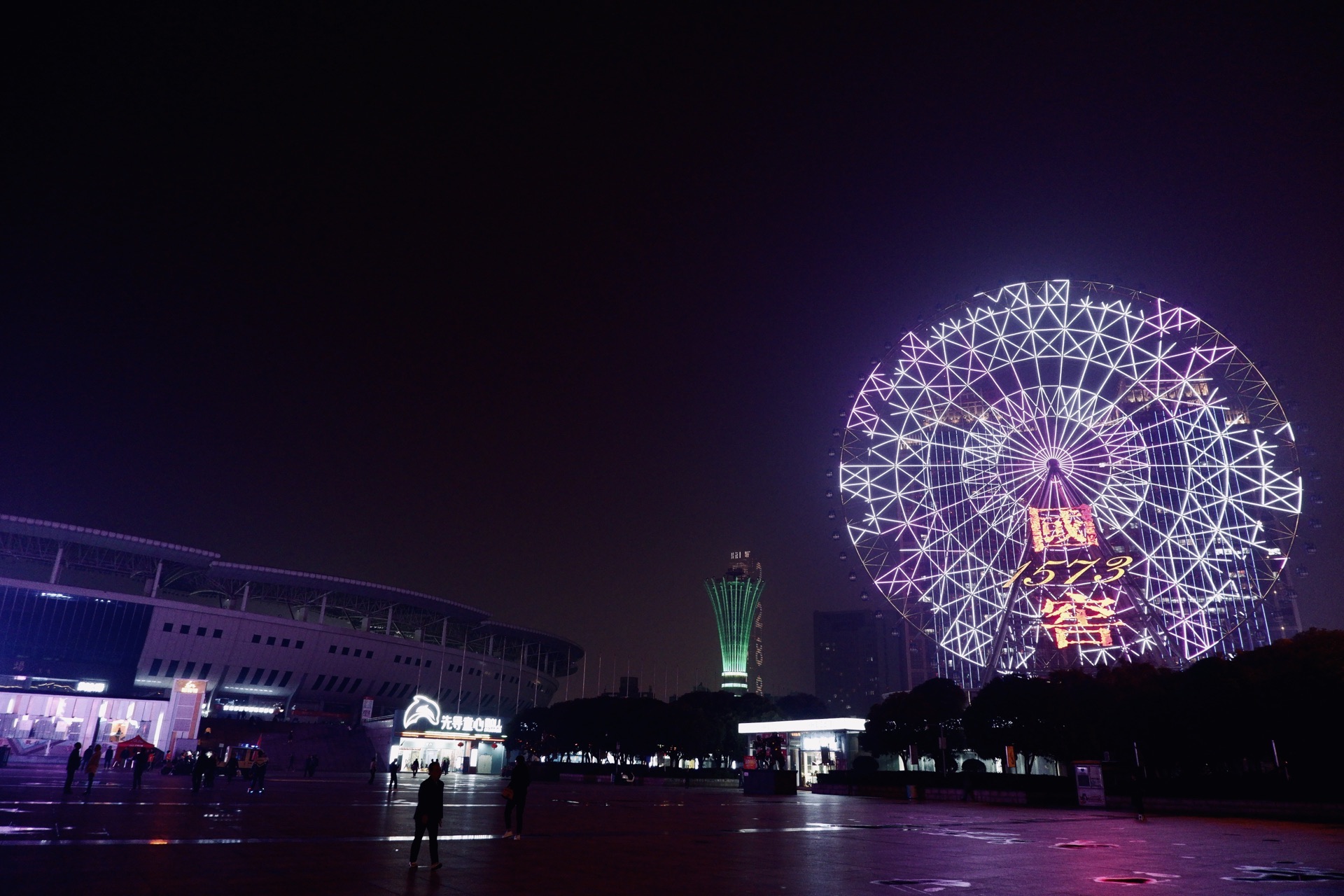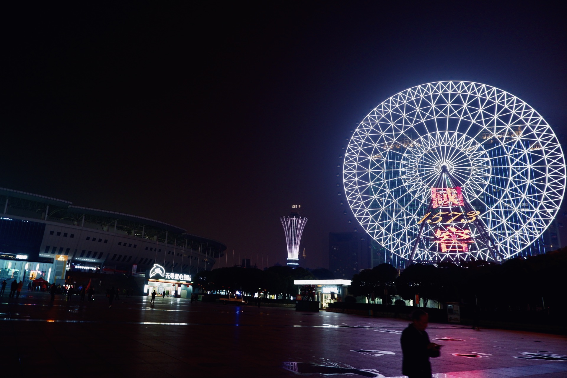 白沙广场·超级多人的整体广场舞 背靠贺龙体育场,这个白沙广场还是很大的 虽然是晚上过来 没想到的是人气那么高涨 这里和全国的广场一样 聚集了一大波跳舞的广场大妈 但是这里貌似算是我第一次看到那么多人穿着一样的服饰跳着同一支广场舞 很震惊了啊…… 站在广场上,最具有辨识度的自然就是 屋顶的摩天轮 这里算是最有特色的建筑物了吧