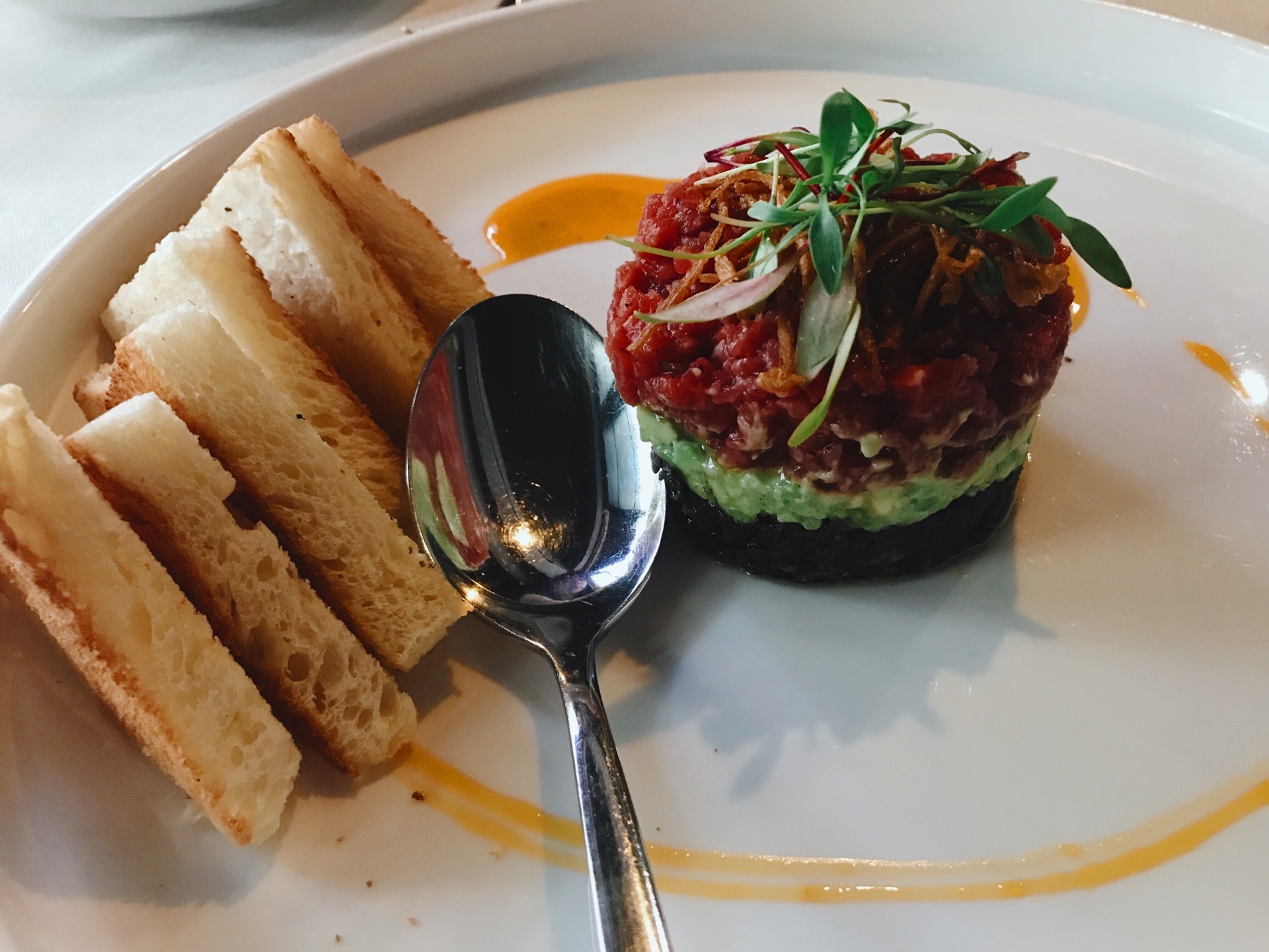 牛肉塔塔配牛油果黑橄榄酱 摆盘就很好看,上层是生牛肉碎,中间是牛油果,底层是黑橄榄,颜色分明...