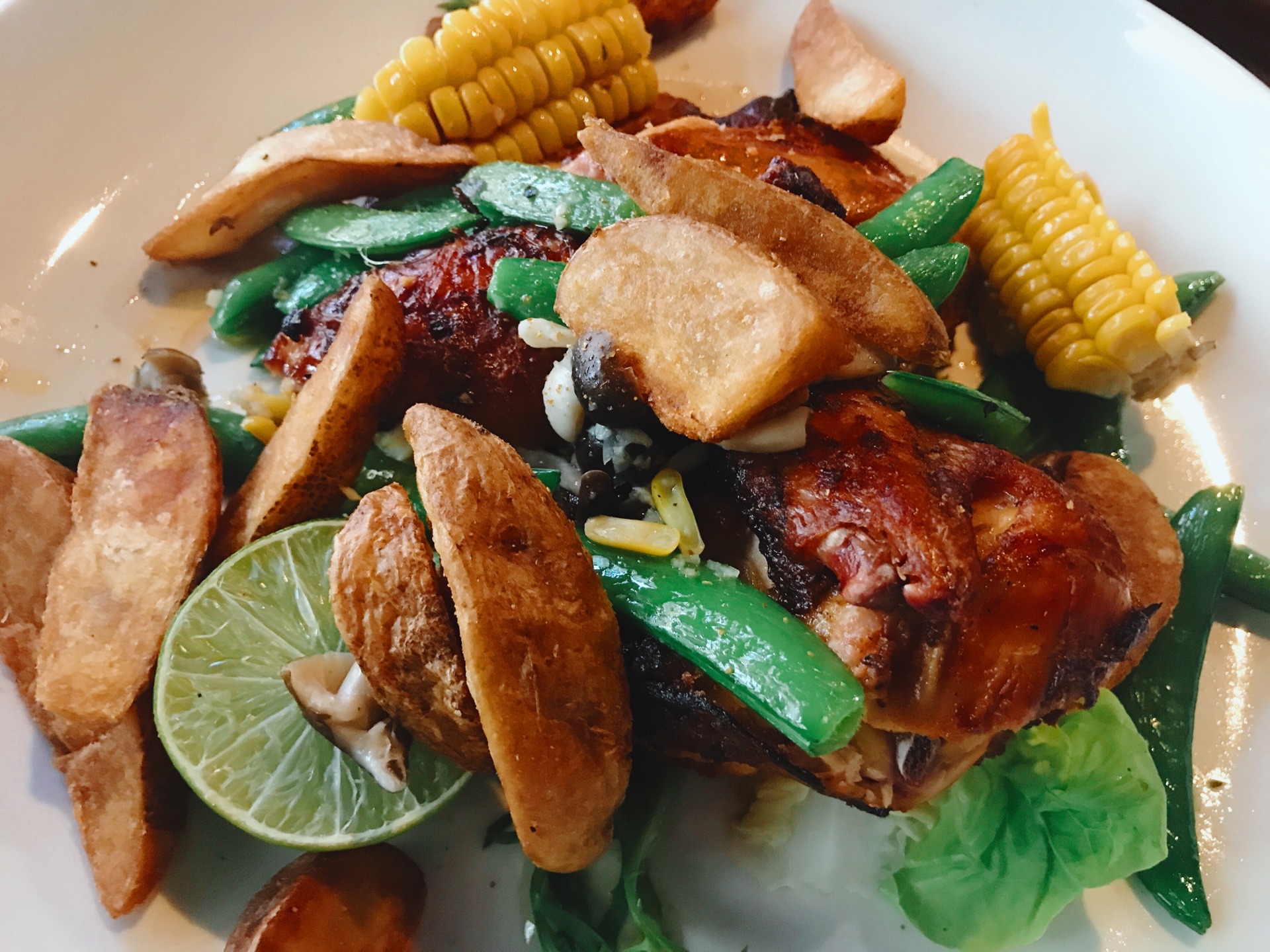这家店超有人气的,老远就看到有排队的顾客了,一定有她的特色在!一楼晚上是个小酒吧,二楼就是她家的西餐厅,座椅一对一对排列有序,桌子上都摆放着美丽的小花,背景是轻柔的爵士乐,浪漫气氛油然而生,超级适合小情侣约会啊。 服务生彬彬有礼,询问人数后安排落座并帮杯中倒水,服务很细致。 牛肉塔塔配牛油果黑橄榄酱 摆盘就很好看,上层是生牛肉碎,中间是牛油果,底层是黑橄榄,颜色分明,层层相叠,摇上一口,不知道厨师是如何做到的,口感极嫩,而且营养价值很高,配餐面包烤的很到位,脆脆的很喜欢。 烤鸡 肥嫩多汁,配菜薯角毛豆秀珍菇,使得整道菜荤素搭配得当,份量也很大。 远超期待的一顿大餐,而且性价比极高,应该就是这家人气爆表的原因吧,超赞。