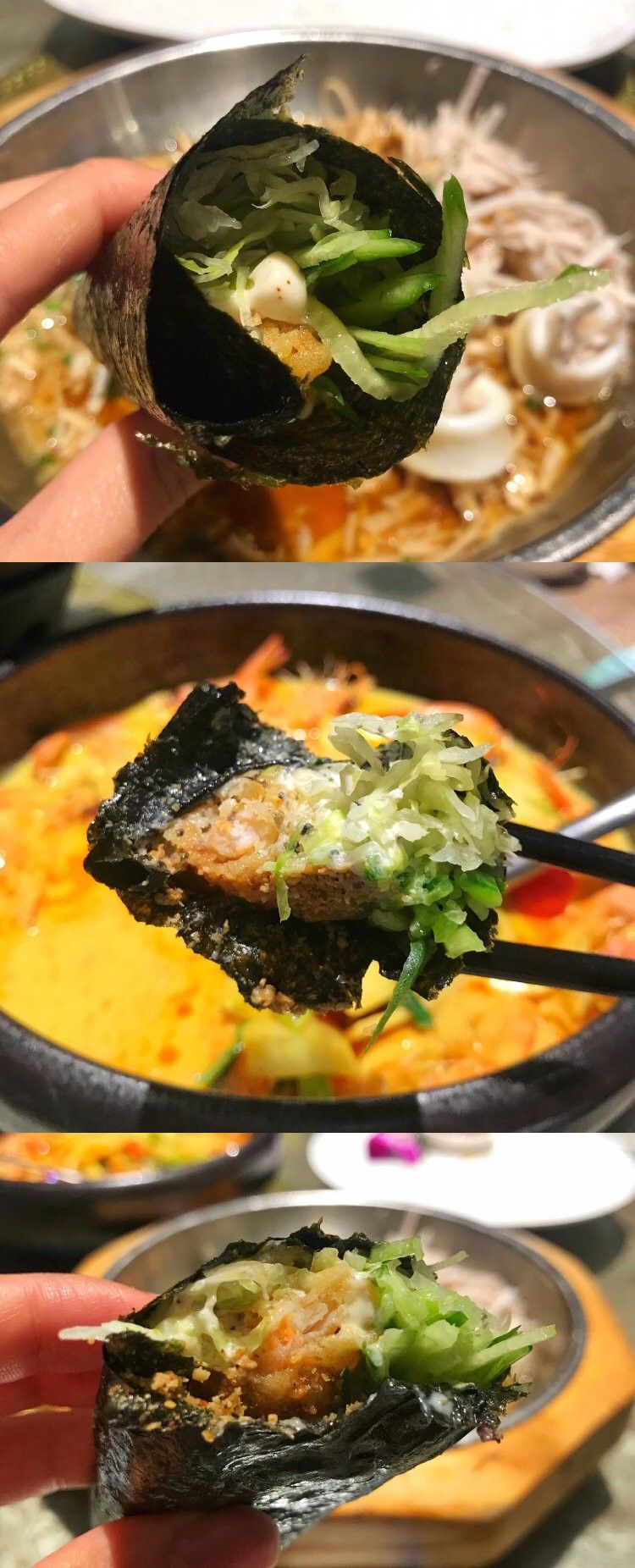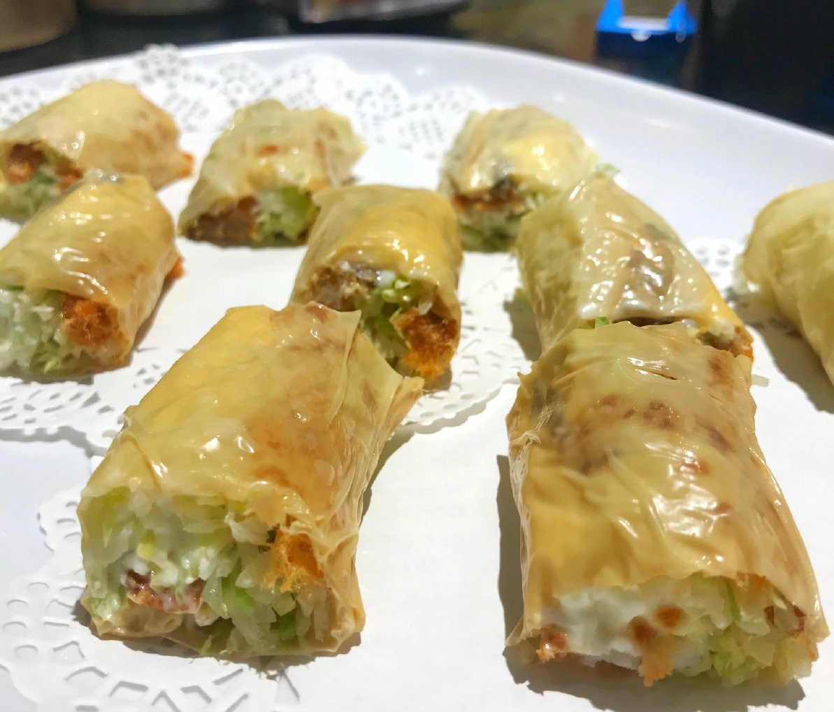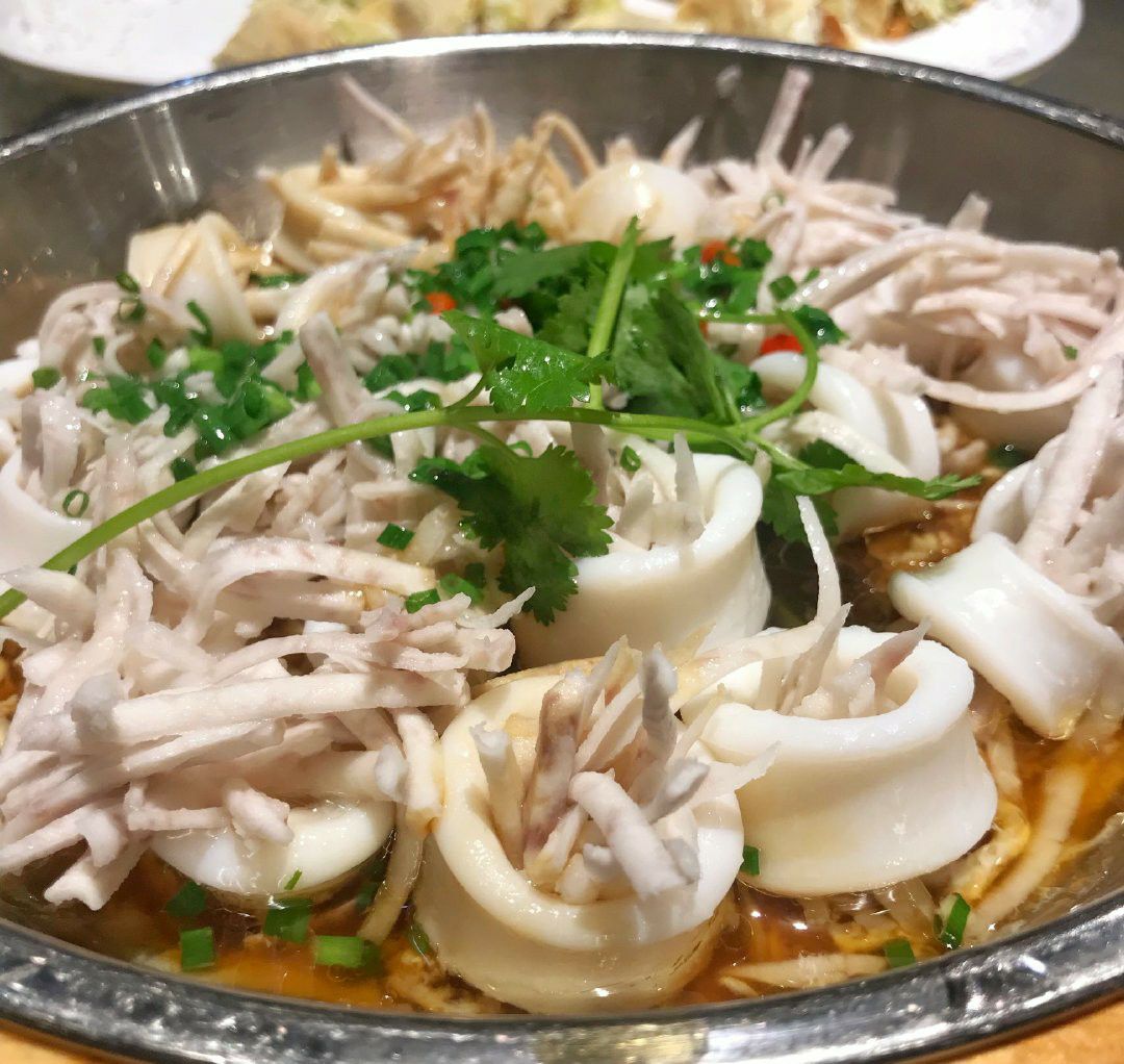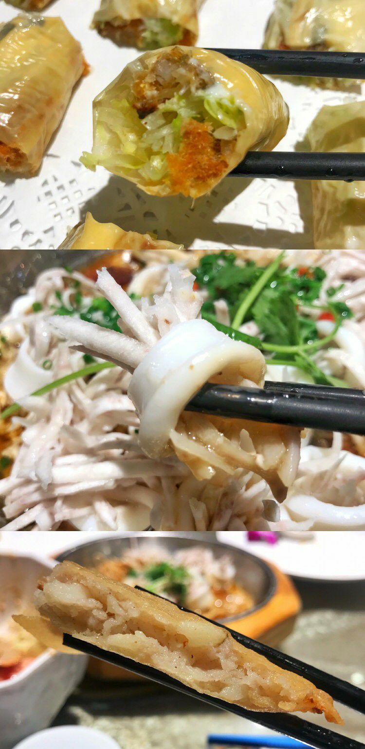 「虾排沙拉」招牌龙虾沙拉。点的小份大概六块。酱铺得满满的稍咸。满足的紧实的龙虾肉。底下的蔬菜也很爽脆。 「海鲜饼」现炸的海鲜饼。按个卖。略油。酥脆。配着厦门辣酱。馅是海鲜混合的馅料吃不出单纯的虾或鱼或别的。这道倒是感觉一般。 「蒜香深海鱼」选了66价位的鱼。一大块没有刺但肉质会稍微老一些。蒜香做法是他家特色。老板说不做清蒸那种谁家都会体现不出水准。是糖醋里脊的诱人的色泽裹着面粉的咸咸的炸鱼块。 「咖喱虾」他家咖喱也不差啊。整桌没有虾就要了虾。好大个的虾而且分量不少! 「手卷」服务员推着小推车过来一个个现做。里面有家酥脆的也不知道是什么反正挺喜欢的。也是按个点的~ 「鱿鱼芋头丝」厦门的鱿鱼真的好新鲜啊。这一大卷卷厚实鲜嫩嚼起来咯吱咯吱的。裹着最朴实的芋头丝和浇着葱油汤汁。超鲜。 「豆皮黄鱼卷」黄鱼肉不太多诶也是炸过的啦。黄瓜的味道很突出。这道冷菜不太推荐。