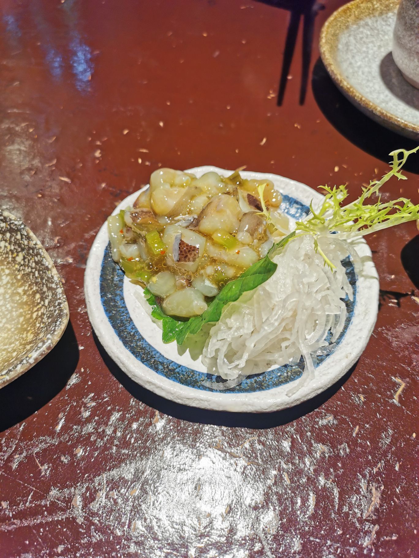 趁周三招行有50抵100的券,再来这里吃午餐。还是像上次那样,点了一份刺身拼盘,感觉比上次那份要多点,刺身都很新鲜,鱼类的刺身还是那么好吃。还点了一份前菜,芥末八爪鱼,很开胃 另外点了上次没试过的寿司:三文鱼腩寿司,一片长长的鱼腩刺身,几乎能盖住两块米饭,感觉赚到了;还有活比目鱼寿司和火炙比目鱼裙边寿司也都不错
