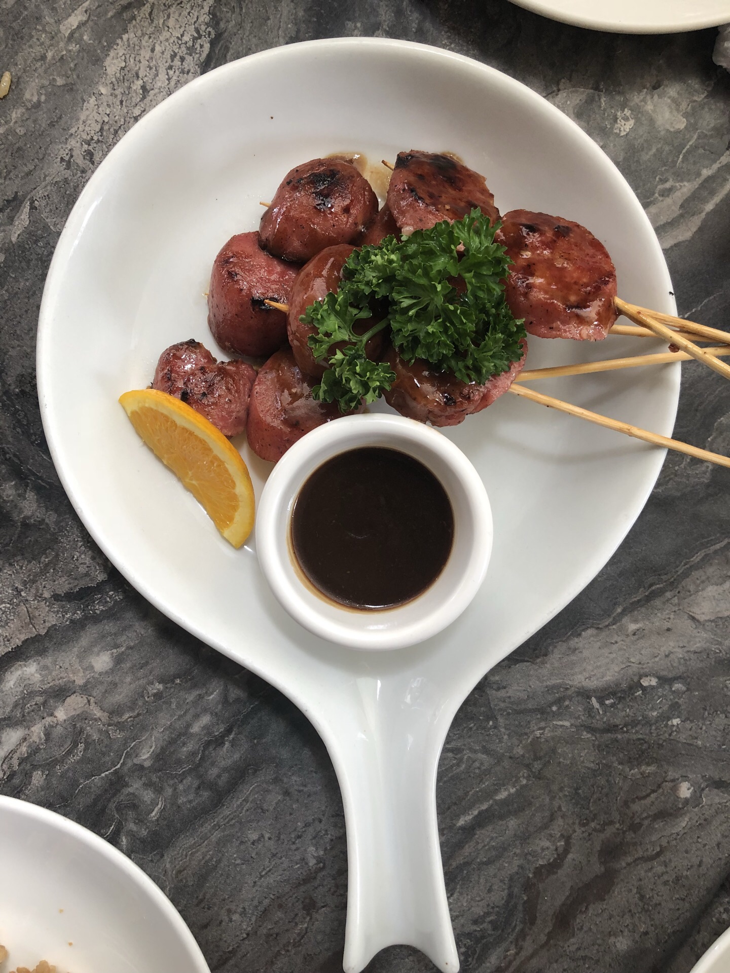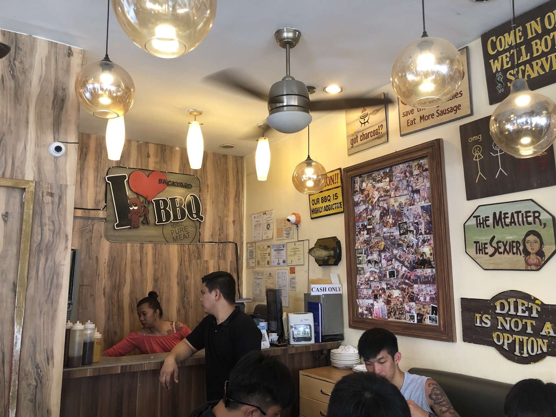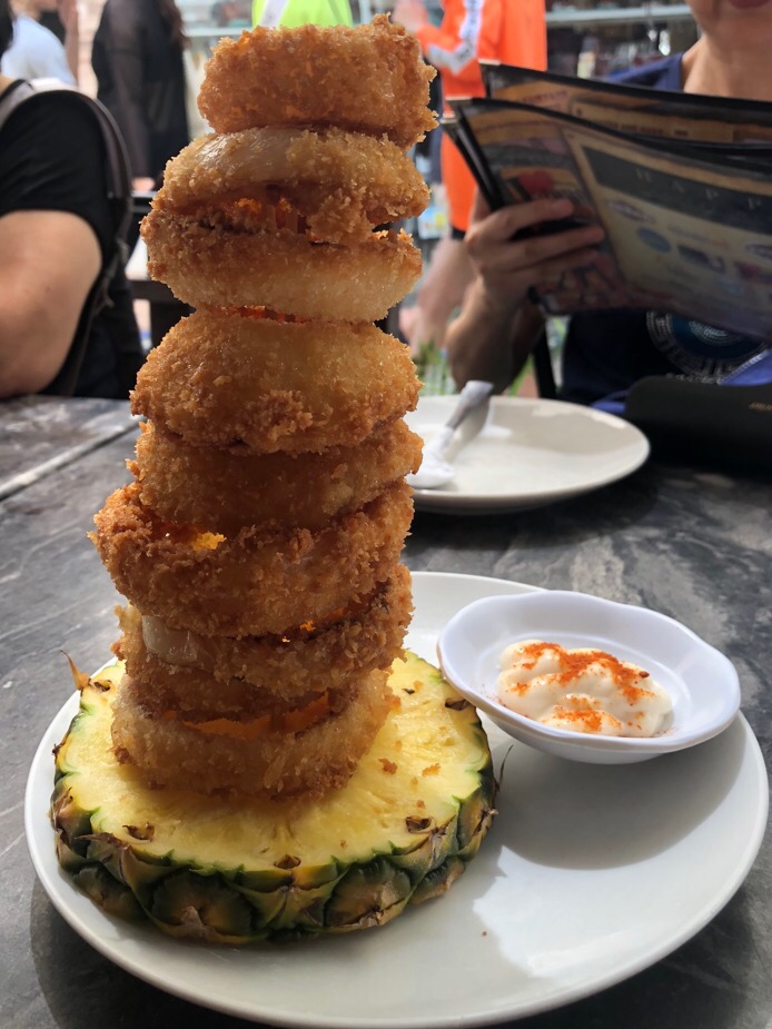 这家店是长滩岛的网红餐厅。网上介绍需要预约、排队。我们中午去的,因为是一行9人,空位不够,让我们等一二十分钟,留下等位的人,其他人继续逛周边小店。最多20分钟吧,入座点菜。当然会点推介度高的洋葱塔、蘑菇蒜香牛排、猪肋排,选了炭烤海鲜组合和有人推荐的烤香肠,还点了蔬菜沙拉,味道都不错。烤香肠甜甜软软的,喜欢。点了生力皮尔森啤酒佐餐。 必须说到的是这家菜谱有中文,好贴心。长滩岛菜谱的特色是对菜品组成、口味有简要说明,这点很不错。菜品可以算得上好吃不贵。