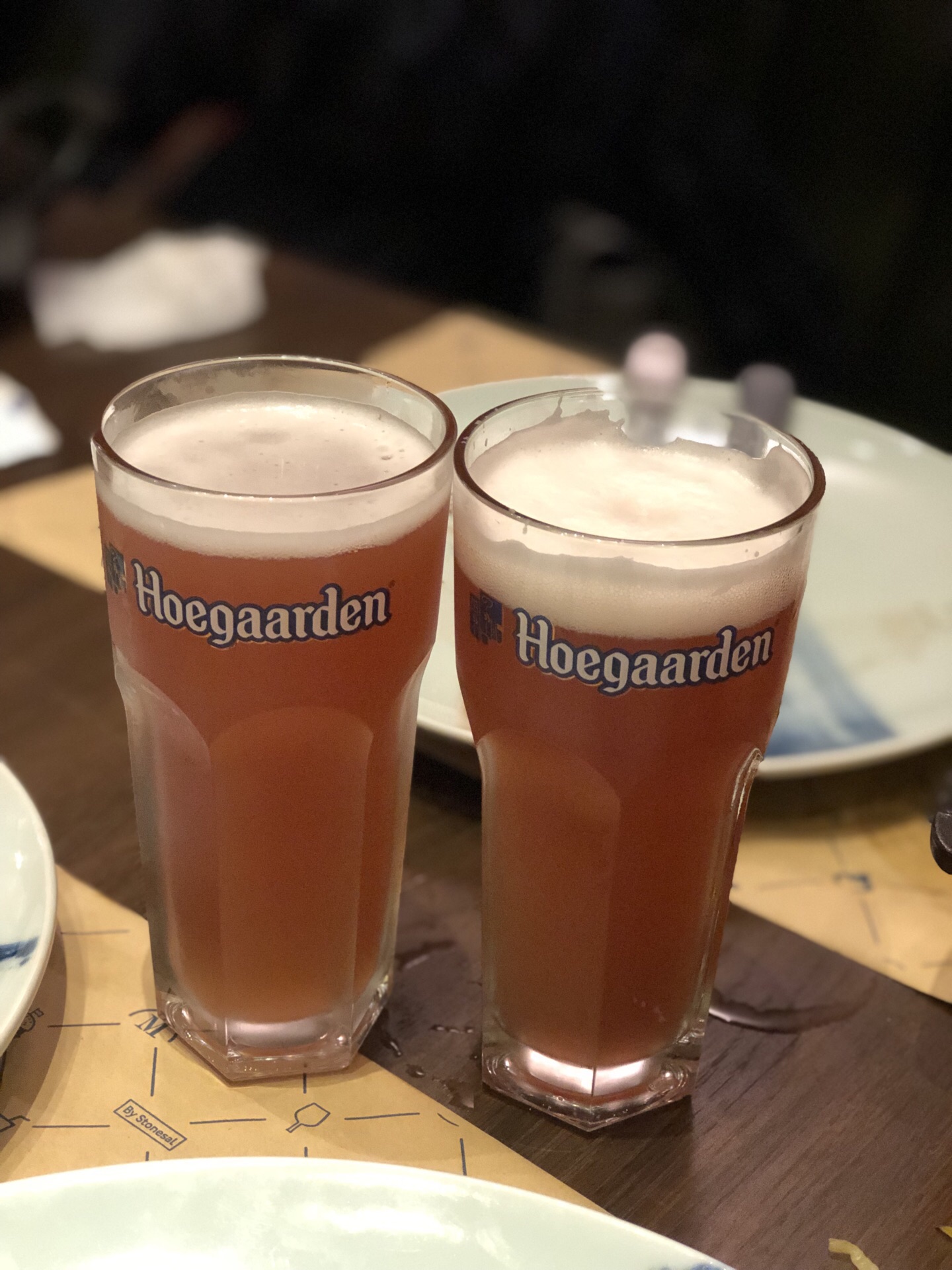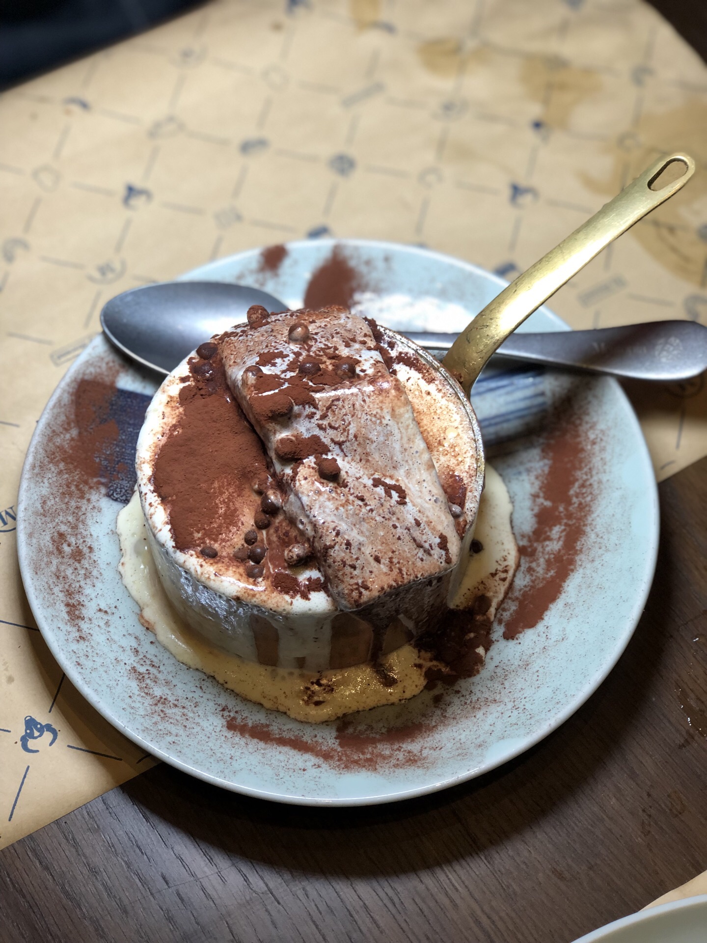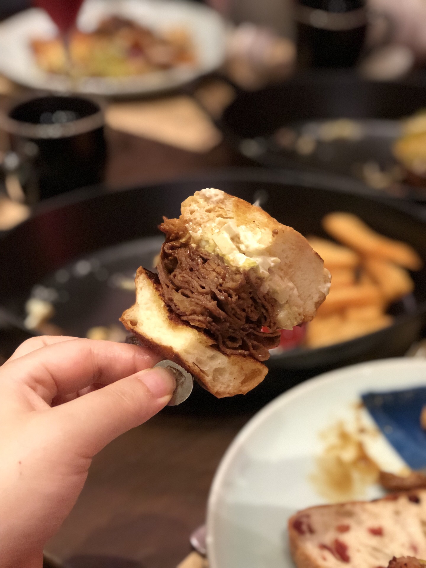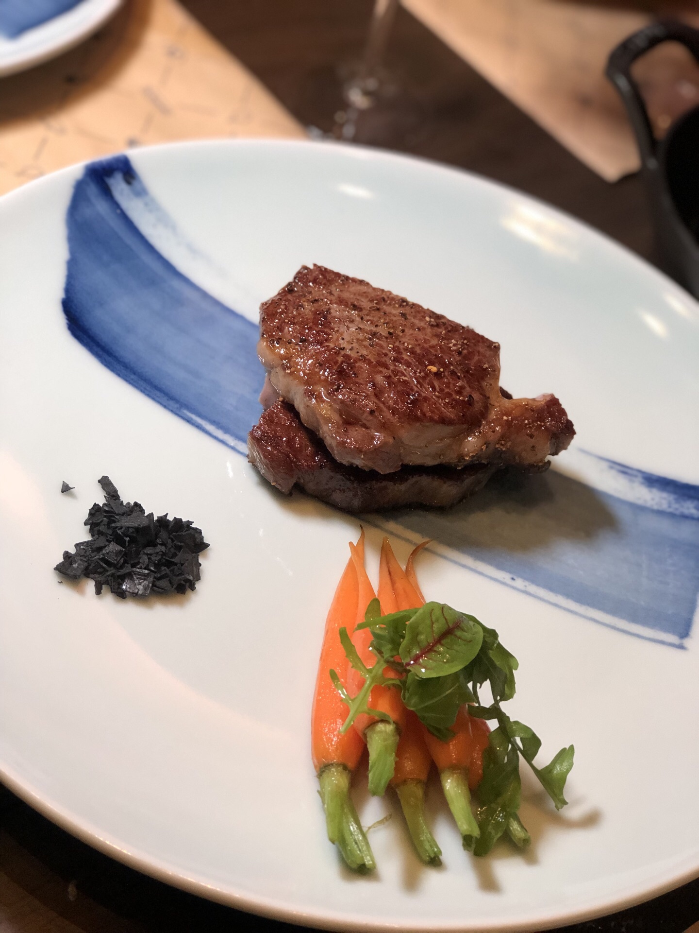 之前在东湖路上品尝过,绝对是做牛排的专家。 [环境]店里各种各样的的牛排会挂在橱窗里展示出来,就在正大广场后面,滨江旁,还是喝酒的好地方。 [服务]服务员还会把要烹饪的牛排展示给我们欣赏,好美腻呀,文理也很漂亮。 点了颜值很高的玫瑰鸡尾酒,搭配M5+顶级肉眼,5分熟刚刚好,肉色美丽,香气四溢,吃起来口感很好。 还点了|薄切牛胸肉汉堡^很特别哦,其他地方没见过。汁水很丰富,里面的秋天也很好吃呢。 甜品点了招牌|胖仙女的暗黑朗姆酒面包布丁^巧克力味道很浓,面包软软的,好吃