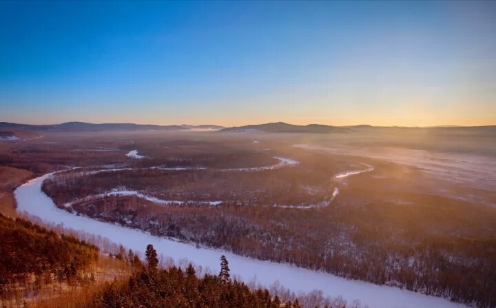 内蒙古大兴安岭西麓、额尔古纳河畔奇乾村。奇乾三面环山,一面临水,森林密布,水草丰美,是蒙古族先祖躲避战乱,休养生息的好地方。 奇乾村犹如一个童话世界一般。草地、小木屋、屋前的木栅栏,房间里都是木头的,屋顶、墙壁、地板,桌子、床,全都是没有上漆的木头。 秋日的奇乾村景色令人震撼,雾与霜结合在一起,到处都是白茫茫的一片,那样的安详与静谧。
