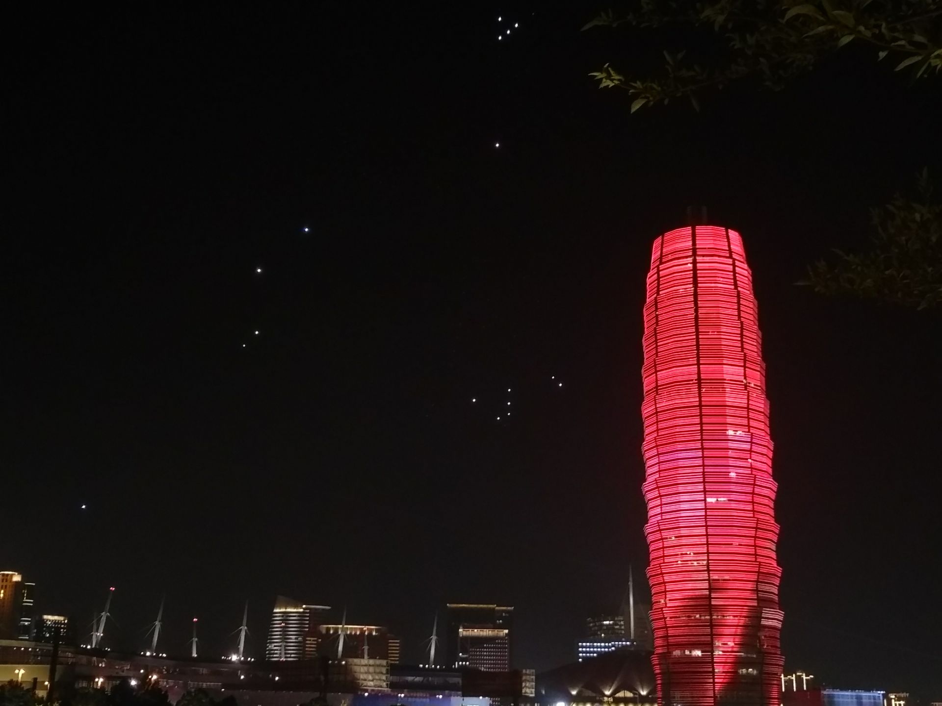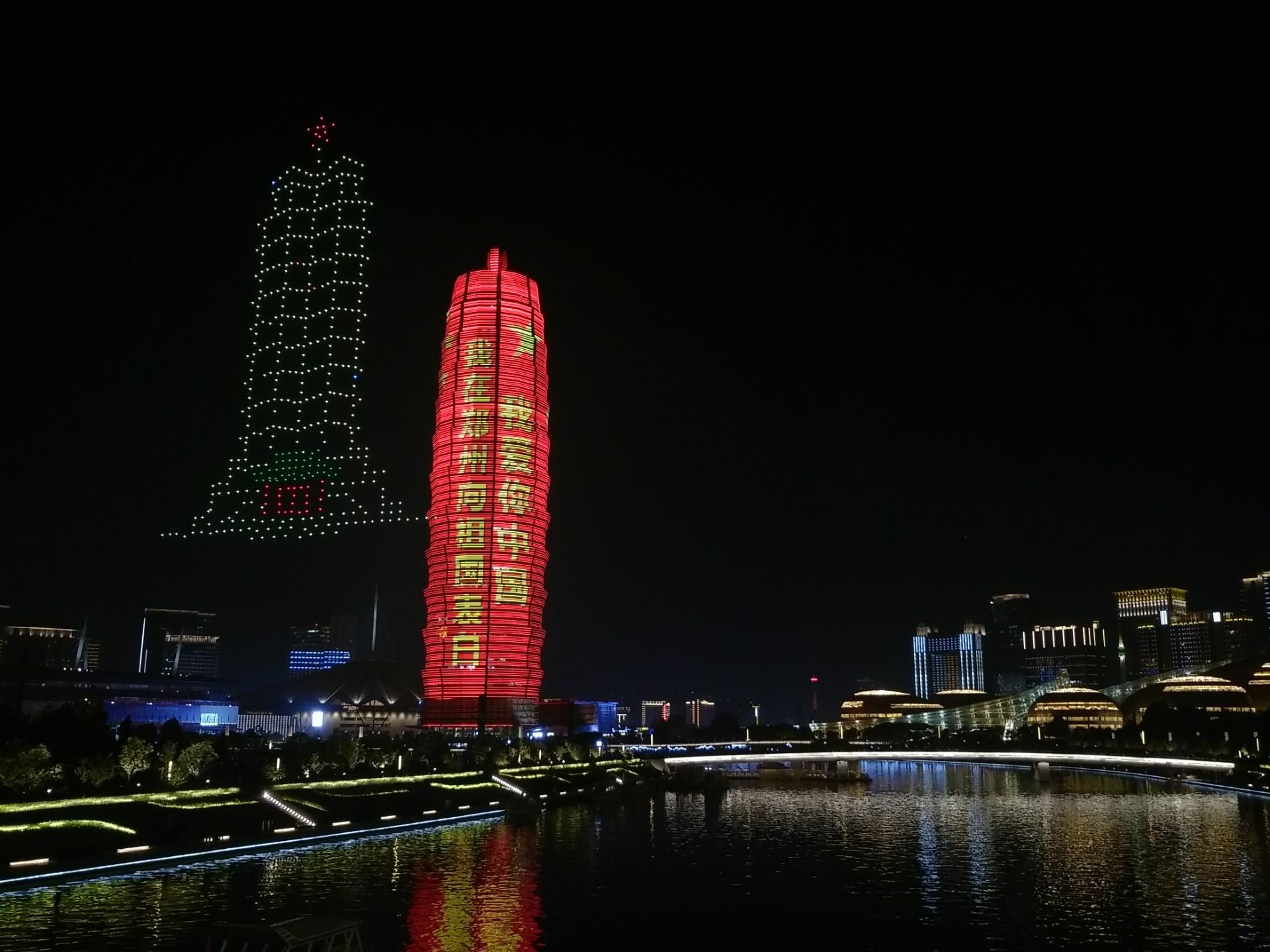 平日的夜晚来到如意湖,仅仅能够看到大玉米和会展中心以及艺术文化中心的灯光秀。而这一次正好在国庆的时间来到这边,有特殊的表演安排,而这个特殊的表演安排并没有向外公布。幸运的我正好遇上了,看到了这么多无人机,在天空画出了27纪念塔以及其他的特殊形状,为如意湖景区增添了另外一份色彩。