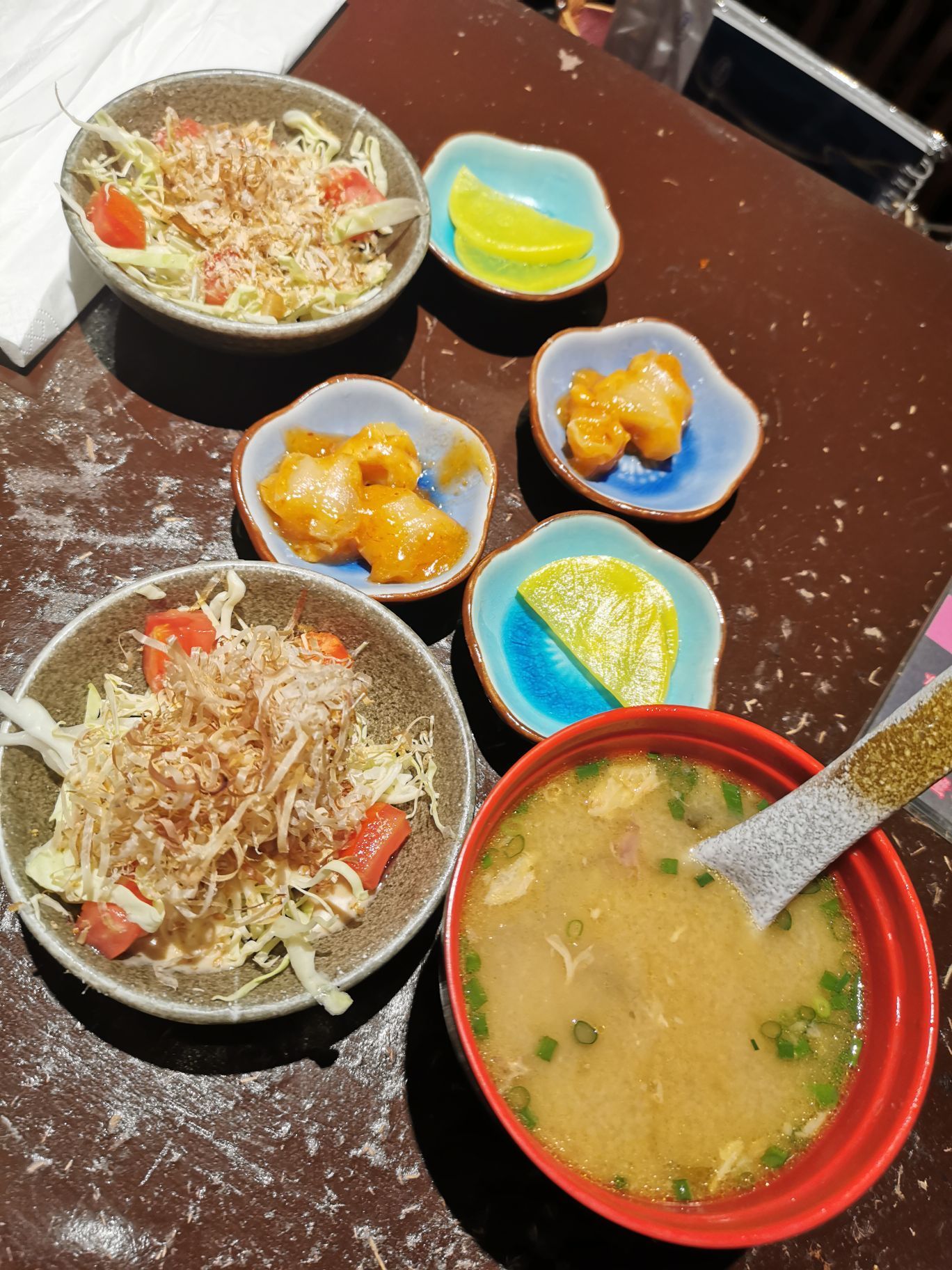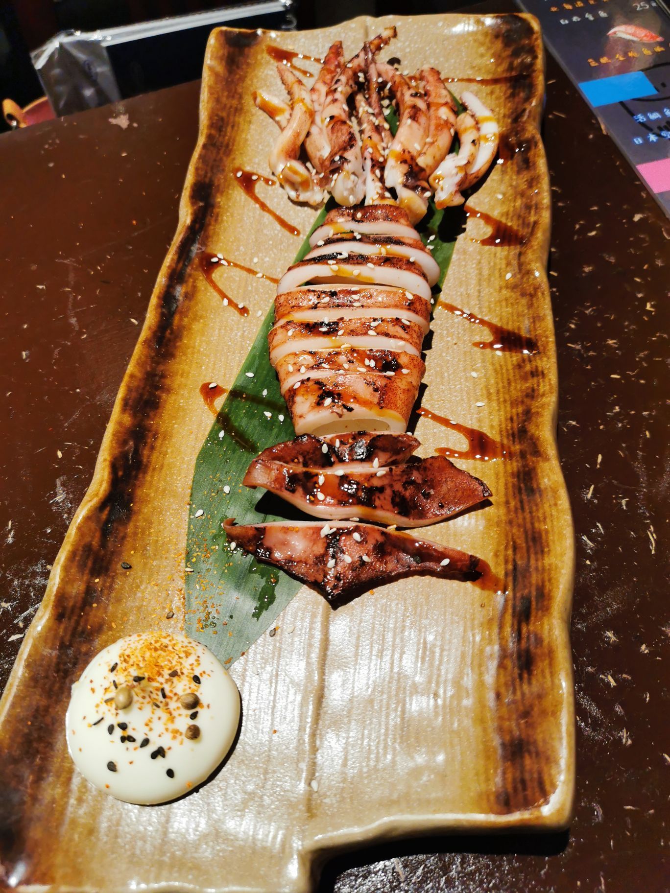 之前一直点刺身和寿司,没点过定食,这次试定食,出品也没让人失望。定食配沙拉、螺肉,酸萝卜和味噌汤。沙拉和螺肉都很好吃,还要特别说一下味噌汤,都是用三文鱼熬的哦 地狱拉面定食:有点微辣,但辣度刚好,面也很好吃,有猪肉、笋片和溏心蛋。很好吃,推荐 蒲烧鳗鱼定食:两片厚厚的鳗鱼,入口口感很好,难怪那么多人推荐 烤鱿鱼:个人觉得一般,很难做到入味,而且感觉好像有点沙