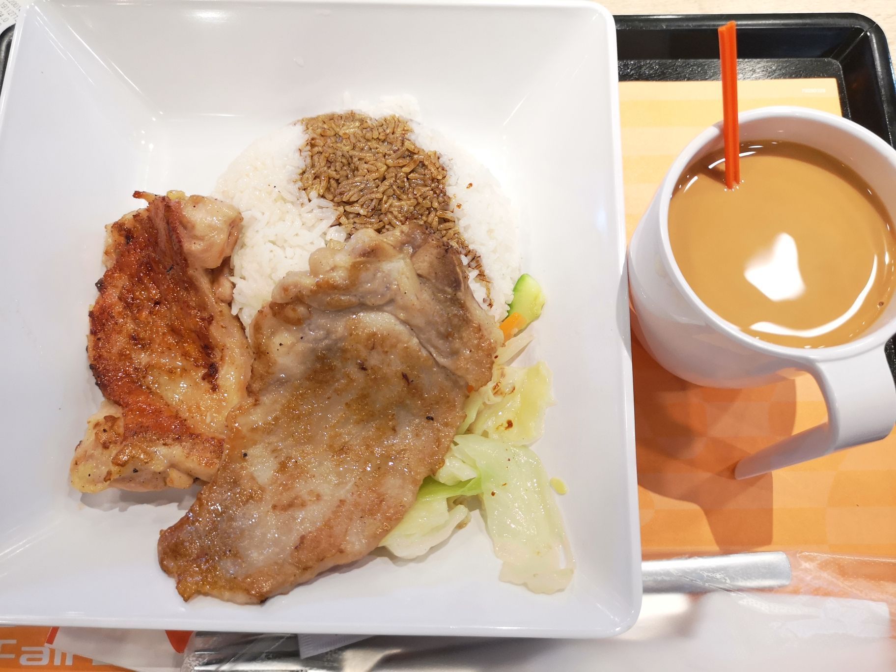 公园前地铁站的动漫星城店在负层,中午吃饭时间还很多人的,还好我过了时间来吃,有位置坐公园前地铁站的动漫星城店在负层,中午吃饭时间还很多人的,还好我过了时间来吃,有位置坐。点了一个双拼的饭,鸡扒配猪扒,肉的味道还不错份量也算多,够一个人吃,不过菜比之前吃的少,配的奶茶还不错,糖需要自己放。