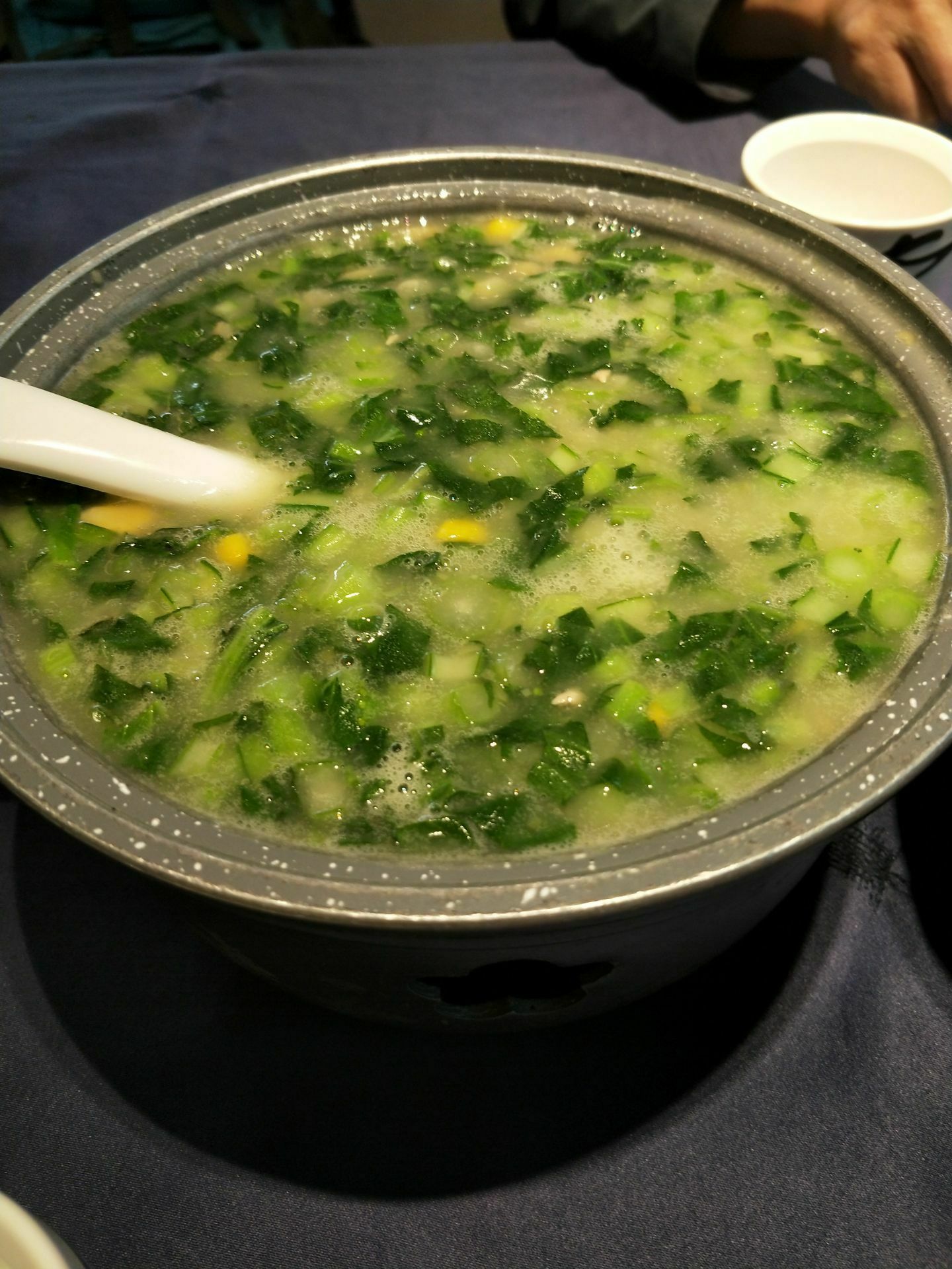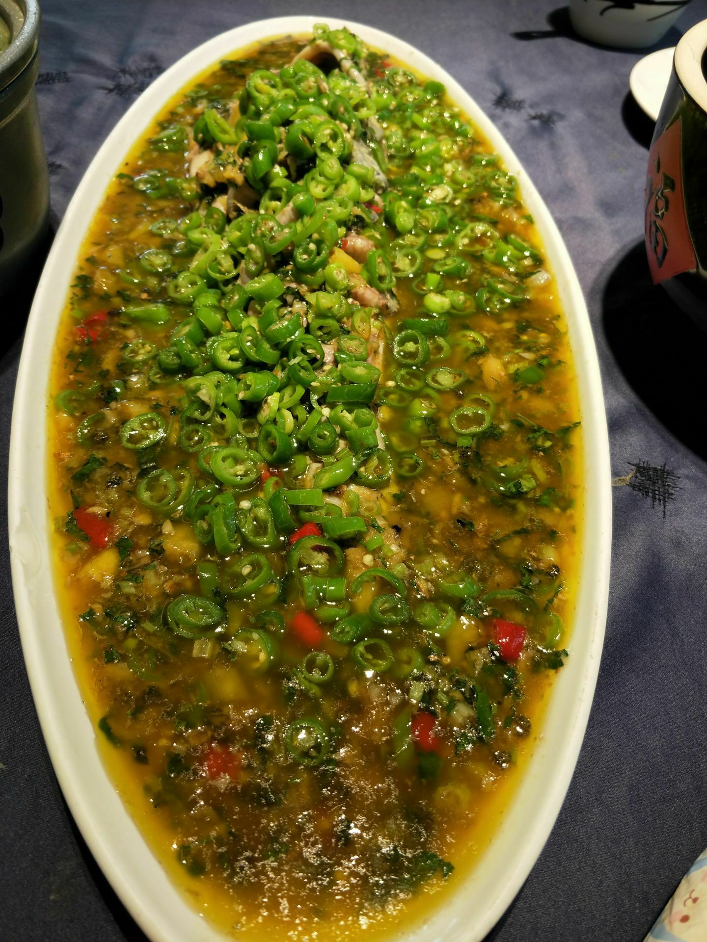 宾馆附近的餐馆吃腻了,所以换到这边来吃点河鲜。 大概是工作日中午,用餐的客人不多,按照网上推荐点了一二三,不过点菜有些失败,既点了泡饭又点了汤,水太多了,虽然味道不错,但也喝不了这么多汤。青椒江团,虽然厚厚的一层辣椒,但是吃上去不是特别辣,却很鲜美,鱼肉也很嫩。