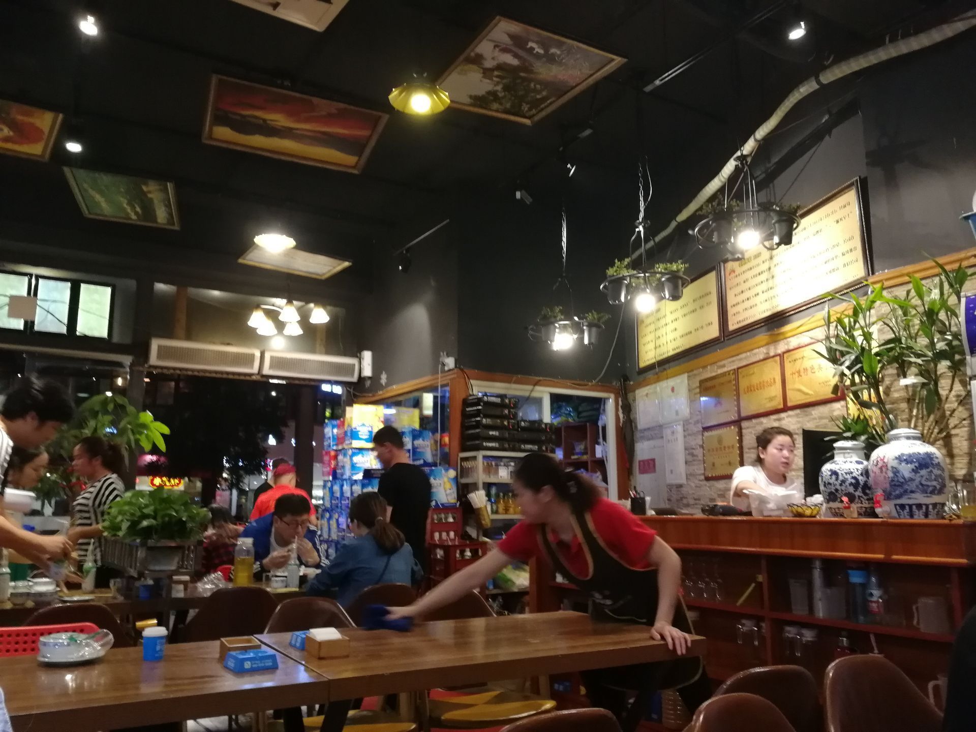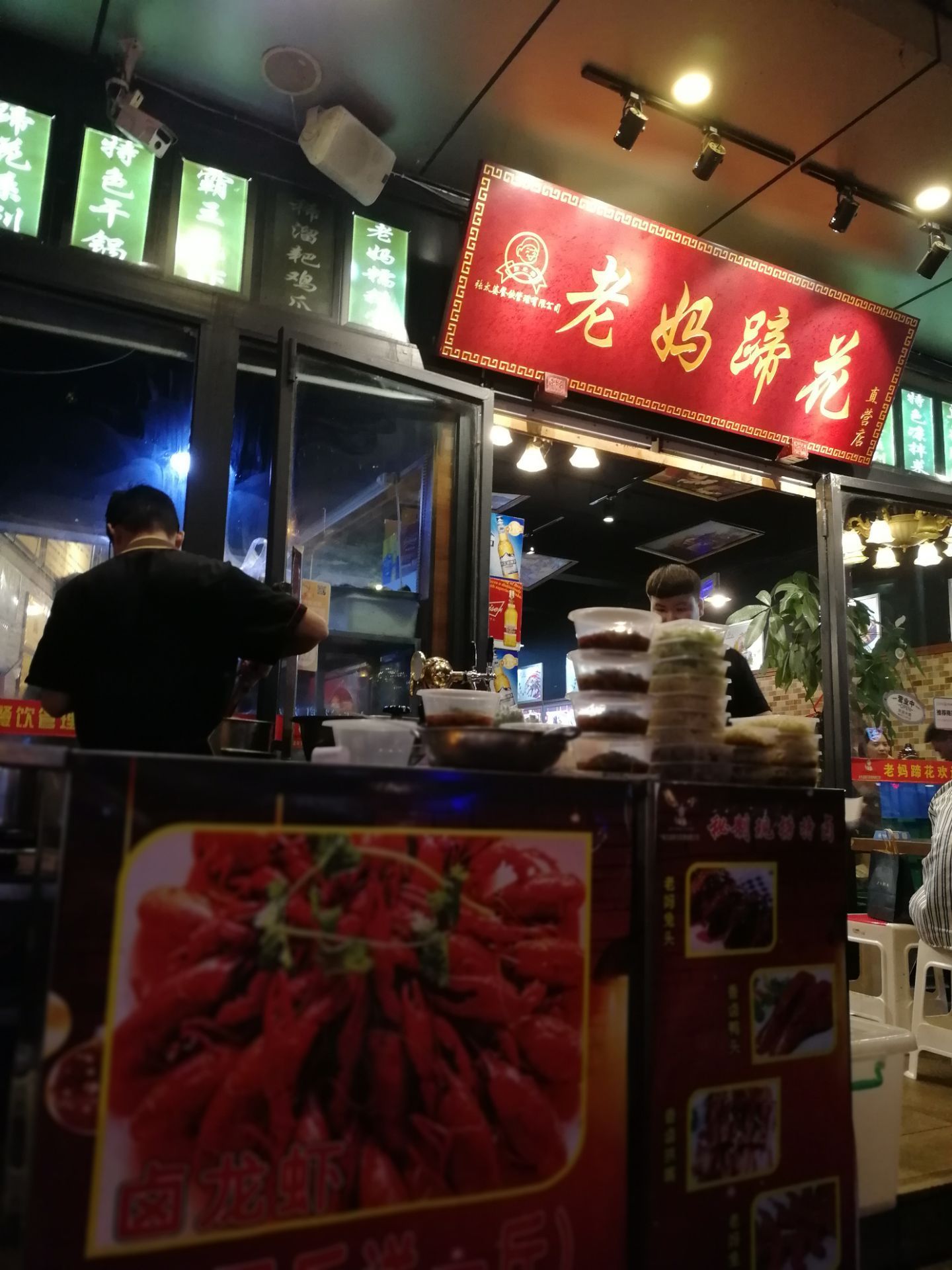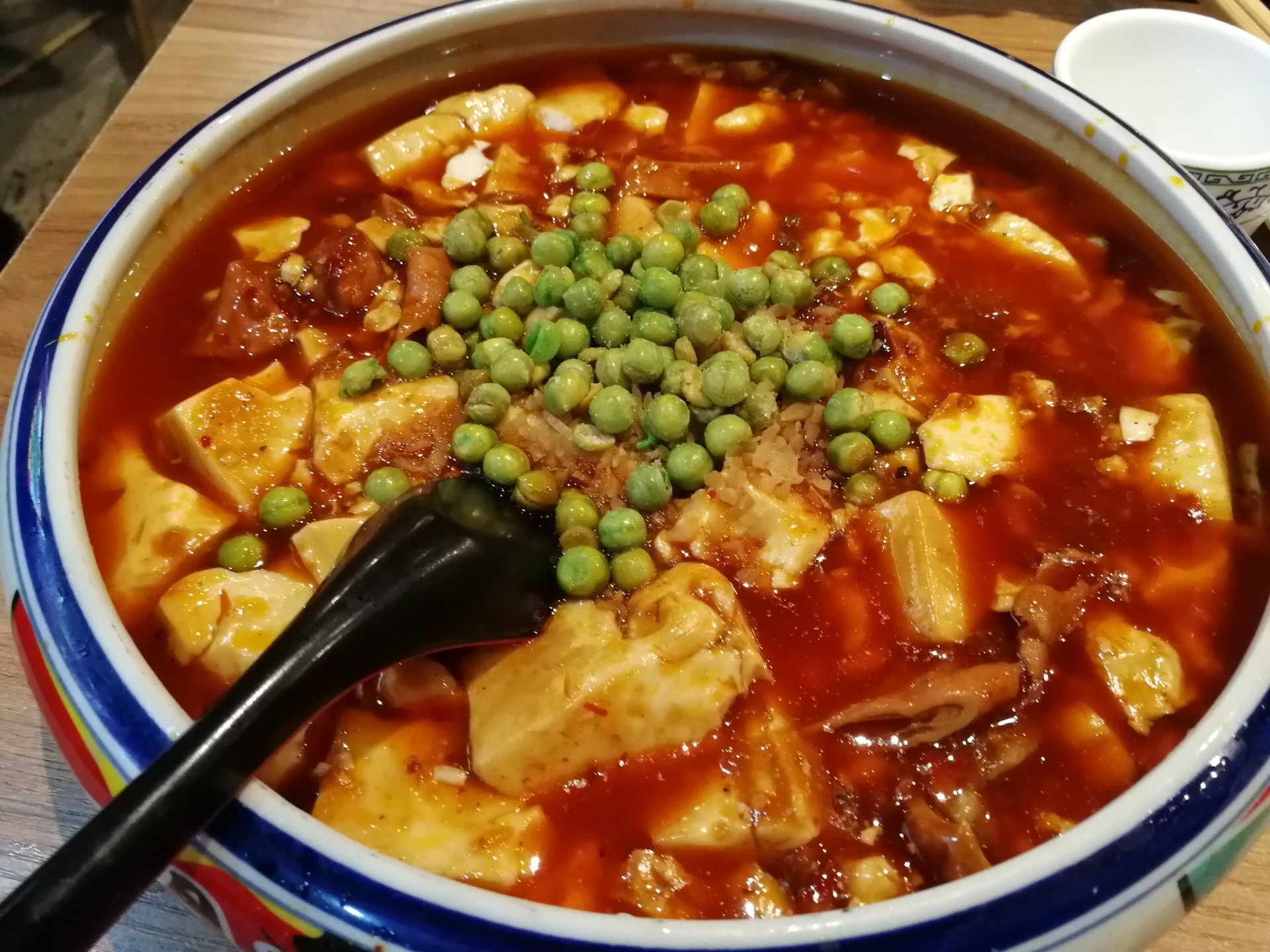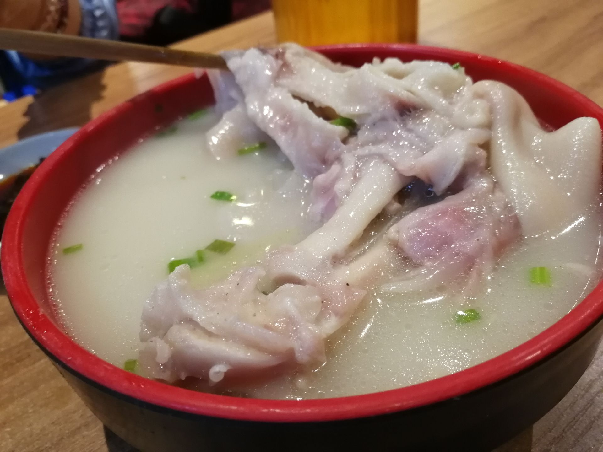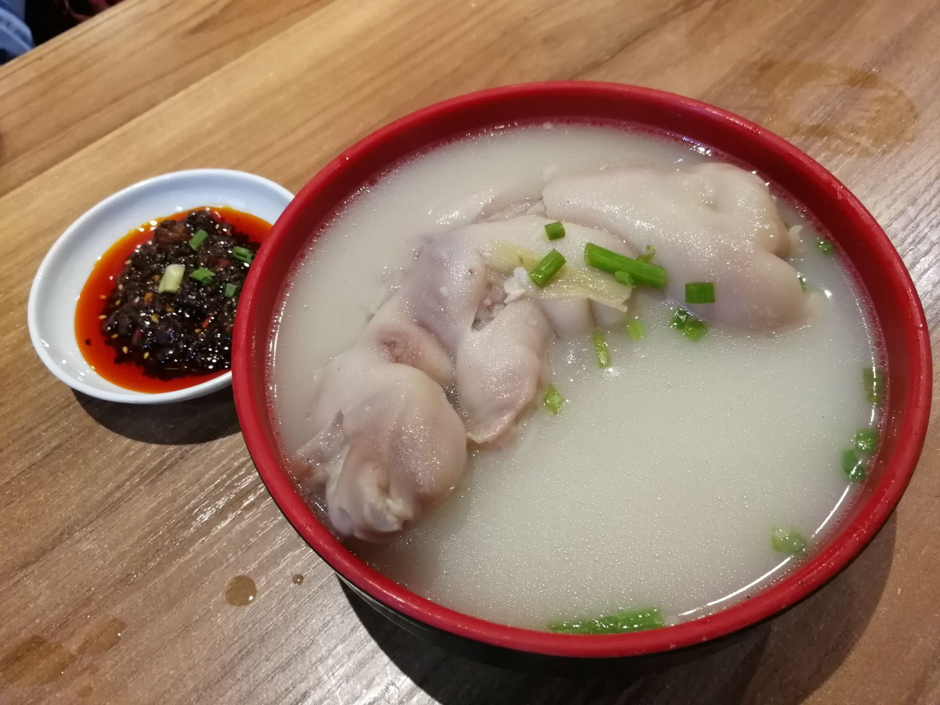 看完变脸表演后再来张太婆老妈蹄花(太古里店)吃一顿宵夜。下午吃的美食还没消化,肚子还是饱饱的,但又想吃这里的特色蹄花。于是就叫了一碗招牌蹄花汤,肥肠豆花。招牌蹄花汤里有一根大大的猪腿,汤底是奶白色的,味道有点淡,但都能感觉到它的鲜美。蹄花焖得很软,很烂,骨肉分离,浓浓的骨胶原。肥肠豆花,看着很多红油,但我居然不感觉辣,豆腐很嫩滑,肥肠也很入味。因为和朋友都太饱了,吃不完,打包拿走。两个菜,结账60元。