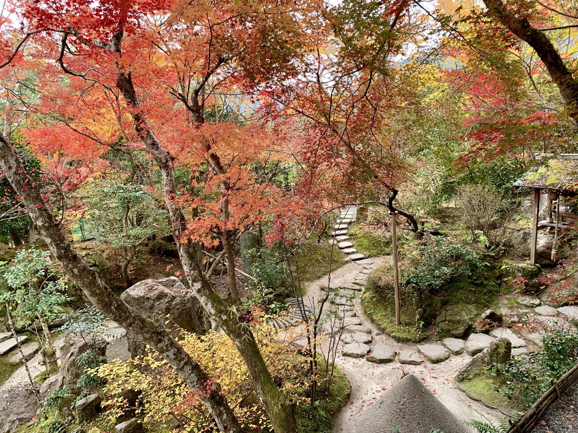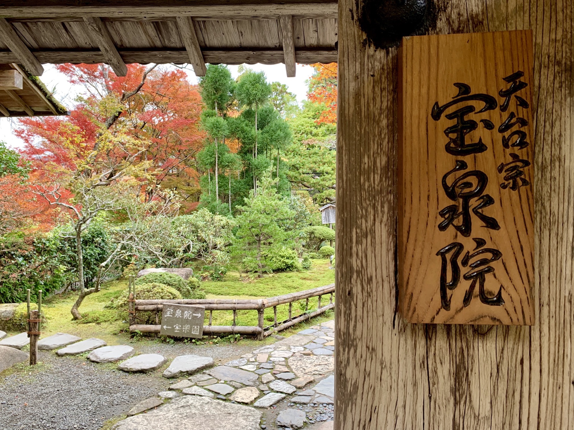 在进三千院之前,我们在整个寺院区闲逛;虽然天阴,红叶相映下的日式禅院,依然魅力十足。事先并没有做这里的攻略,无意中发现了这一处-宝泉院。门票800円,包含一小碗抹茶和一个果子。红叶节游客不少,大家都安安静静地在"额缘庭院"里,观赏着上下檐柱框出的闲静景象;院内有一棵700多年树龄的五叶松。 只是在深秋季节,脱了鞋光穿着袜子在地面上走,略冷。