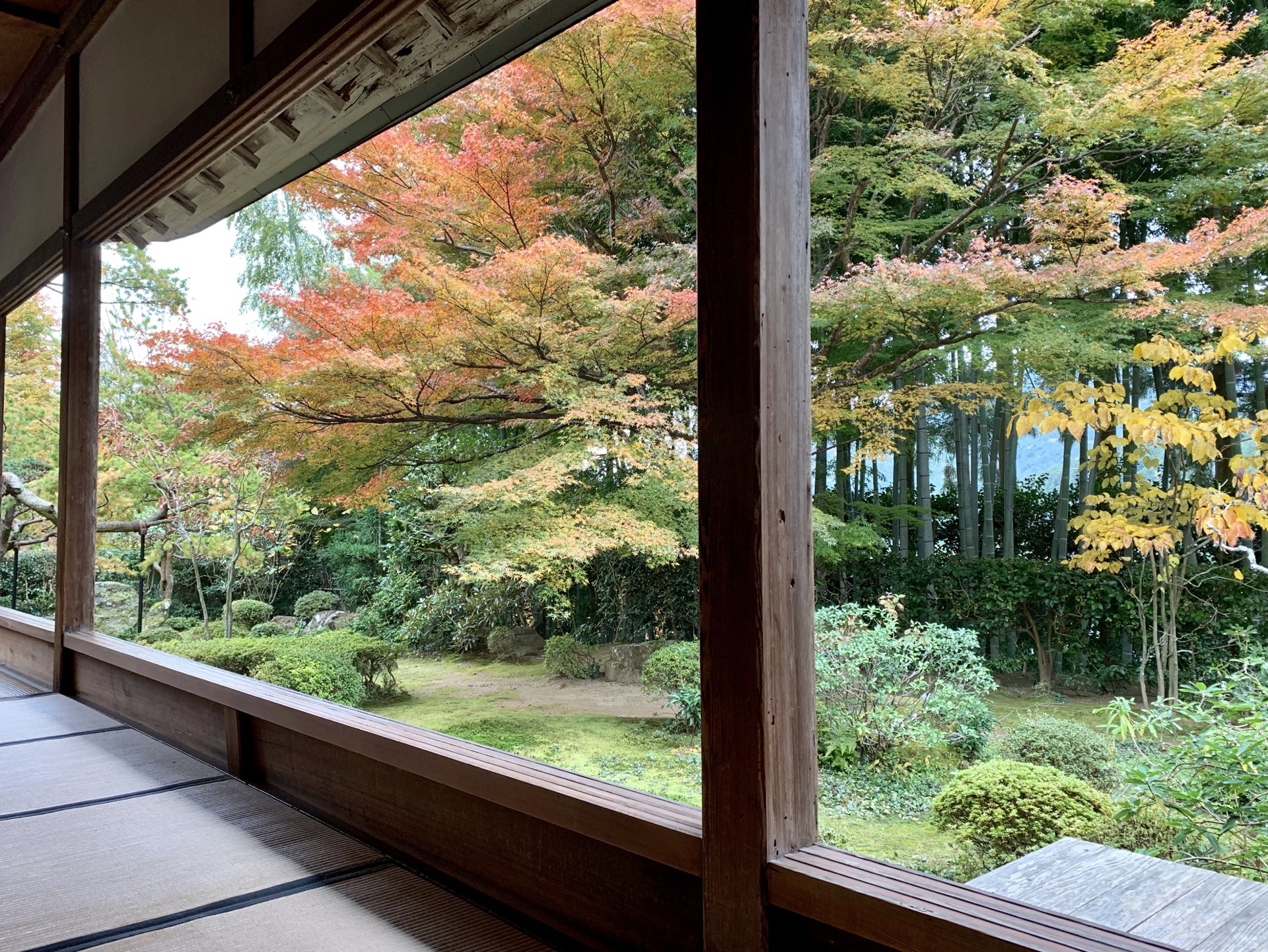 红叶节游客不少,大家都安安静静地在"额缘庭院"里,观赏着上下檐柱框出的闲静景象