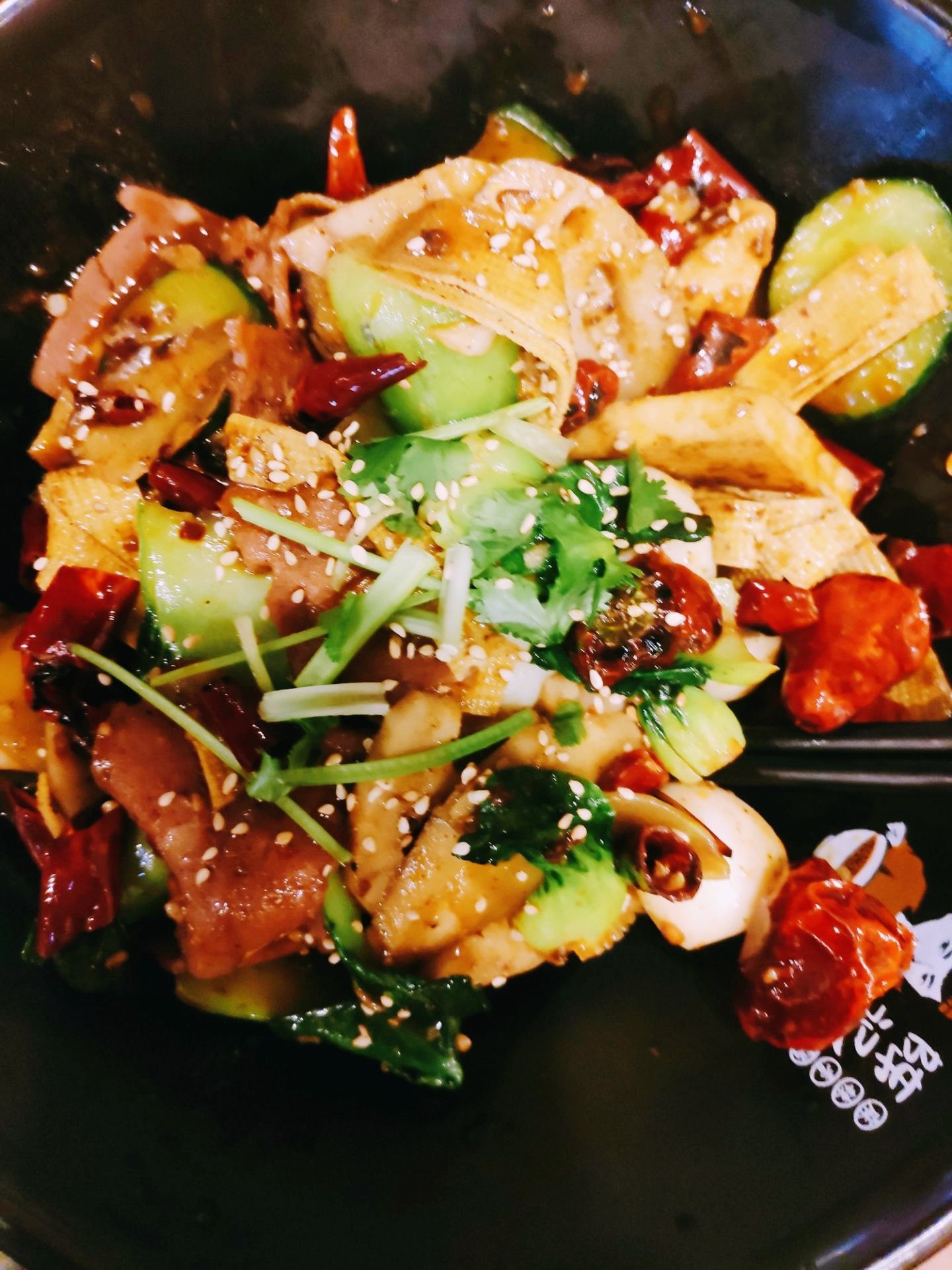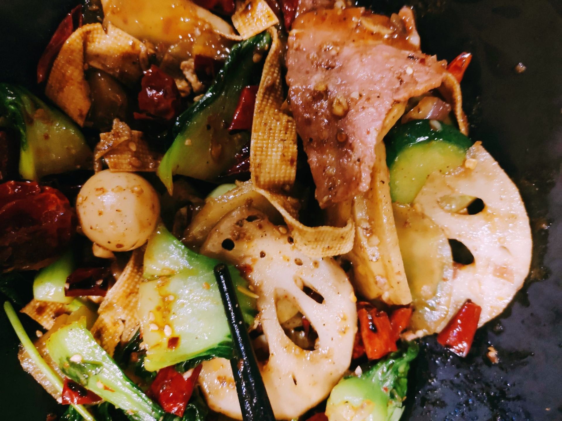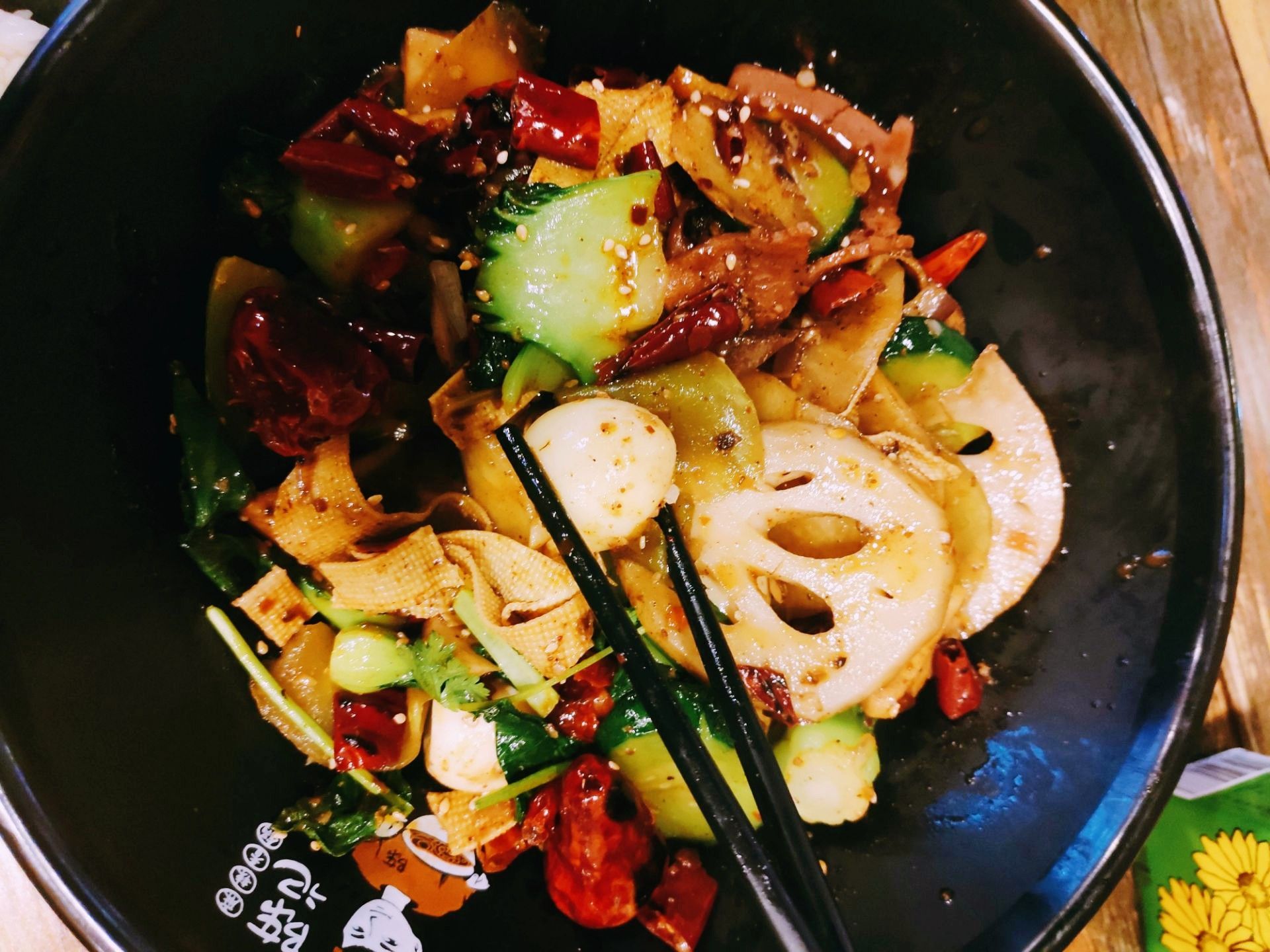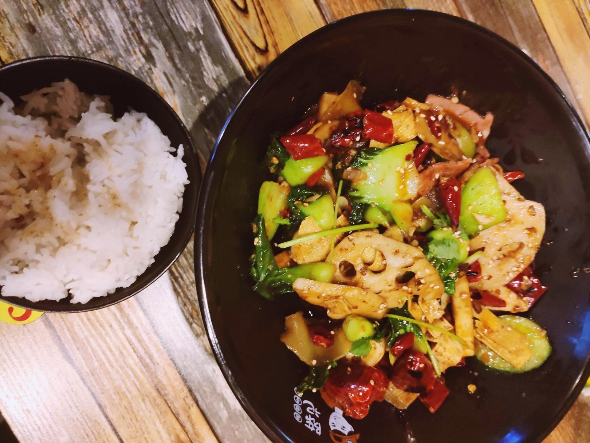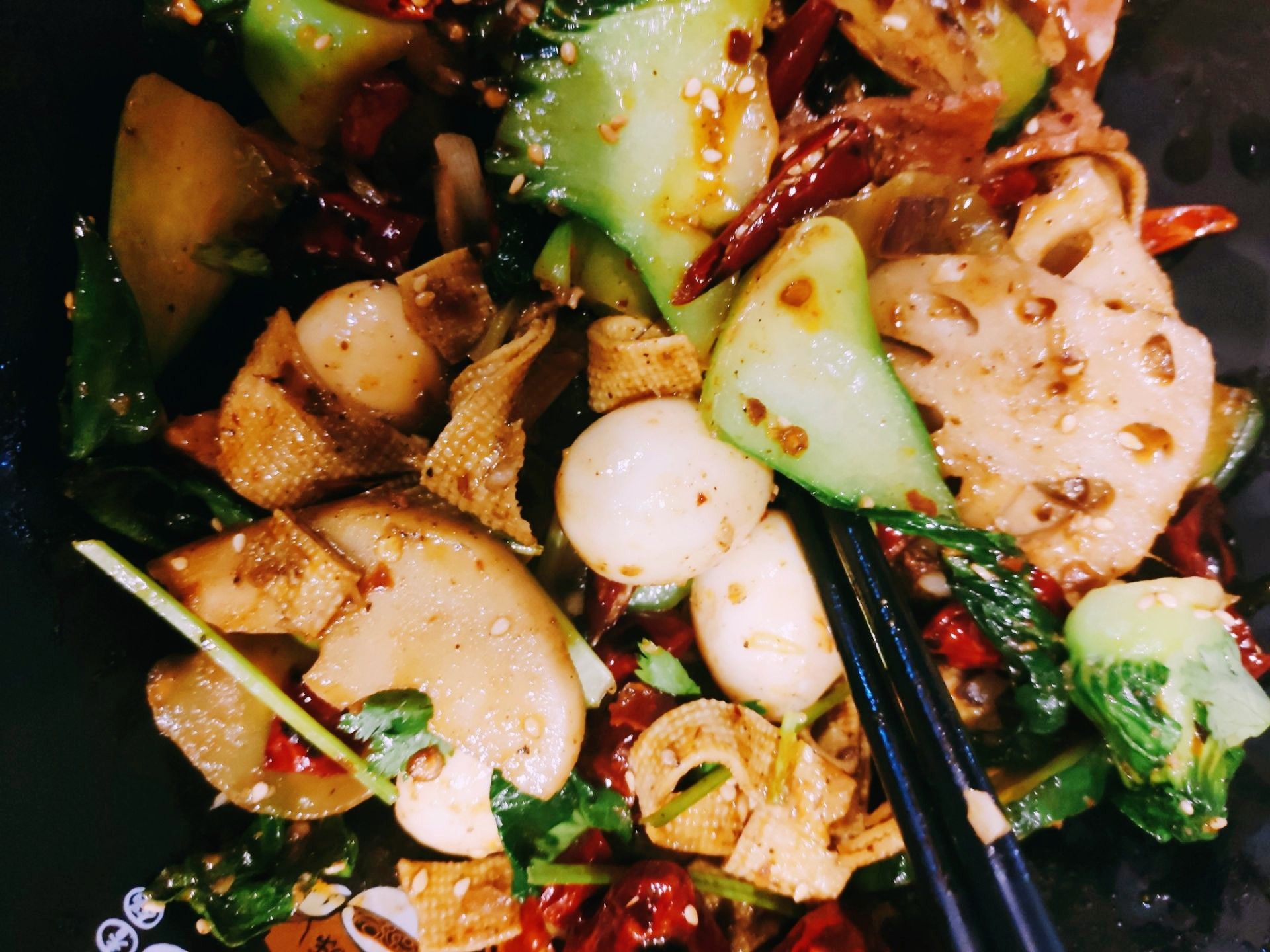 好久没吃麻辣香锅了,于是今天偶然看到秒杀有麻辣香锅,看了地址不远就立马抢购下来。 [环境]这家名叫陈记麻辣香锅的店铺不大,有几张长桌,另外一边就是食材区了。这是一家装修普通的店,没有什么花里胡俏,毕竟这不是一家为环境装修买单的店。 |这个麻辣香锅单人餐还是比较丰富的,有几个鸟蛋,土豆片,莲藕块,上海青,培根,千叶豆腐,莴笋,黄瓜等,还有显眼的红色的干辣椒,香菜。感觉这个套餐里的我都比较喜欢吃的,鸟蛋,千叶豆腐,培根口感还不错。麻辣程度还是有许多选择的,微麻辣的话,如果不碰干辣椒,辣度没什么感觉。