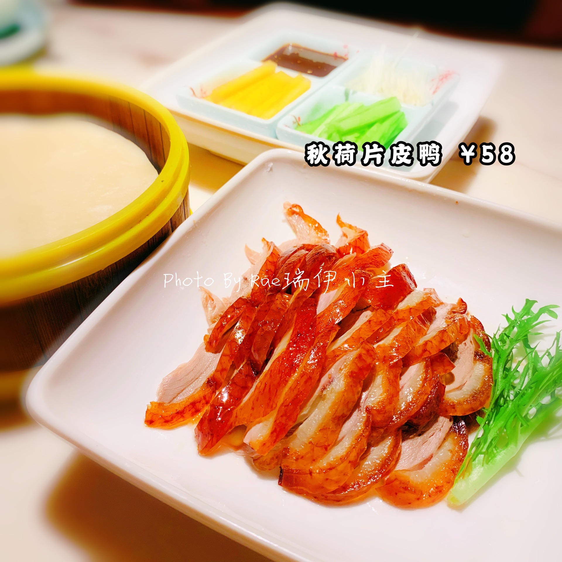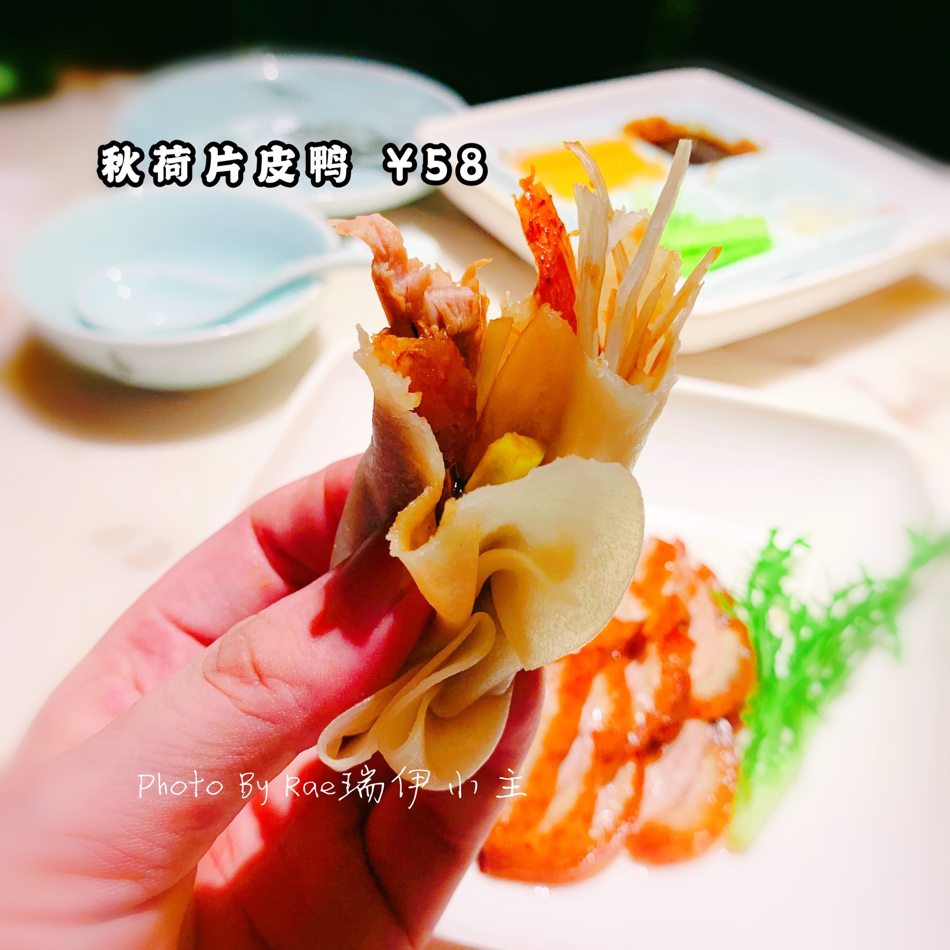 内里是水果色拉 「秋荷片皮鸭」 烤鸭的最经典吃法,蘸酱包饼皮,不得不说,刚出炉热乎乎味道还是无...
