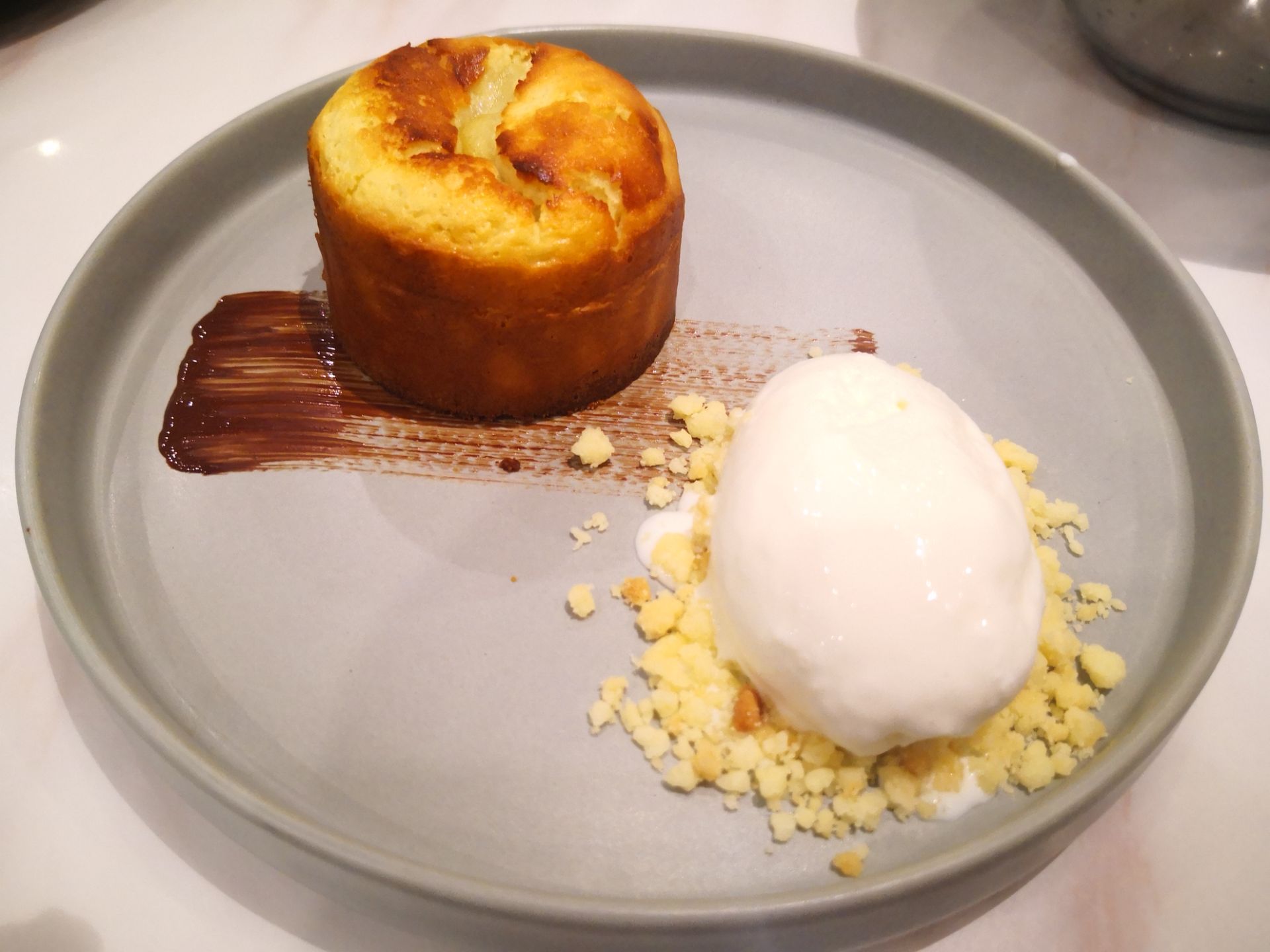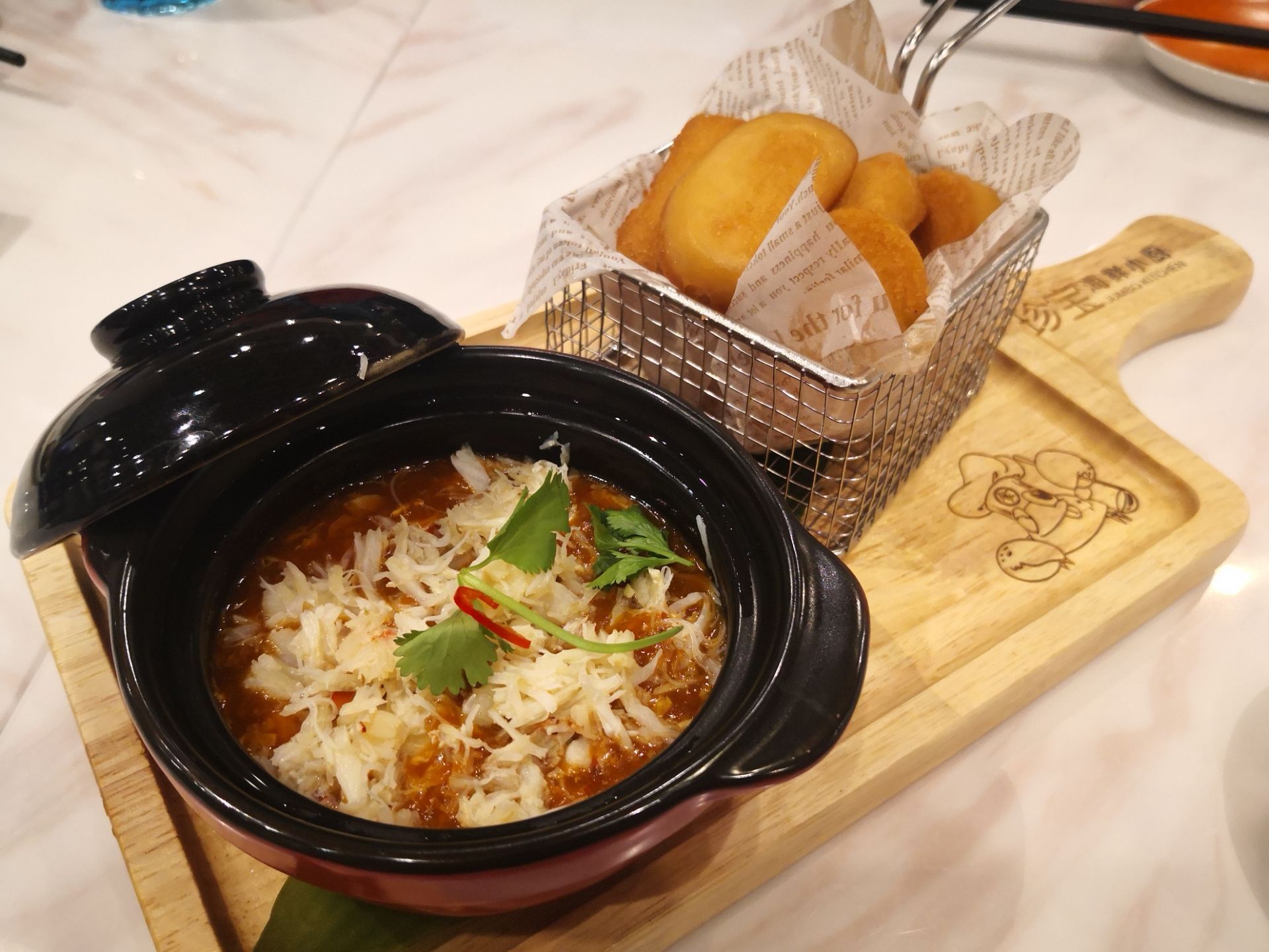 ...,蟹肉厚厚的在砂锅上铺了一层,用虽然炸过、但口感松软的馒头片蘸起裹着酱汁的蟹肉,那感觉,很奇妙