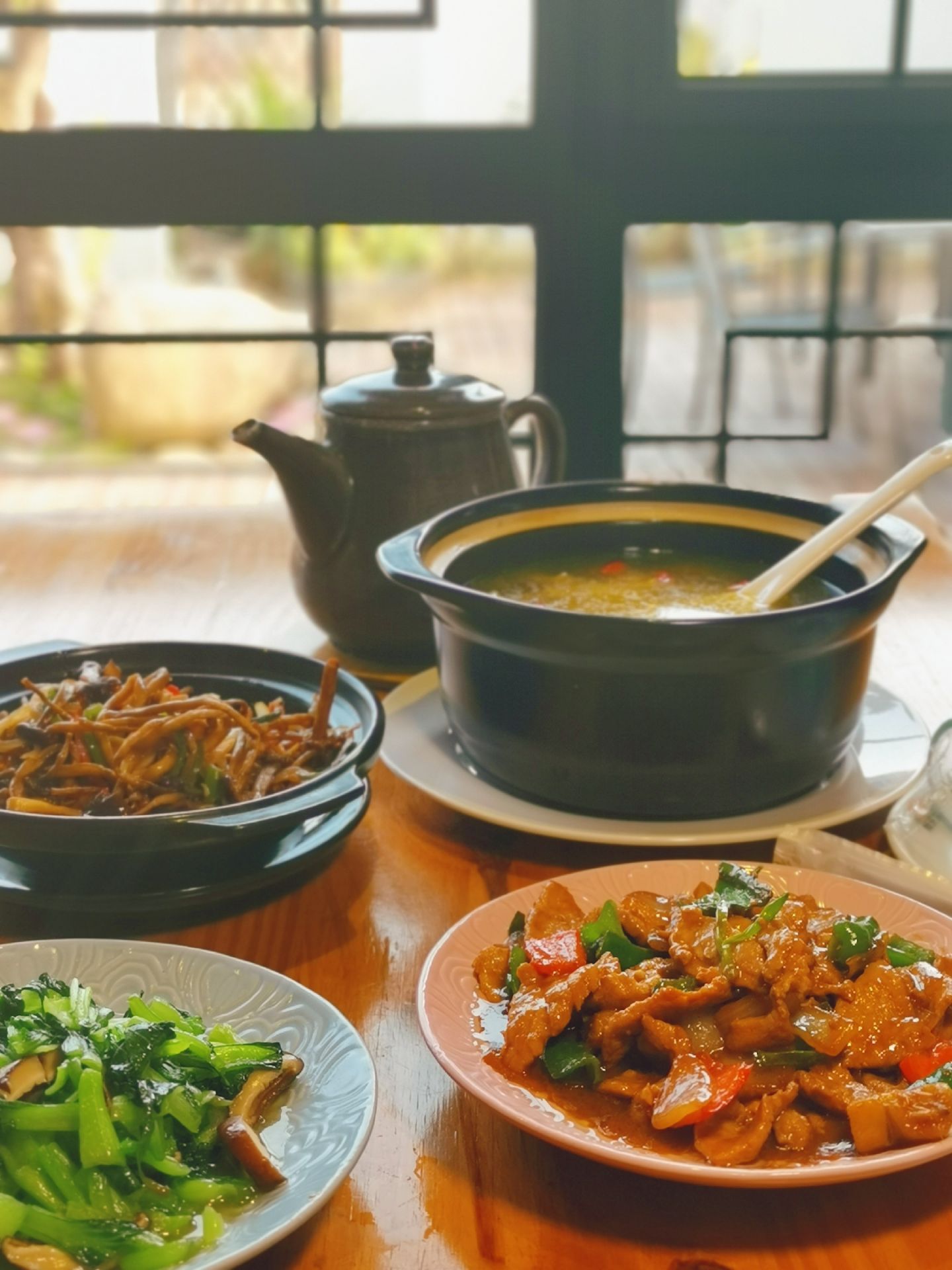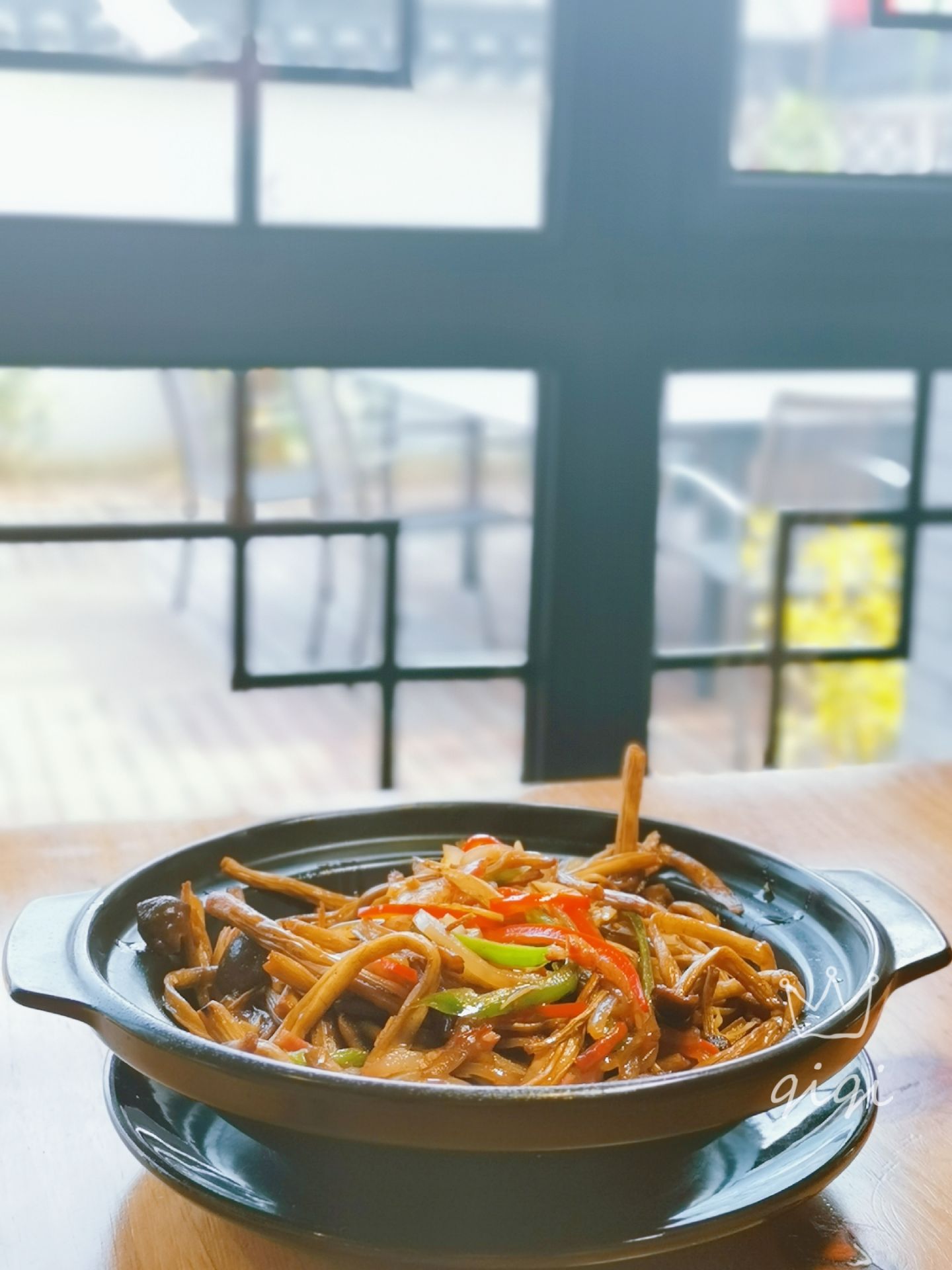 山中美味,来自安吉农家味道。都是山中的好味道,与城中那些完全不一样,吃的就是原汁原味。 [环境]木质古色古香的雕花木门,玻璃窗外一览庭院美景。店家结合安吉特有的竹融入装修设计里面,别致的竹灯、竹椅,还有特制的房梁无比体现老板对于好好生活的追求。 ⭕|农家土鸡煲^来着安吉走地鸡,经过2小时以上的熬制,鸡汤鲜美正是冬季进补好味道。鸡的肉质都炖的酥嫩,就放了一点盐,搭配枸杞,喝着暖暖的。 ⭕|干锅茶树菇^来着山中美味,烧的入味好吃,一个字“鲜”非常下饭。 ⭕|清炒肉片^猪肉的滑嫩,搭配青椒洋葱,都是当地自产的土猪肉,和城市味道完全不一样。 ⭕|香菇青菜^健康的味道,青菜都是当天新鲜采摘的。 一顿原汁原味山中美味,坐看山中美景,品鉴好吃的味道。