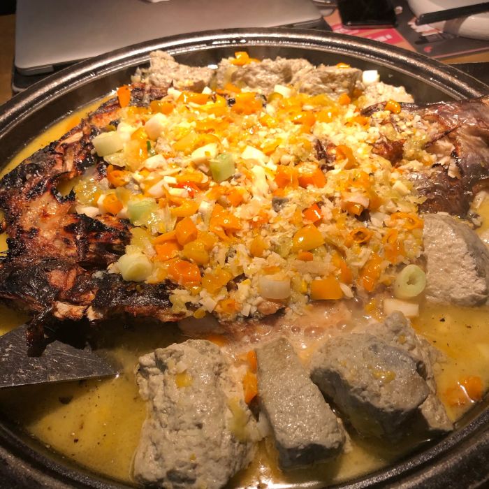 简直是网红店啊,下午五点排队就已经几十桌了,然后到地方了一看,已经几百桌,哈哈,提前预约真好,等了几分钟就到我们了,鱼还是不错,加了份豆花,两杯喝的,纯水果做的,味道不是很甜「包浆豆腐」团的券,很不错「黄金酸辣味烤鱼」很黄金,颜色也好看,就是忘记拍照了,两个人刚刚好「我爱凤爪」入味,不一样的感觉
