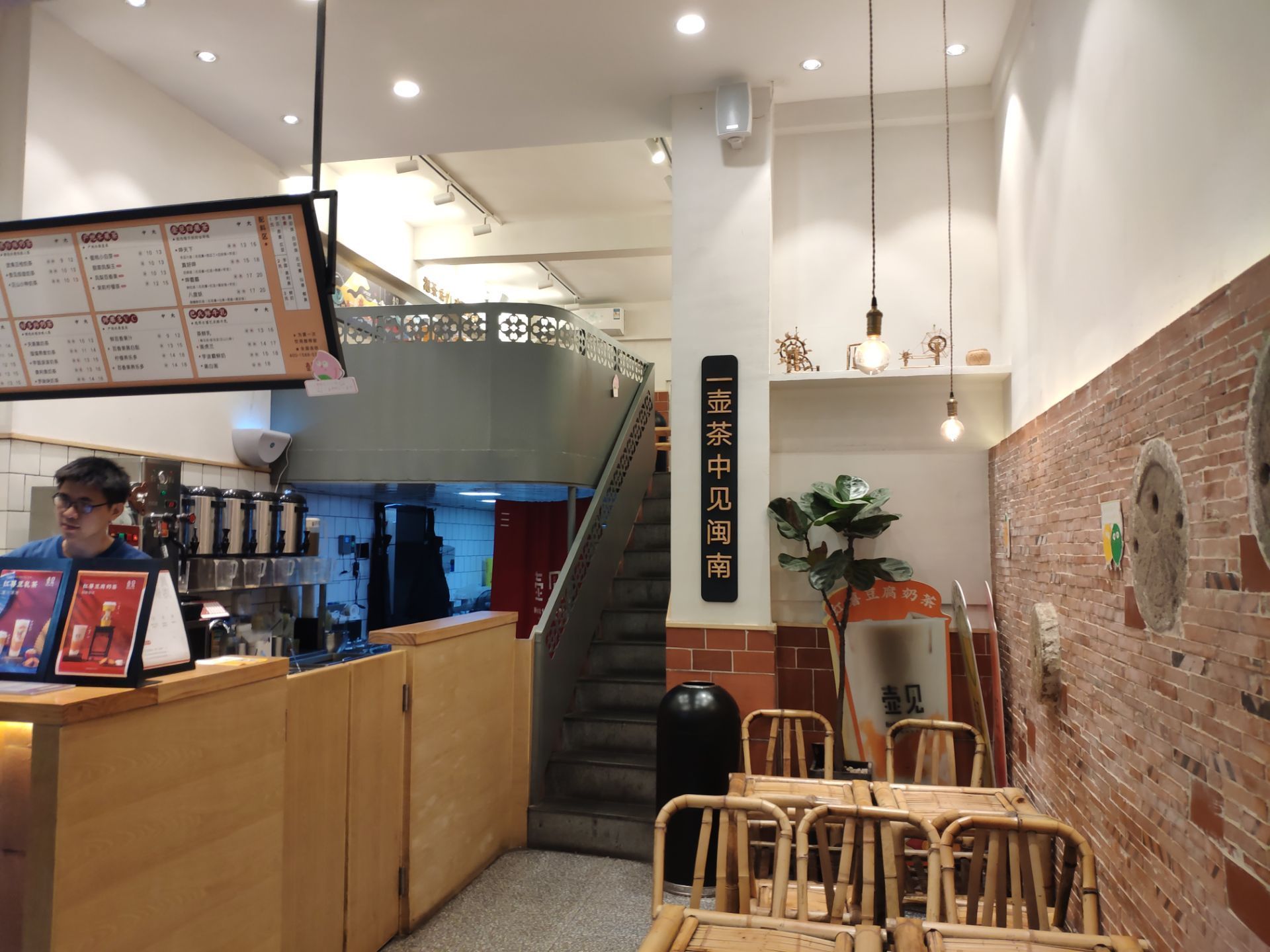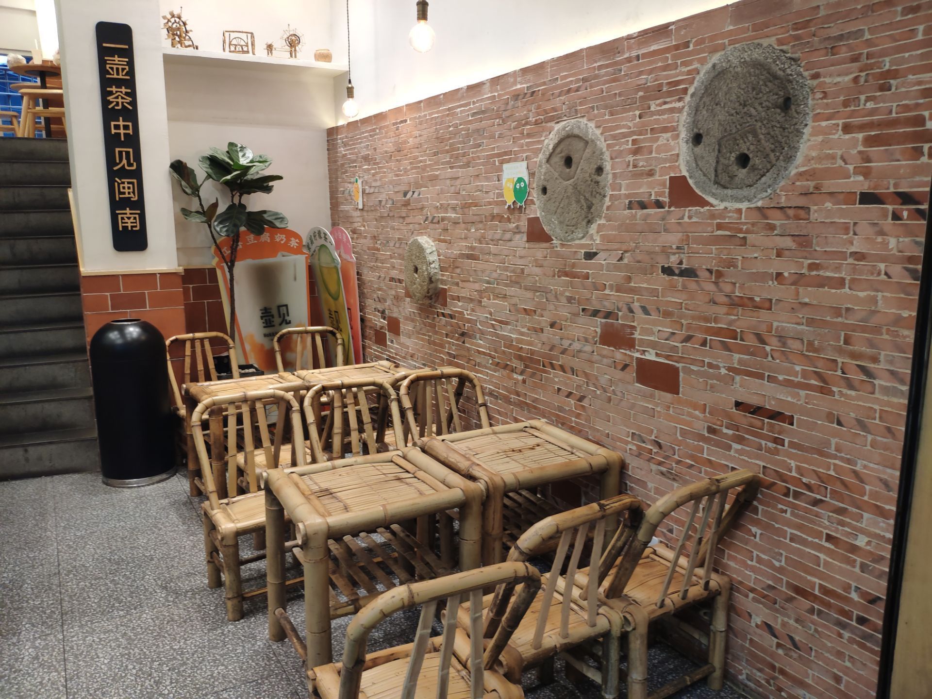 芋波霸鲜奶,也是好喝极了。红砖墙,竹桌椅等闽南元素到处可见,就连饮品名也多带有闽南语音