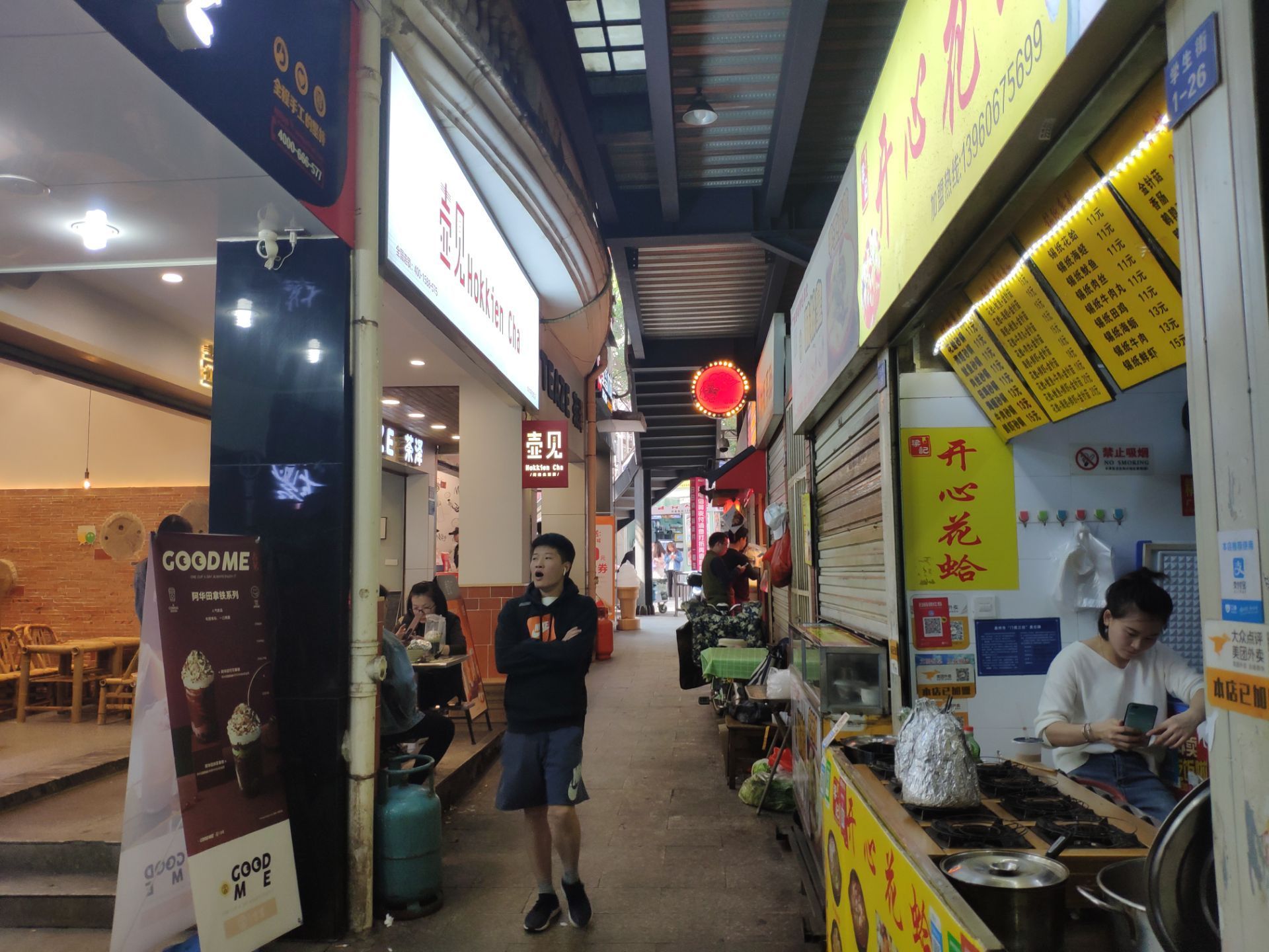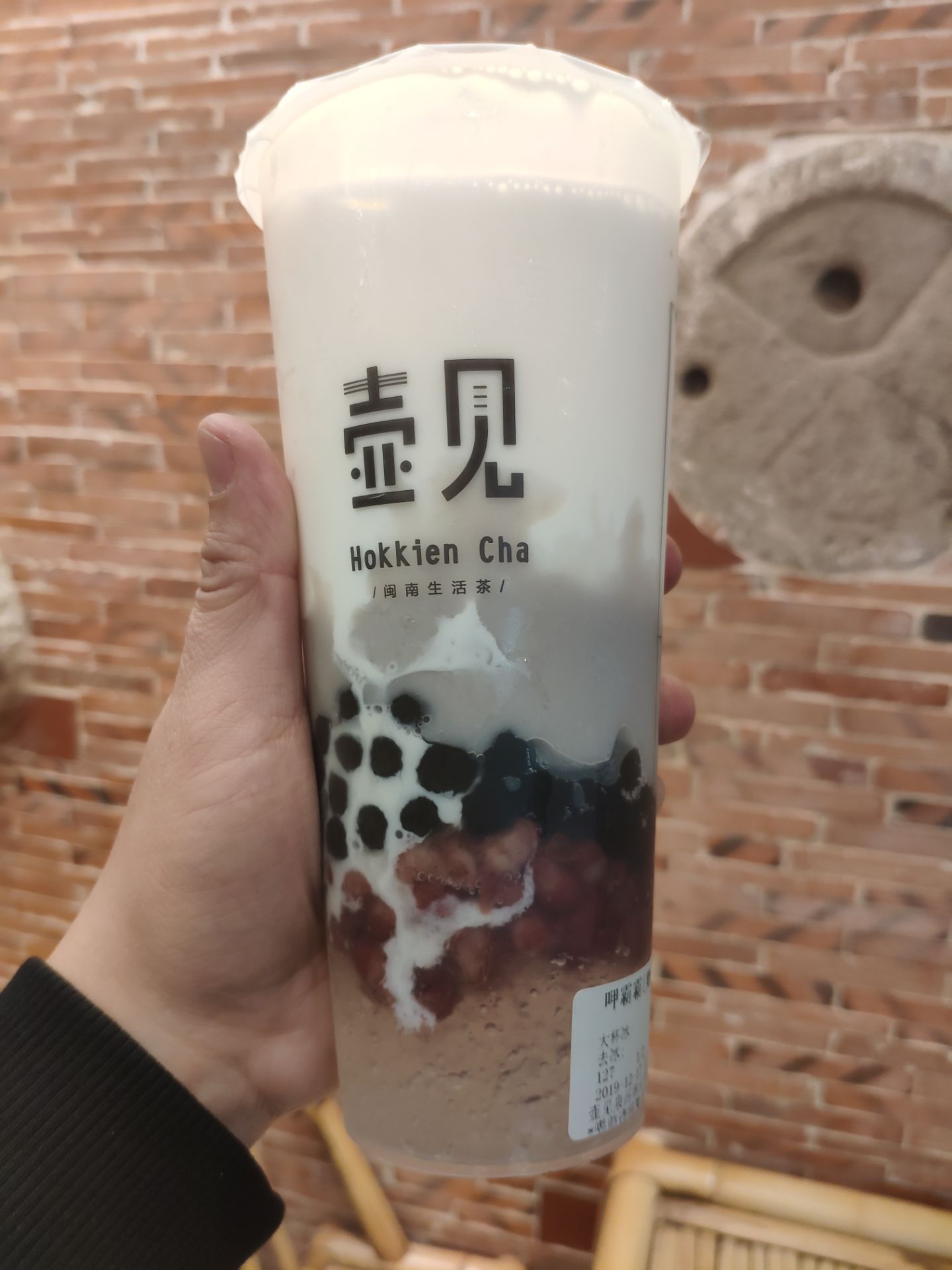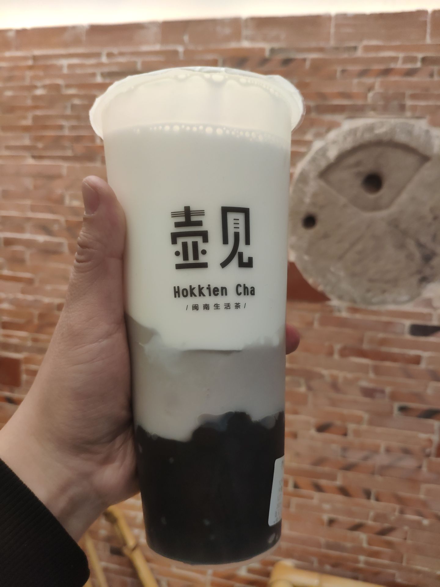 壶见华大店位于去学生街的入口不远处,旁边是古茗。 学生街的店铺都看起来挤在一起,但壶见不会,很好利用了空间,共两层。红砖墙,竹桌椅等闽南元素到处可见,就连饮品名也多带有闽南语音。 点了杯甲霸霸,鲜奶底,奶味十足,加石花膏,红豆,芋泥和珍珠。石花膏闽南特产,很爽滑。红豆也加工足够甜软,芋泥喝前要摇一摇,让整杯都有股芋香,口感也甜甜的,珍珠软又富有嚼劲,很不错。 芋波霸鲜奶,也是好喝极了。