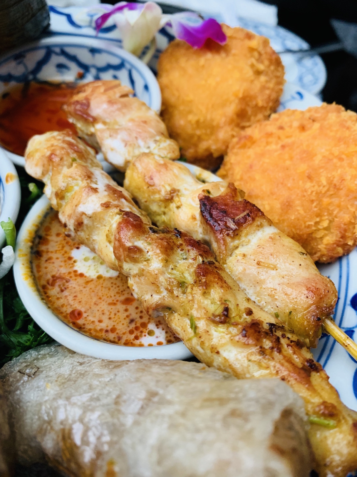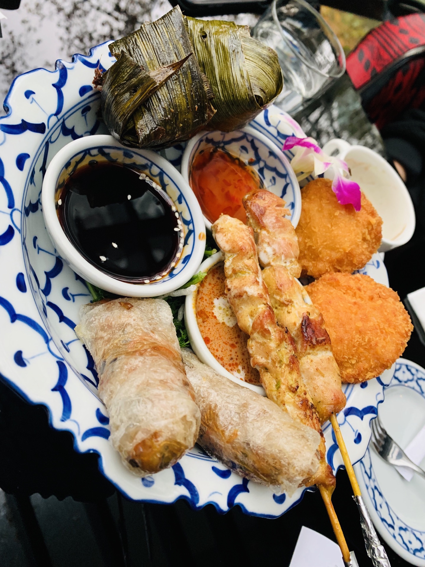 ╮╮╮ Ⅶ☽ 卍 ╭╭╭ 泰式下午茶 多云 15-17度 [环境] 静安公园内15年的餐厅,年龄算大龄,颜值还是冻龄的,环境一直保养的得当,服务员总体意识强,能主动建议合适的饮品菜肴,感受很温暖 「小食拼盘」正好二人份,虾饼/炸春卷/鸡肉串/荷叶鸡肉,很幸运坐到了景观位,吃什么已经不重要了 ㊗️店家和气生财、生意兴隆