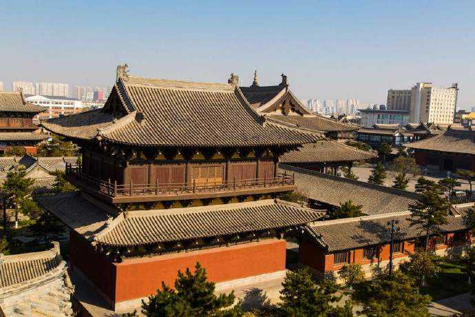华严寺占地面积二、三十亩,以大雄宝殿为中心,另有山门、前殿及钟鼓亭、祖师堂、禅堂、云水堂及两厢廊庑,布局严整,高低错落,井然有序。 大雄宝殿是具有独特风格和高度艺术水平的辽金建筑,辽宁义县奉国寺大殿并称为中国现存最大的两座木结构建筑的佛殿。大雄宝殿矗立在4米多高的月台上。月台前正面置石级,周围装勾栏,四周巨相苍松,枝叶繁茂。大雄宝殿东向,面阔九间,53.75米;进深五间,29米,总面积为1559平方米,巍峨壮观,是中国规模最大的佛殿之一。 其结构为单檐五脊顶,出檐3.6米,檐高9.5米,殿顶正脊高1.5米,两端的琉璃鸱吻高4.5米,筒瓦长0.8米,重约27公斤。脊饰垂兽作二首相联状,形式极不多见。这种建筑结构十分牢固,经历八百年仍稳健、坚固、气势雄伟。