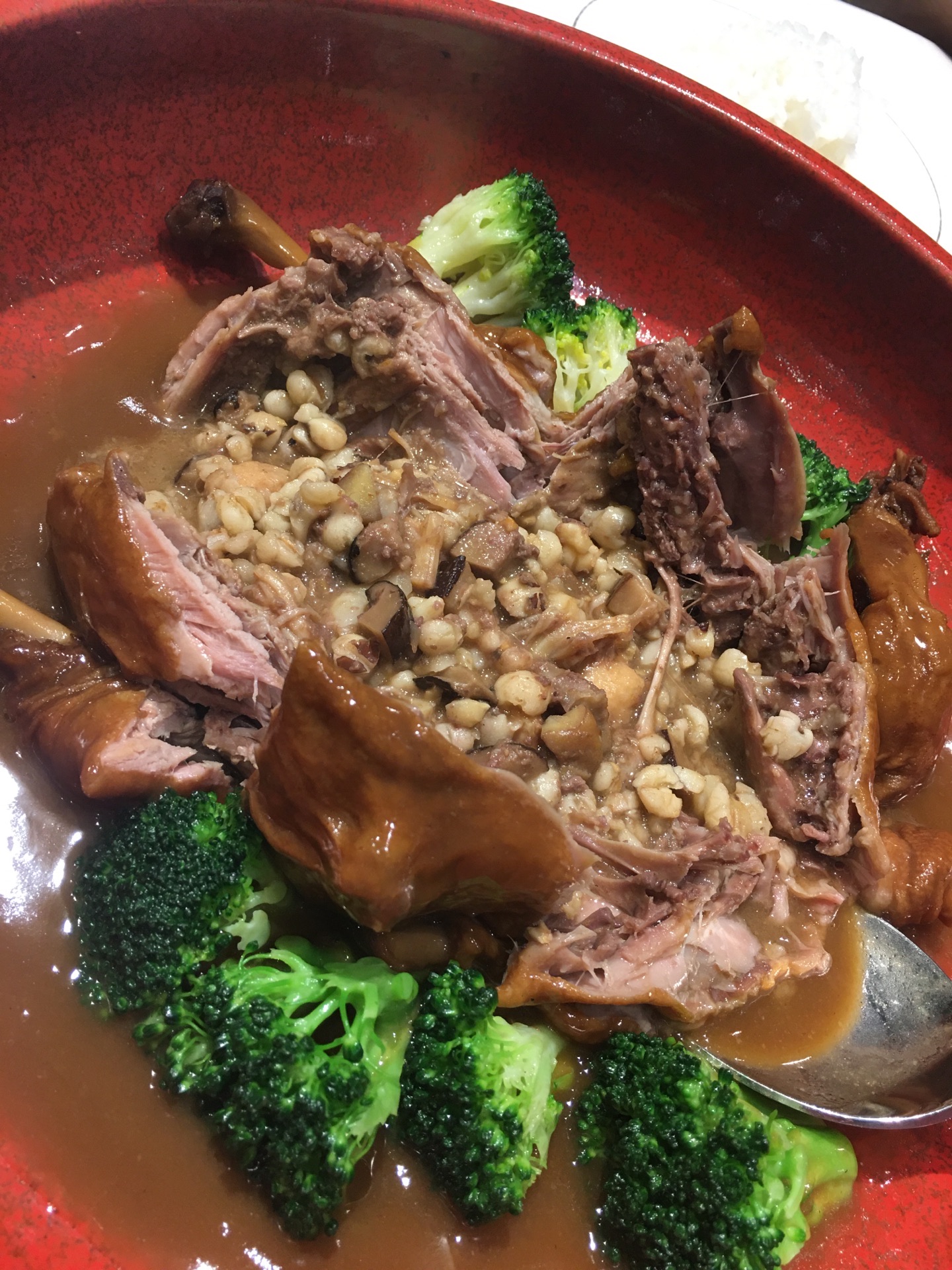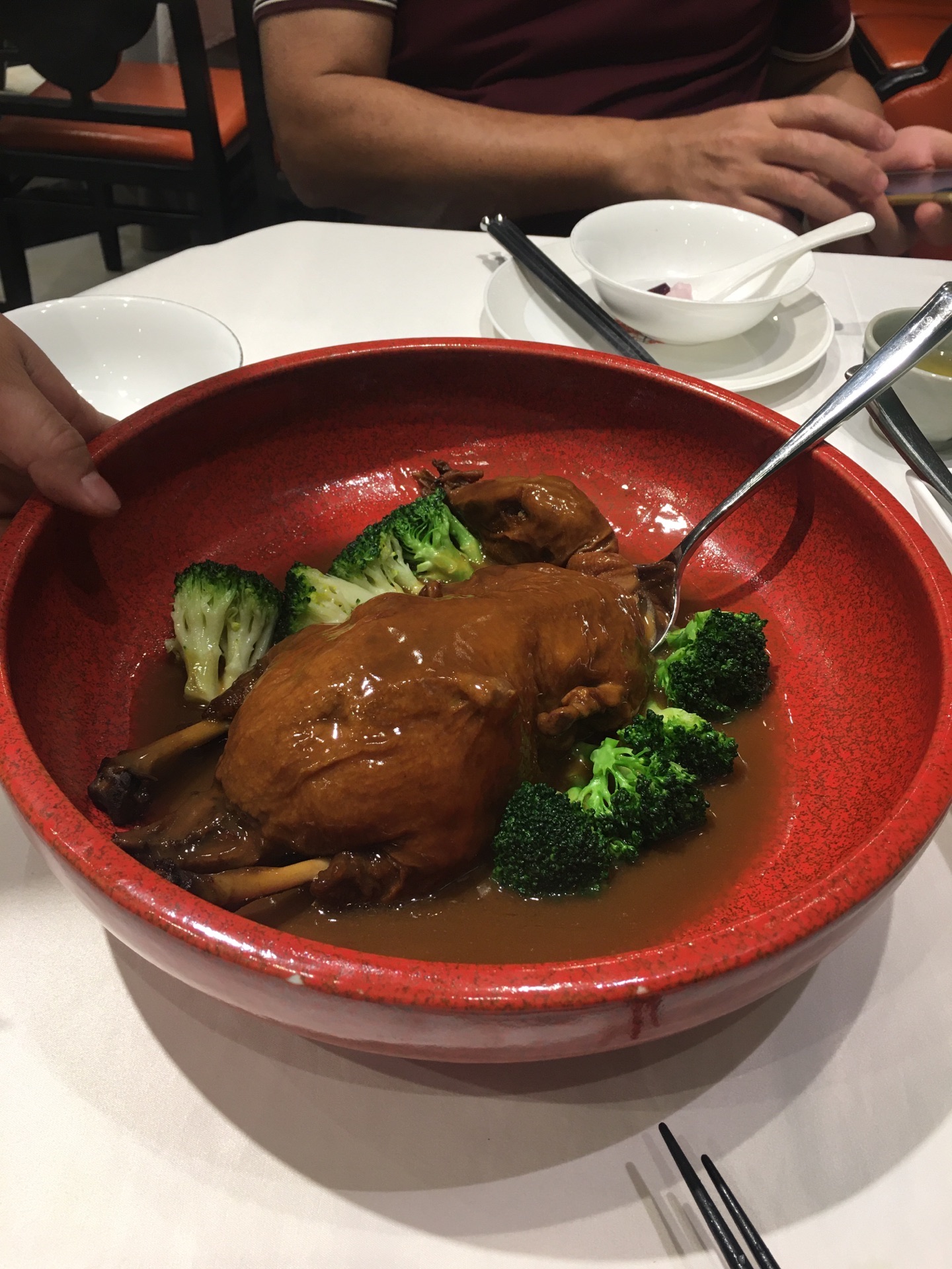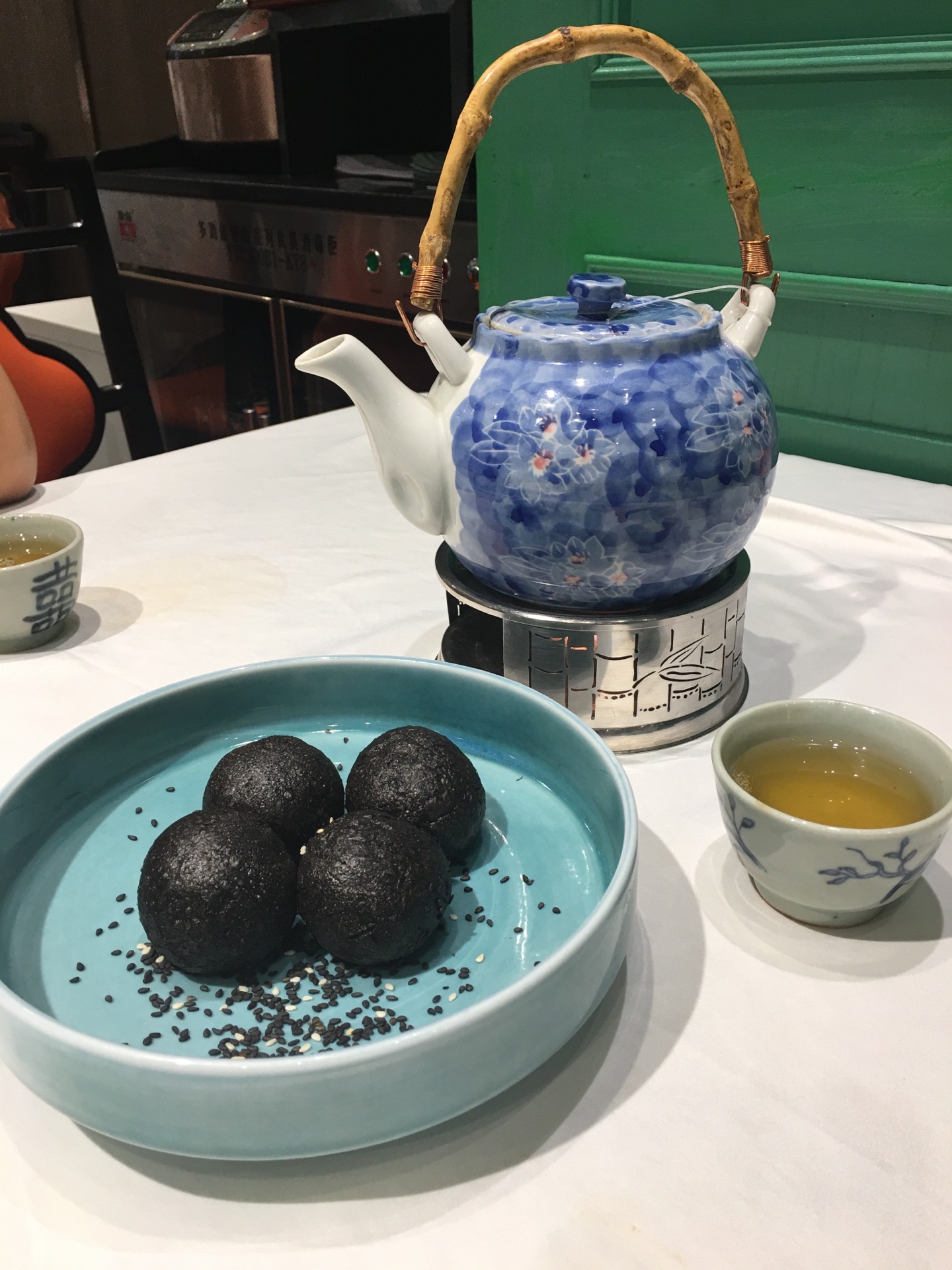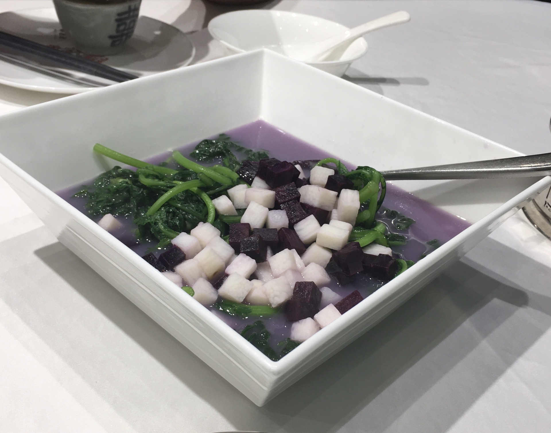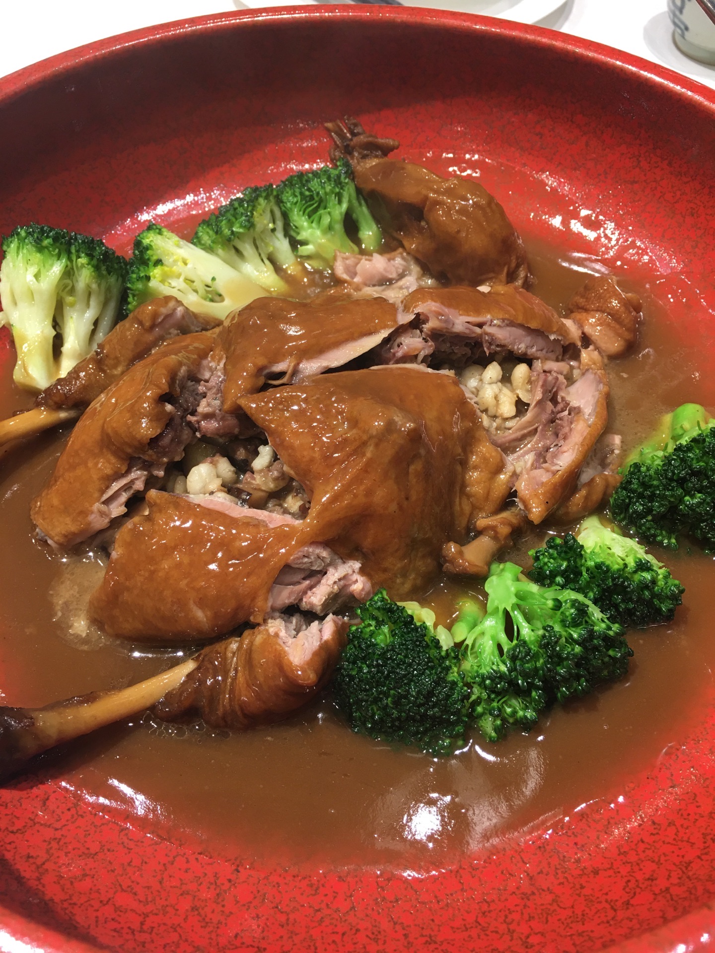 今日过去食午餐试了两款新野,一个系八宝BB鸭,一个系脆皮黑芝麻艾糍丸。 八宝BB鸭78元,味道唔错。鸭皮好食但肉太软烂,比较适合老人。八宝中以薏米为主,莲子、栗子只是象征性地放了一两粒。貌似八宝只是个虚数,但值得一试。 脆皮黑芝麻艾糍丸21元4个,作为餐后甜点相当好。颜值在线,口感外表微脆,内软糯,中间流心。推荐。 淮山紫薯皇帝菜36元。之前已经食过觉得十分喜欢,养眼又美味。这次莫不犹豫选了它,没有令我失望。 午餐时间开了一个小厅,里面环境特别好。服务是一如既往地令人满意。