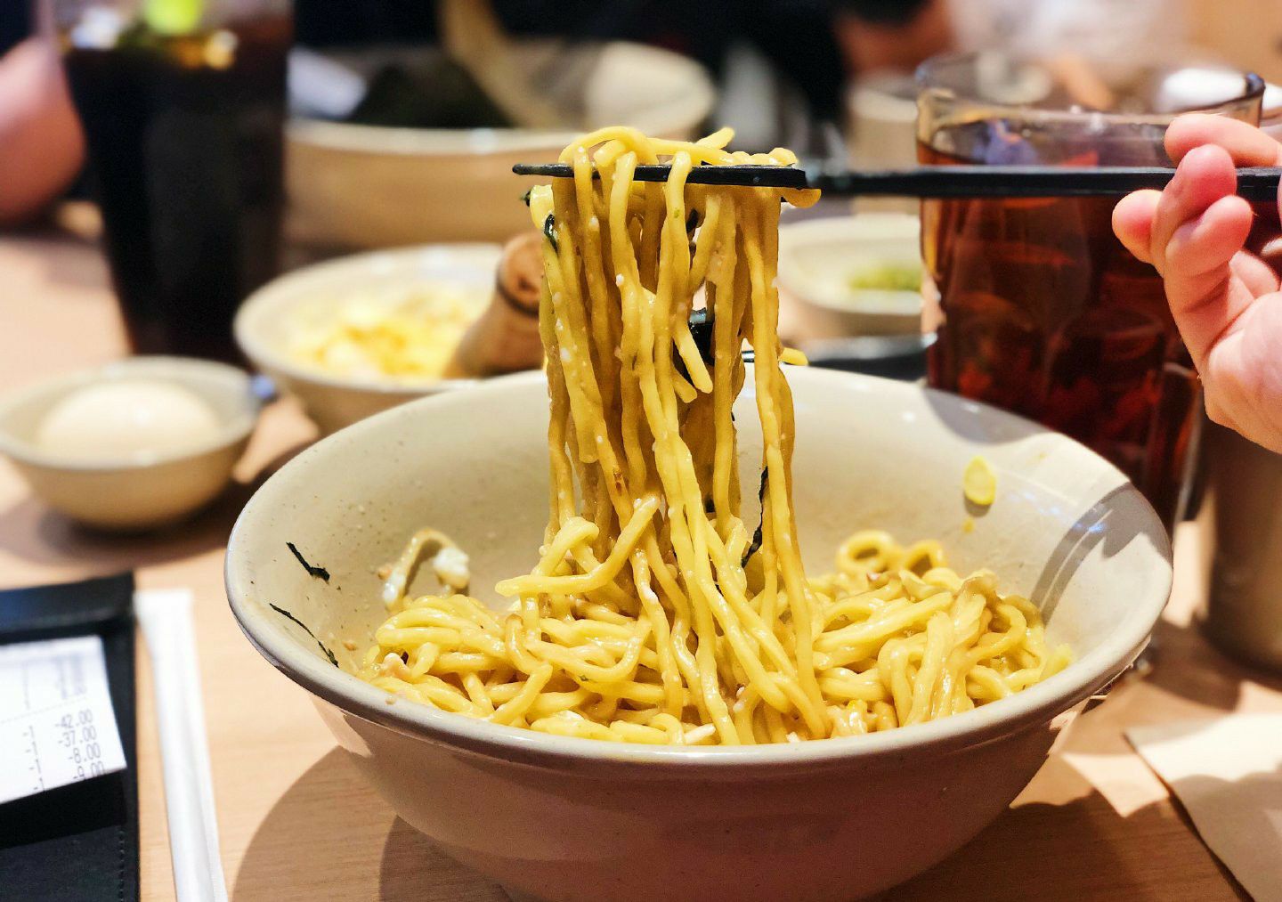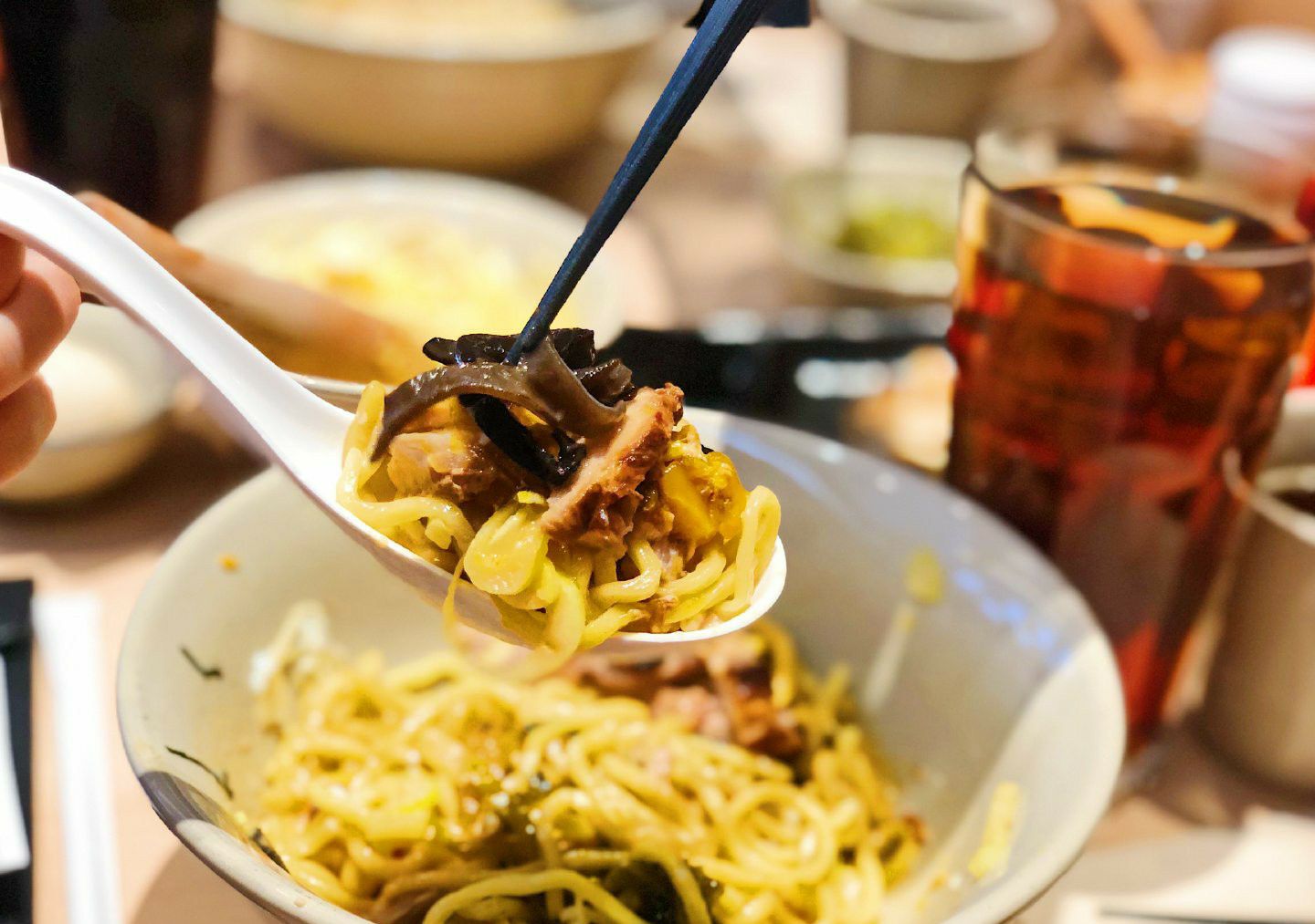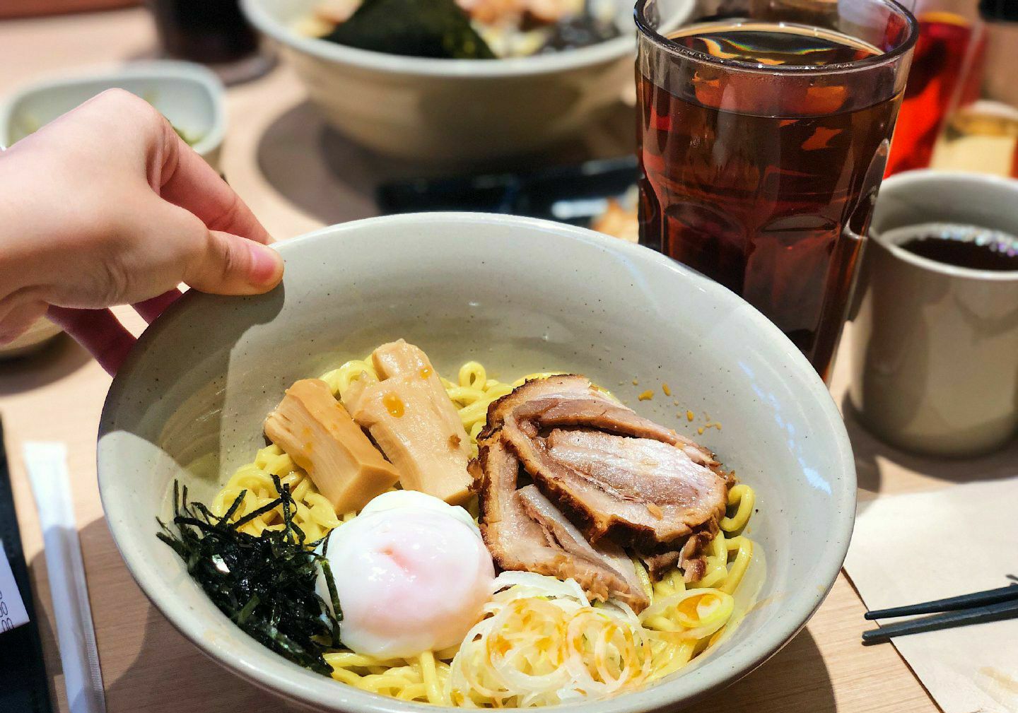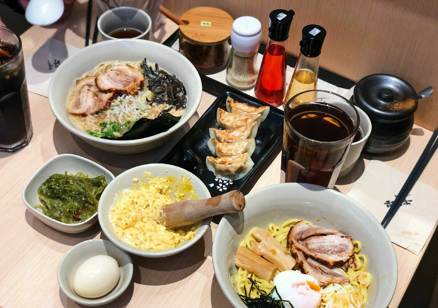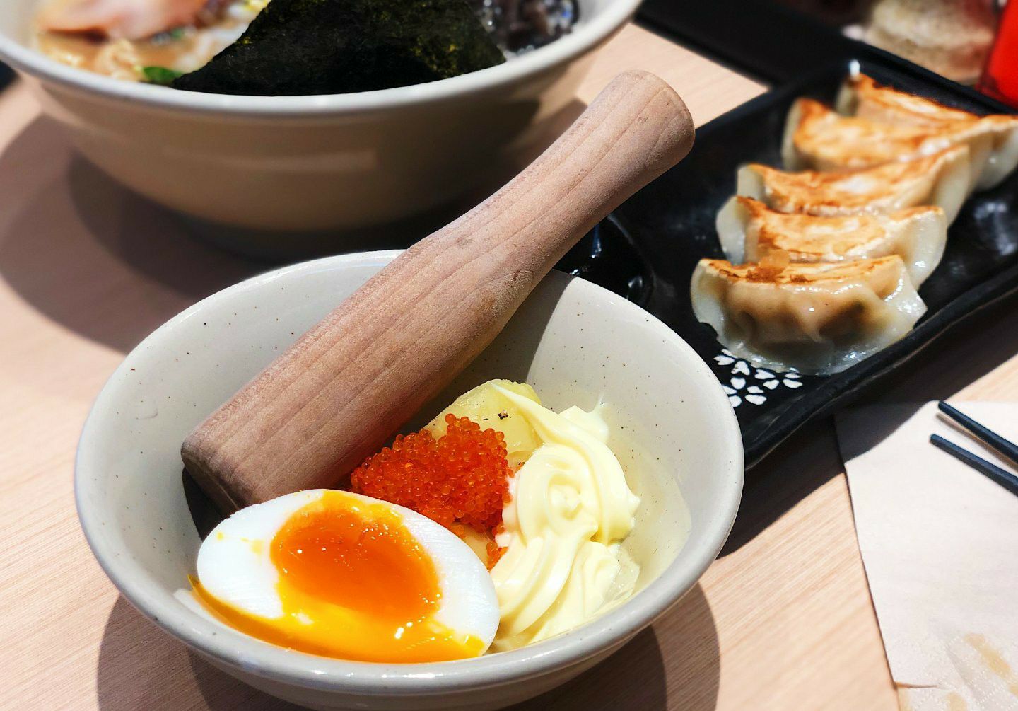 - 歌志轩秘制拌面 招牌招牌!上桌前红油黄油各来两圈半!据说是最好吃的比例了,确实很不错!面条黄澄澄的,比一般拉面粗很多,但是意外的很挂汁哎!一份面里面有两大块叉烧,还有笋和一整个温泉蛋,拌匀了吃,每一口都能带上酱汁和肉末什么的,真的超足味超满足! - 十时豚骨汤拉面 汤拉面也很优秀哎!汤底虽然没有很厚重,但是也算浓郁啦!拉面是细面,口感超爽滑的!汤面里面还有好多豆芽木耳,添了一份爽脆的口感,叉烧有淡淡炭烧味,满足感十足!喜欢! - 捣蛋土豆沙拉 这个超可爱的!土豆泥和流心蛋沙拉酱还有鱼籽放在一个盅里,要自己捣碎了搅拌一起,但是服务员也会帮忙~味道的话,有沙拉酱的酸甜,还有鱼籽的脆口感觉,土豆泥也是很绵密细腻的,味道很不错哎! - 一口煎饺 煎饺有小小的掉分了,不知是有点凉了还是什么,感觉底不够脆,内馅味道有一丢丢淡,一定要蘸酱油和醋一起吃~