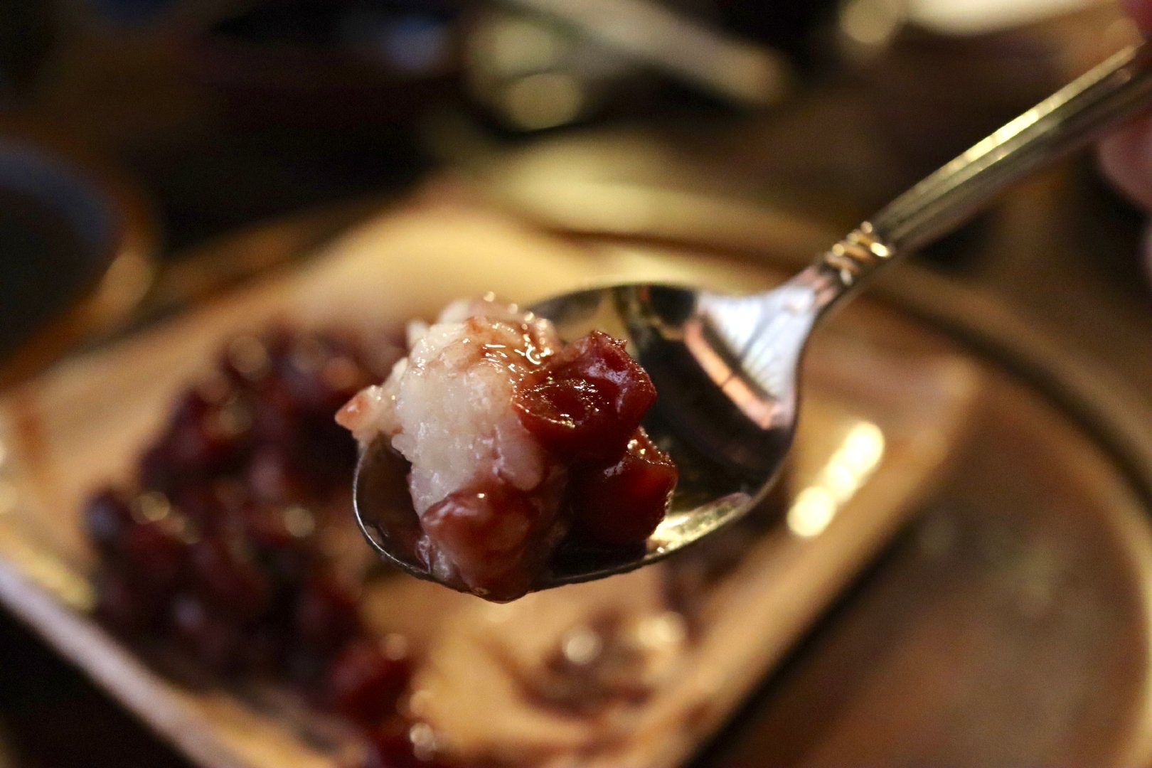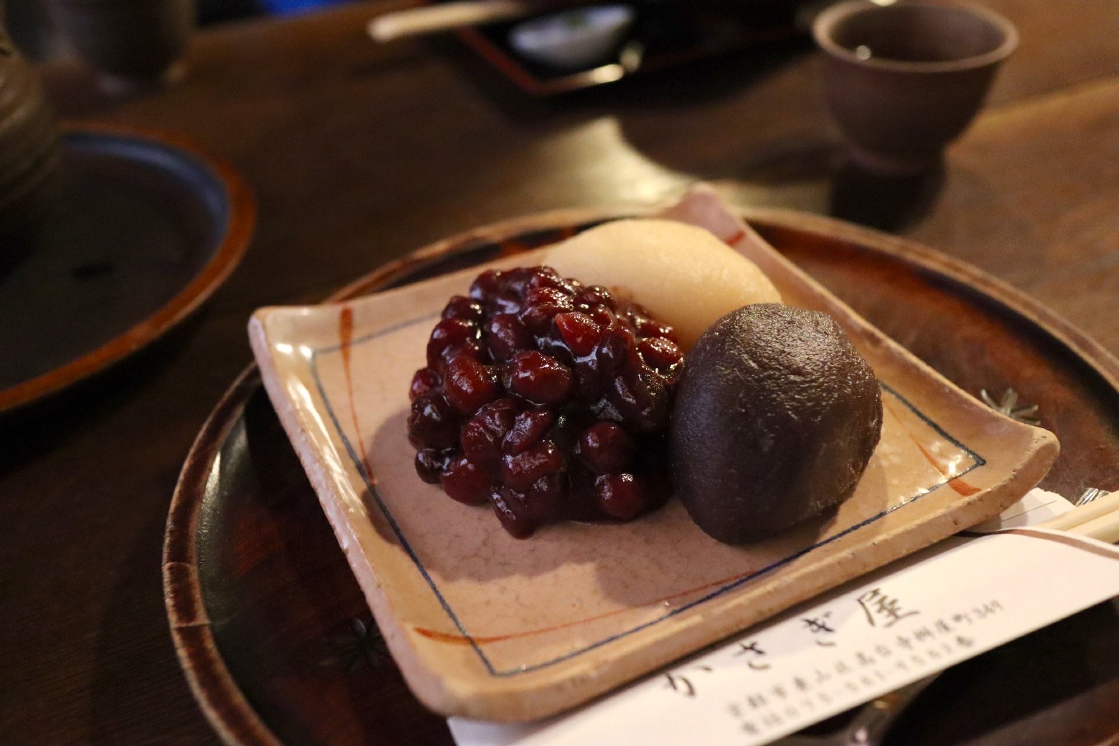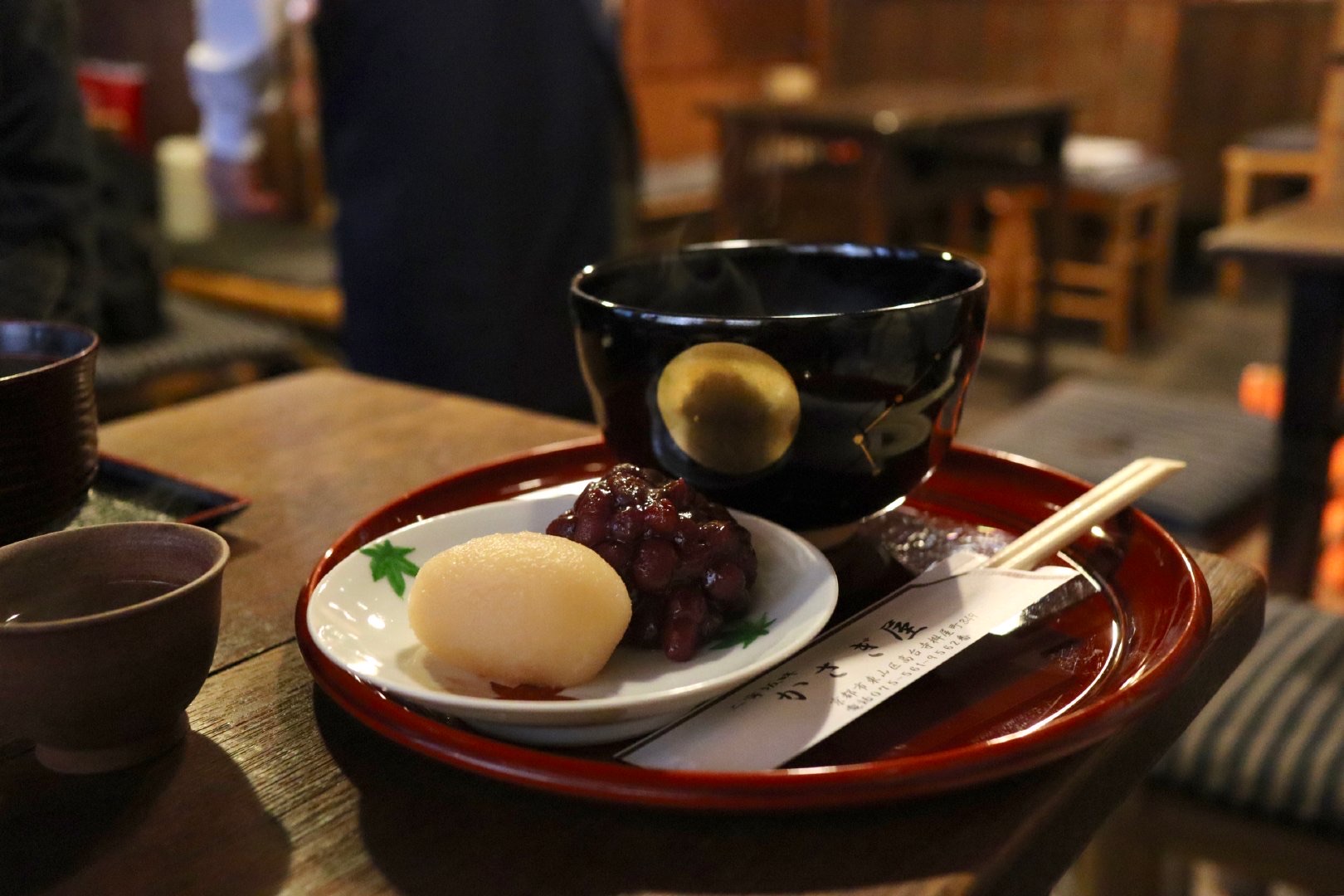 一家小铺子,掀开暖簾进去,静悄悄的一个人都没有,太开心了。 点了两碟糕饼团子,一碗红豆年糕汤。煎茶的茶水是免费的,可以一直续。糕饼是甜丝丝冰凉凉的糯米团子,外边裹着亮晶晶的红豆馅,粒粒分明,好看好吃。 年糕在小火苗上烘烤,膨成胖胖的一团,就像贴完秋膘的我。一把按进红豆汤里,趁热吃。焦焦香香的烤年糕给全糖红豆汤带来了愉悦的新口感。 店员小哥哥很温和。我看到门口贴着禁止拍照的贴纸,小小声地问他,我就拍一张糕饼的照片可以吗。结果他说,可以哟,店里也可以随便拍。 店里有超多美好的小细节,但我沉迷喝茶没有拍。总之是超满意超级世外桃源的一家小店了。