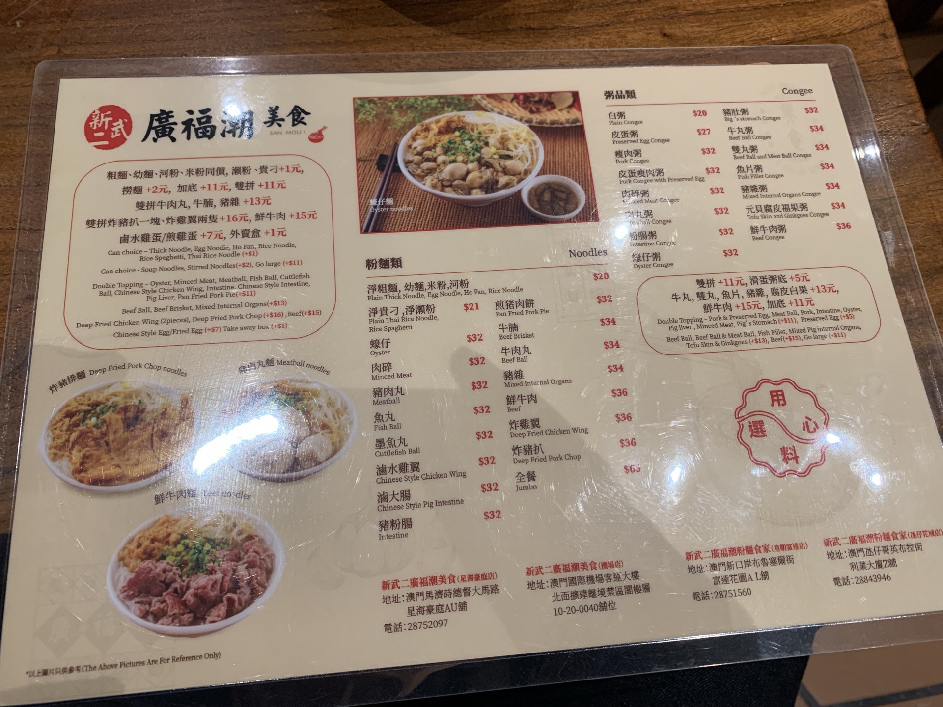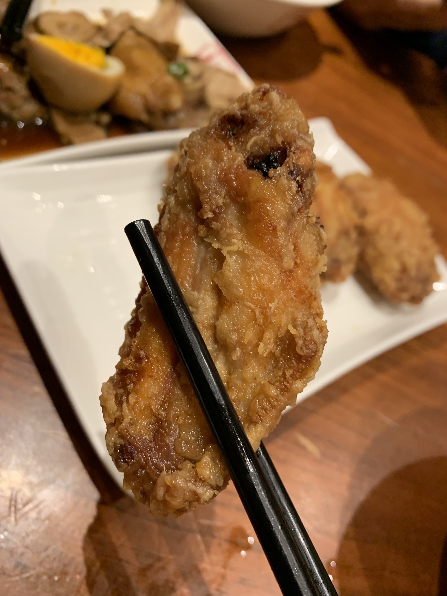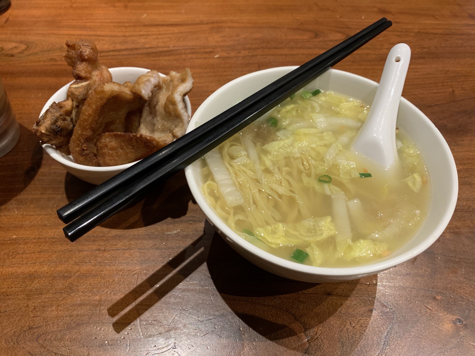 去看澳门回归贺礼陈列馆,在附近找吃的,经过感觉不错,就决定进来试一试。 [环境]这家店算是一家潮汕美食馆,地方算是挺大的。木桌椅比较讲究。在澳门已经是第二家店了。 [服务]员工有说有笑的,感觉不错,吃着挺舒服的。 「炸猪扒面」点了一个主食,在澳门怎么能不吃炸猪扒呢,吃完还真感觉不错。[偷笑]必须推荐他们家的猪扒,而且分量很足。汤底味浓,面有嚼劲,我觉得澳门当地的面也真材实料。 「炸鸡翼」炸鸡翅香脆,脆得来不腻。这是很关键,很多时候吃炸物,吃多一点就会腻,这里的炸鸡翅一点都不腻,很香,吃到真正好吃的鸡翅了。 「卤水拼盘」卤味还是可以的,分量也足。关键是材料足,卤汁味道不会十分浓,恰到好处。但是我觉得味道很好。 「冻奶茶」奶茶很棒,喝到正宗的奶茶。可以自己加糖浆调节甜度。