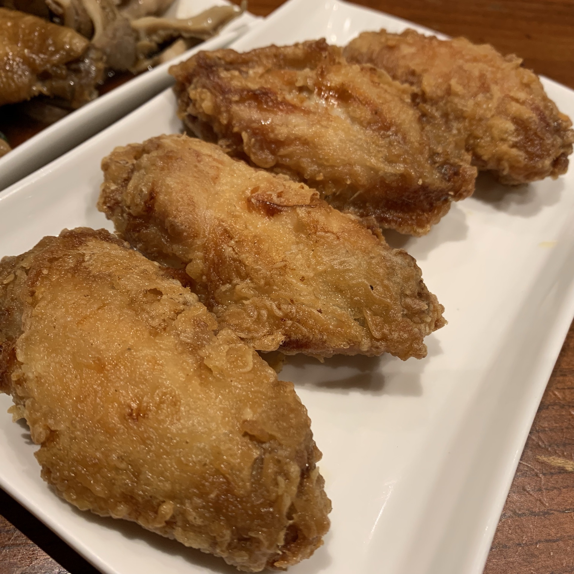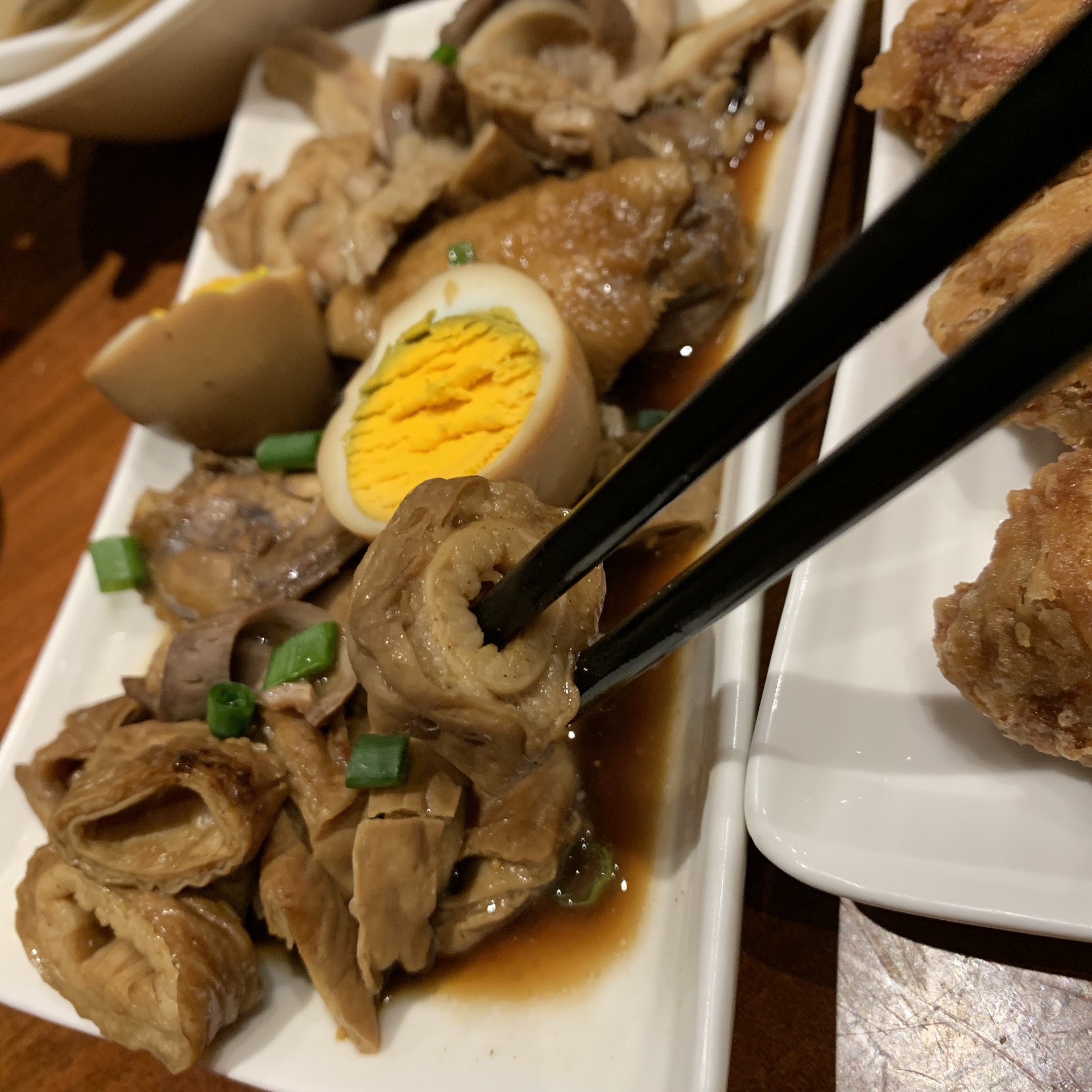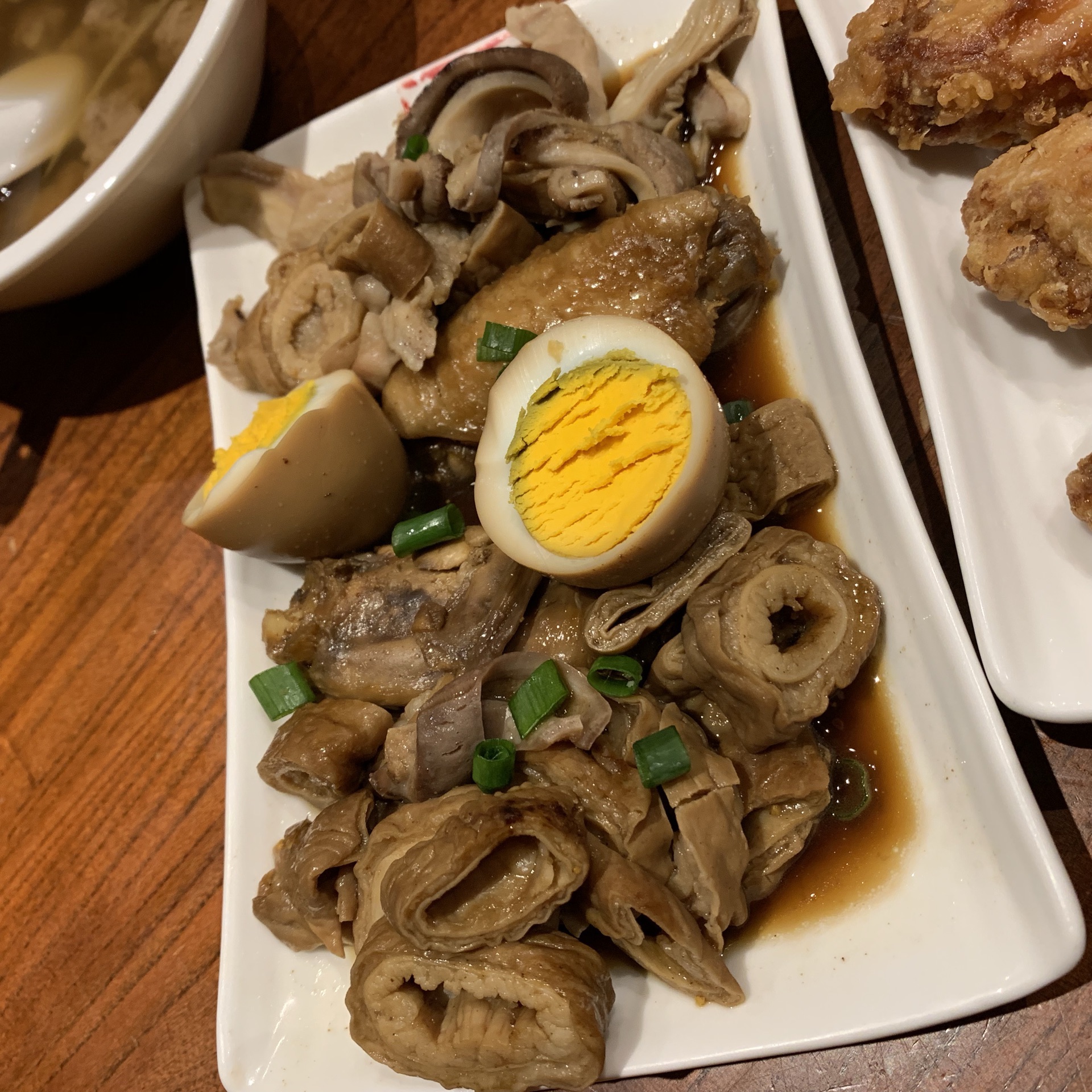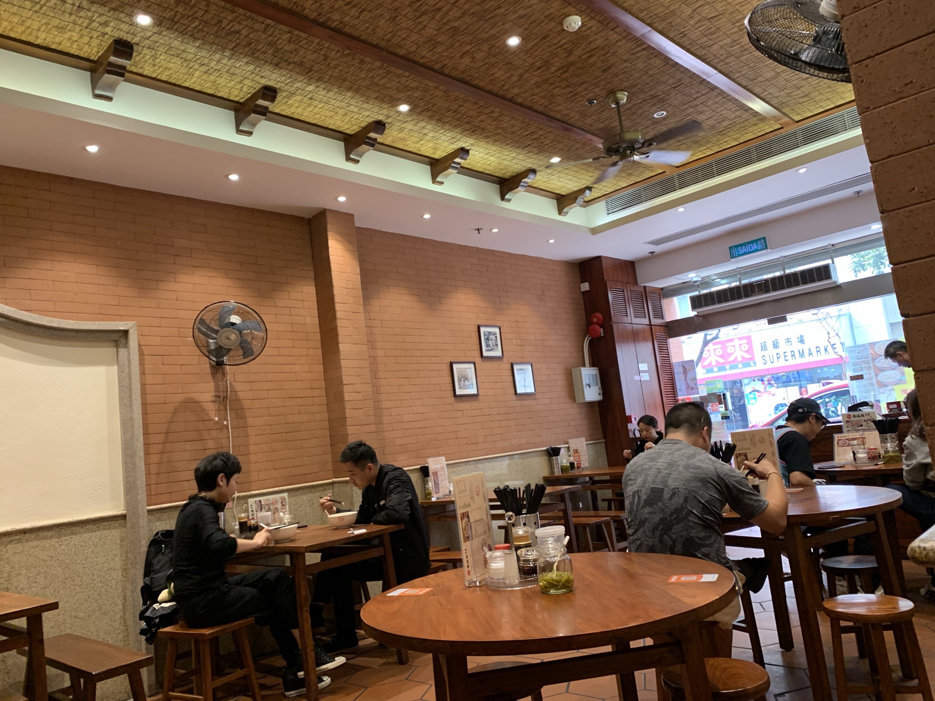 去看澳门回归贺礼陈列馆,在附近找吃的,经过感觉不错,就决定进来试一试。 [环境]这家店算是一家潮汕美食馆,地方算是挺大的。木桌椅比较讲究。在澳门已经是第二家店了。 [服务]员工有说有笑的,感觉不错,吃着挺舒服的。 「炸猪扒面」点了一个主食,在澳门怎么能不吃炸猪扒呢,吃完还真感觉不错。[偷笑]必须推荐他们家的猪扒,而且分量很足。汤底味浓,面有嚼劲,我觉得澳门当地的面也真材实料。 「炸鸡翼」炸鸡翅香脆,脆得来不腻。这是很关键,很多时候吃炸物,吃多一点就会腻,这里的炸鸡翅一点都不腻,很香,吃到真正好吃的鸡翅了。 「卤水拼盘」卤味还是可以的,分量也足。关键是材料足,卤汁味道不会十分浓,恰到好处。但是我觉得味道很好。 「冻奶茶」奶茶很棒,喝到正宗的奶茶。可以自己加糖浆调节甜度。