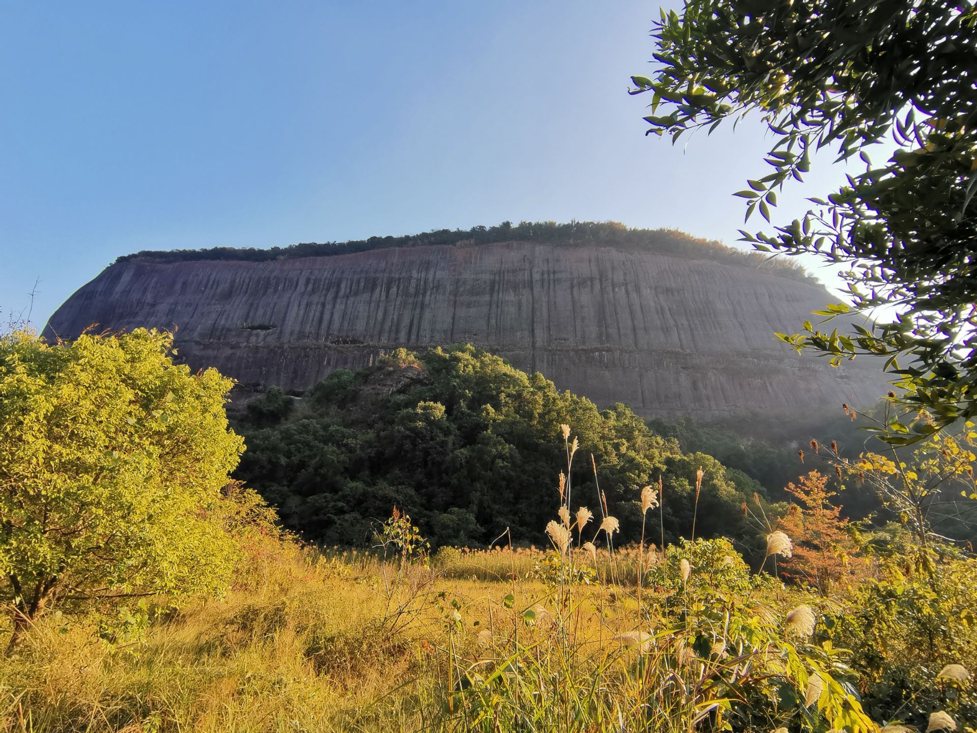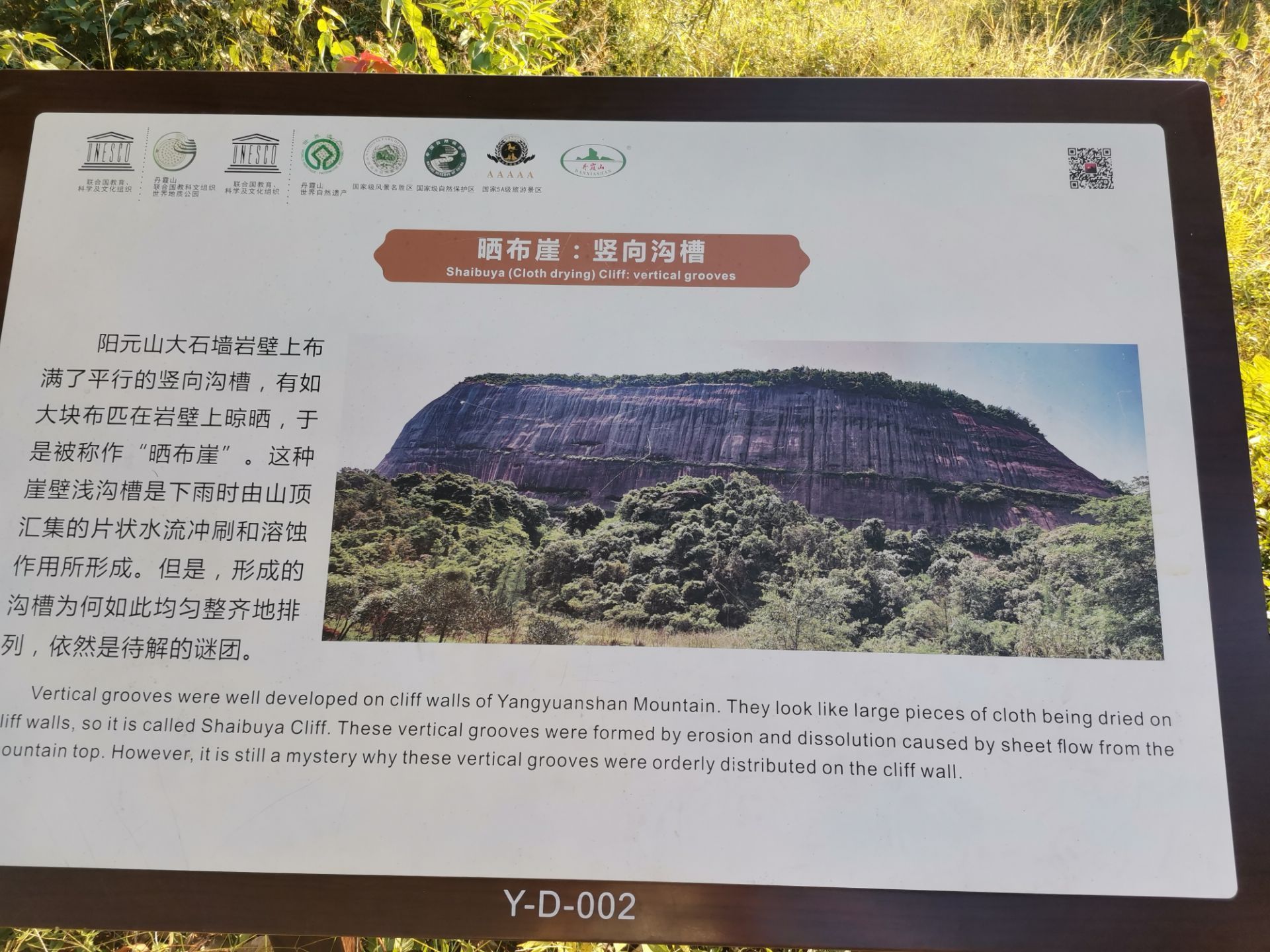 阳元山景区的晒布崖,崖壁坚向沟槽,阳元山大石壁岩壁上布满了平行的竖向浅沟槽,有如大块布匹在岩壁上晾晒阳元山景区的晒布崖,崖壁坚向沟槽,阳元山大石壁岩壁上布满了平行的竖向浅沟槽,有如大块布匹在岩壁上晾晒,称晒布岩。这种岩壁浅构漕是下雨时由山顶汇集的片状水流侵蚀及溶蚀作用形成的。