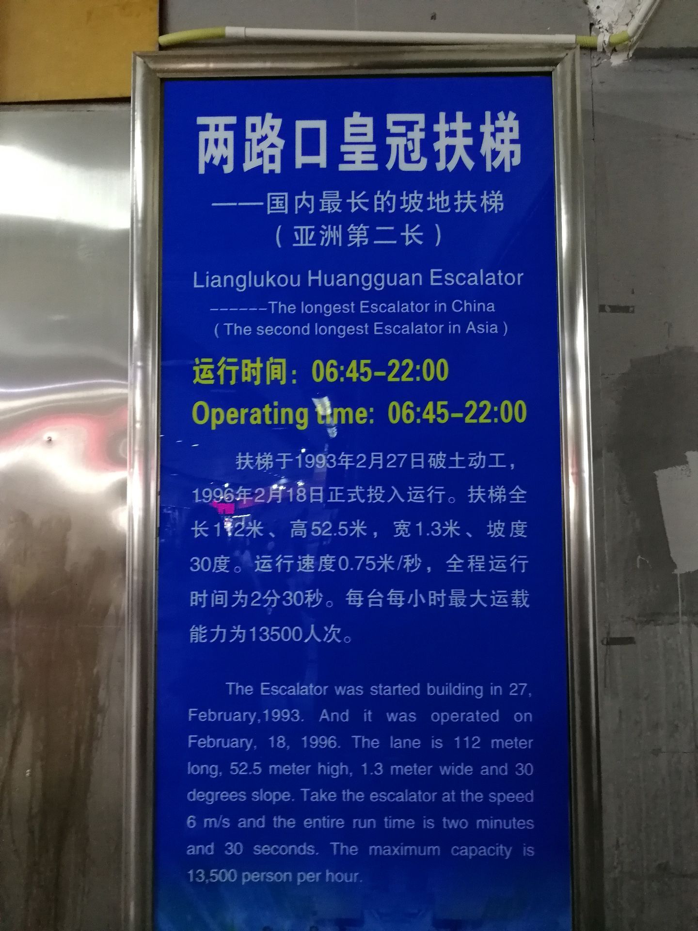 两路口皇冠大扶梯——国内最长的坡地扶梯(亚洲第二长)。电梯:全长112米,宽1.3米,提升高度52.7米。相当于重庆的交通工具,电梯的配套设施比较老旧,电梯不是免费的,单程需要2元一人,运营时间:06:45-22:00。算是重庆特色,不过也没有很特别。对于我们经常坐电梯的来说,还不如坐地铁站或者是商场内的电梯。