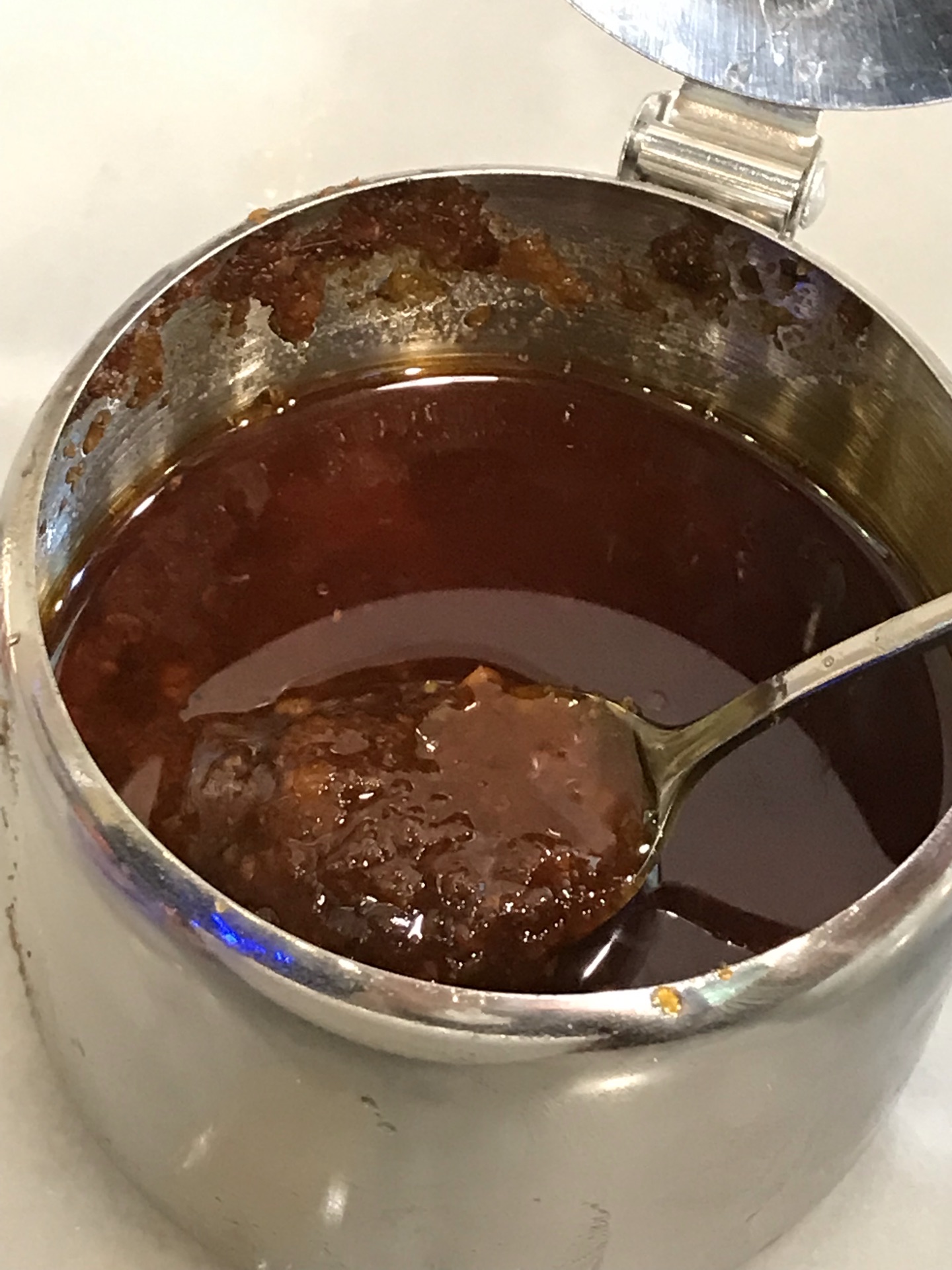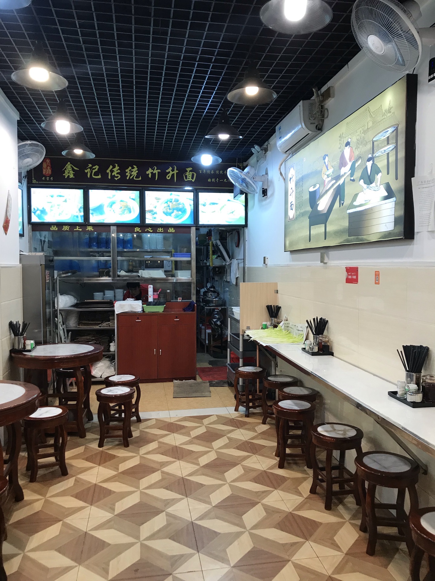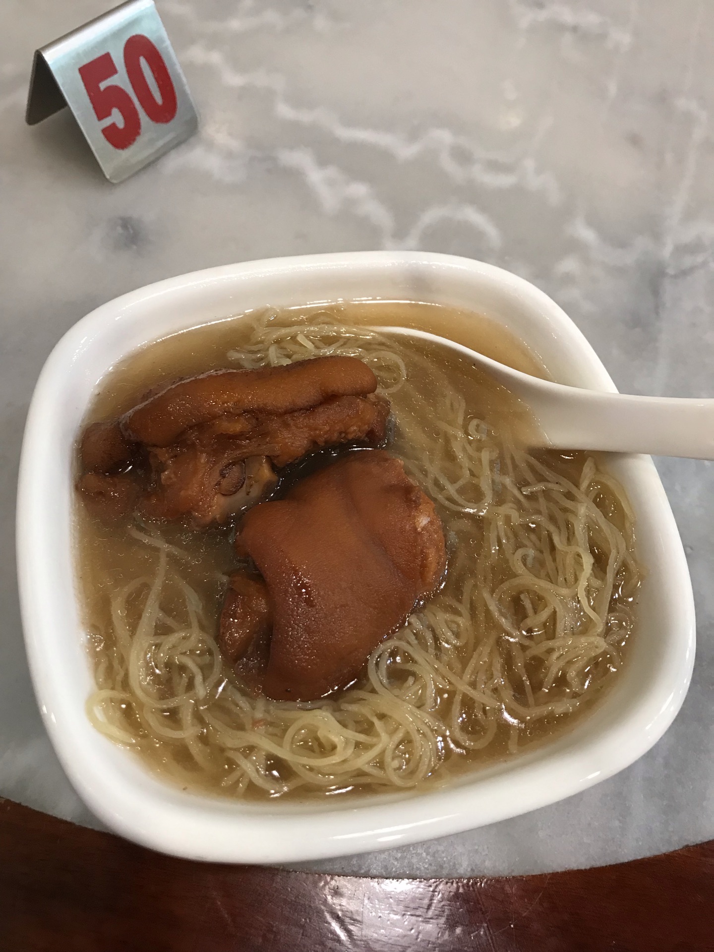 这家门面不大,我是一路走走走跟着回头一看才发现它。 虾饺烧卖、肠粉云吞面,对云吞面也是老广的情节,其实我们有时说云吞面也不一定是云吞和面,通常把竹升面也会有时称作云吞面(煮云吞的特色用面) 面条必须细一点爽口弹牙的碱水面,手压面为上品,这次来吃了中碗猪脚面,面条不错,汤底有点油腻感,猪脚没有特别出色,倒是辣椒酱加分,虽然很辣但也很香。