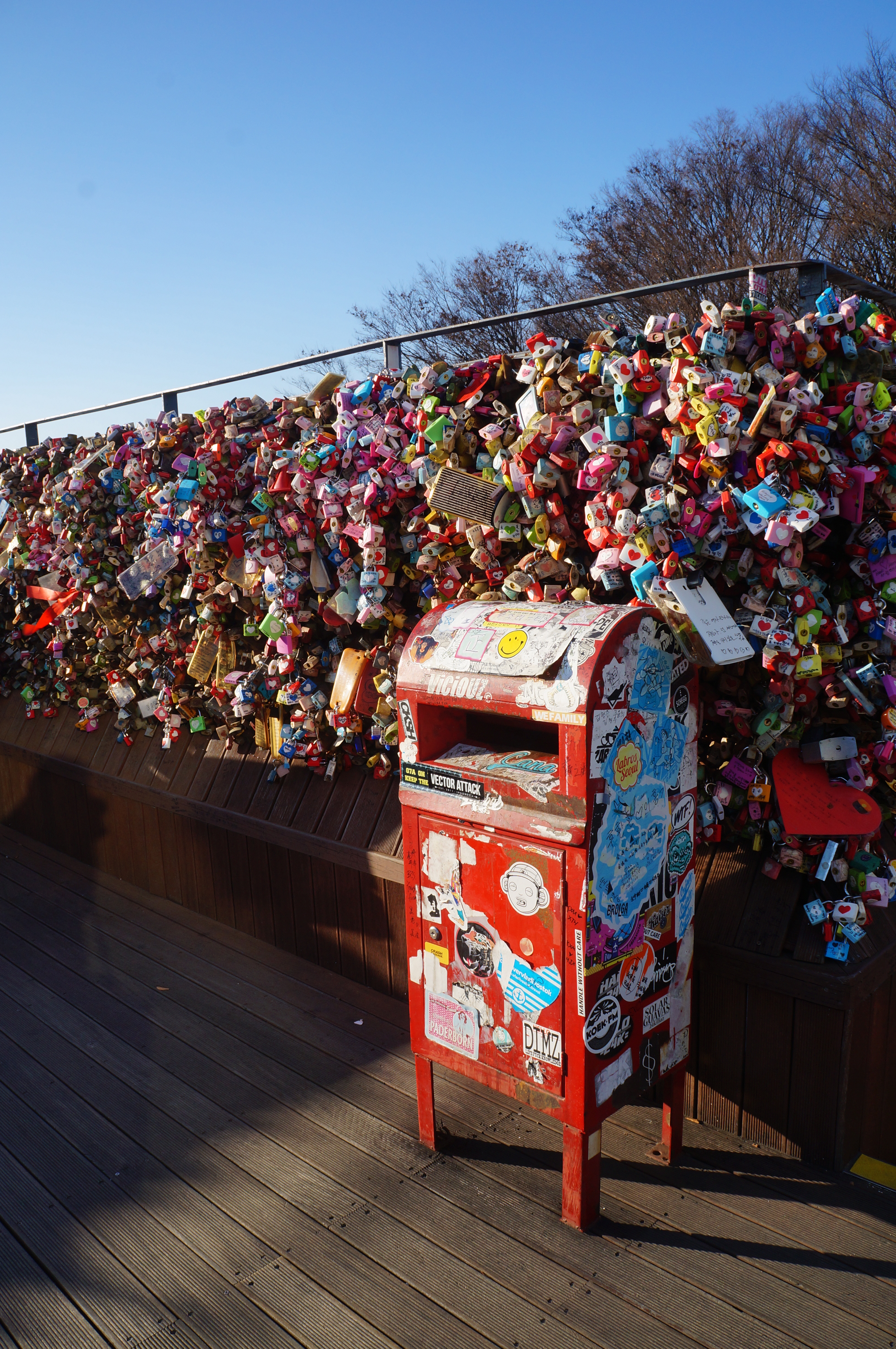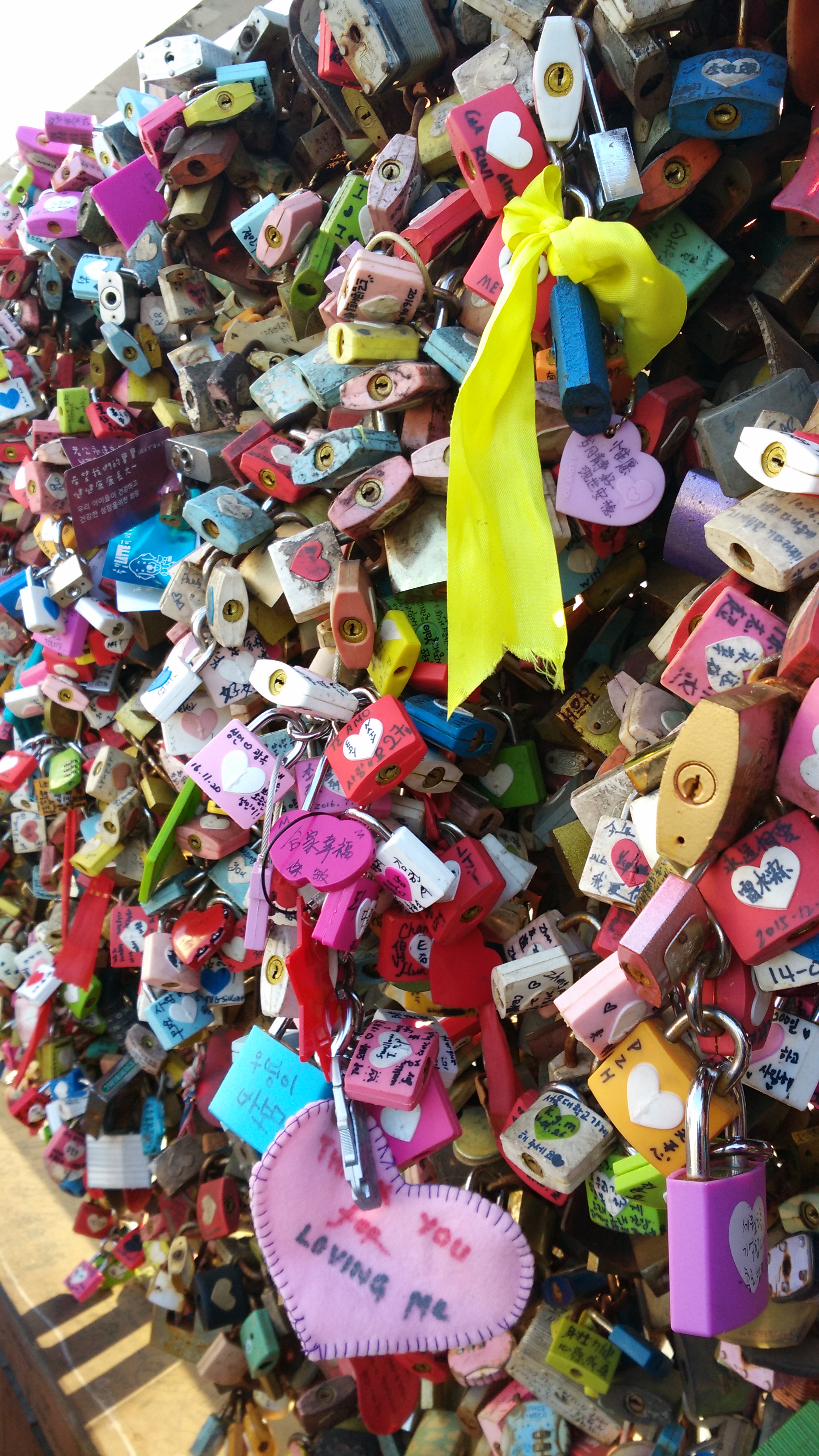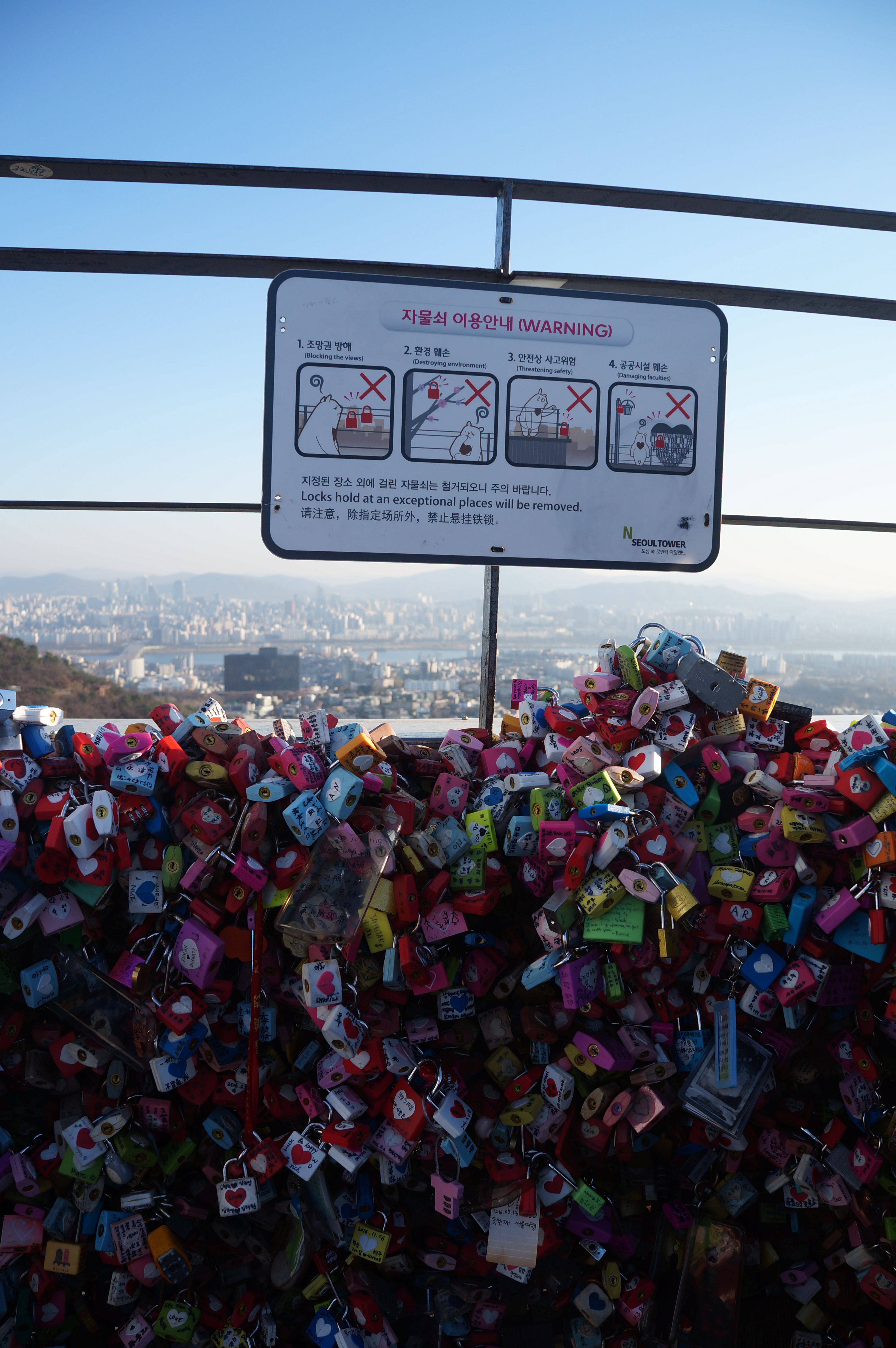 N首尔塔爱情锁墙就在首尔塔的平台上,这里也是多部韩剧的拍摄地。这里的爱情锁墙也吸引了很多年轻情侣打卡,慢慢的爱情锁让这里充满着幸福。没有情人的我来到这里唯有在这里到此一游,拍拍风景,感受一下这里的浪漫氛围。五颜六色的锁拼凑成一幅漂亮的景色。