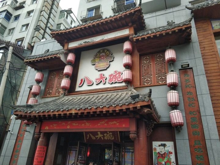 典型的东北菜馆,在这里可能会吃到最齐全的东北菜了,店内装修很有东北农村的特色,店员服务热情。几个硬菜的上菜方式非常特别,菜量太大,平均一个人一个菜还吃不了。锅包肉,红烧肉干豆角,拆骨肉都非常好吃。八大碗是民族特色菜,在沈阳有很多连锁店,酱脊骨,大锅菜啥的,敲锣打鼓抬着来上菜的,有点特色。大体口味对于东北人来讲,就是东北菜。