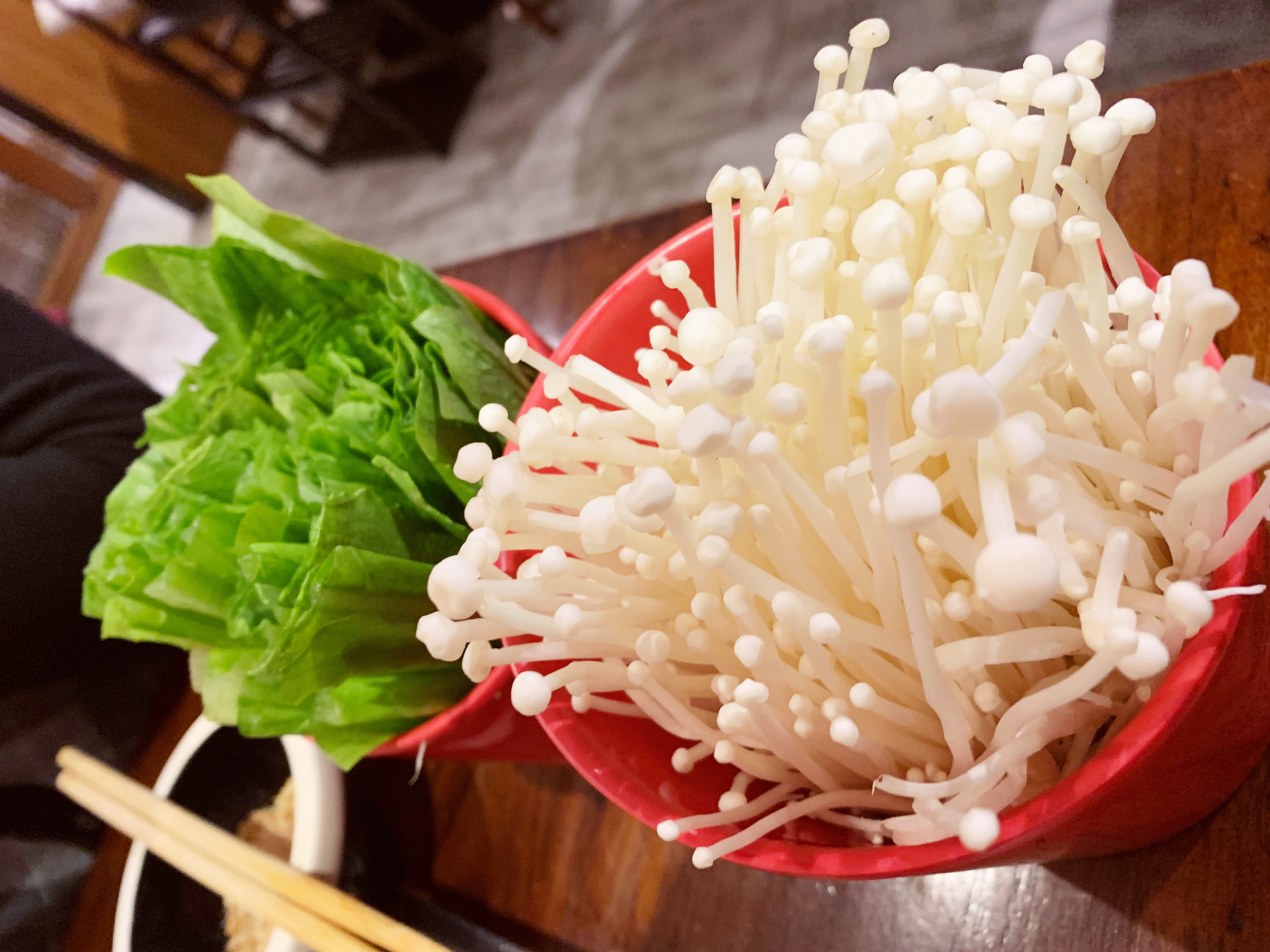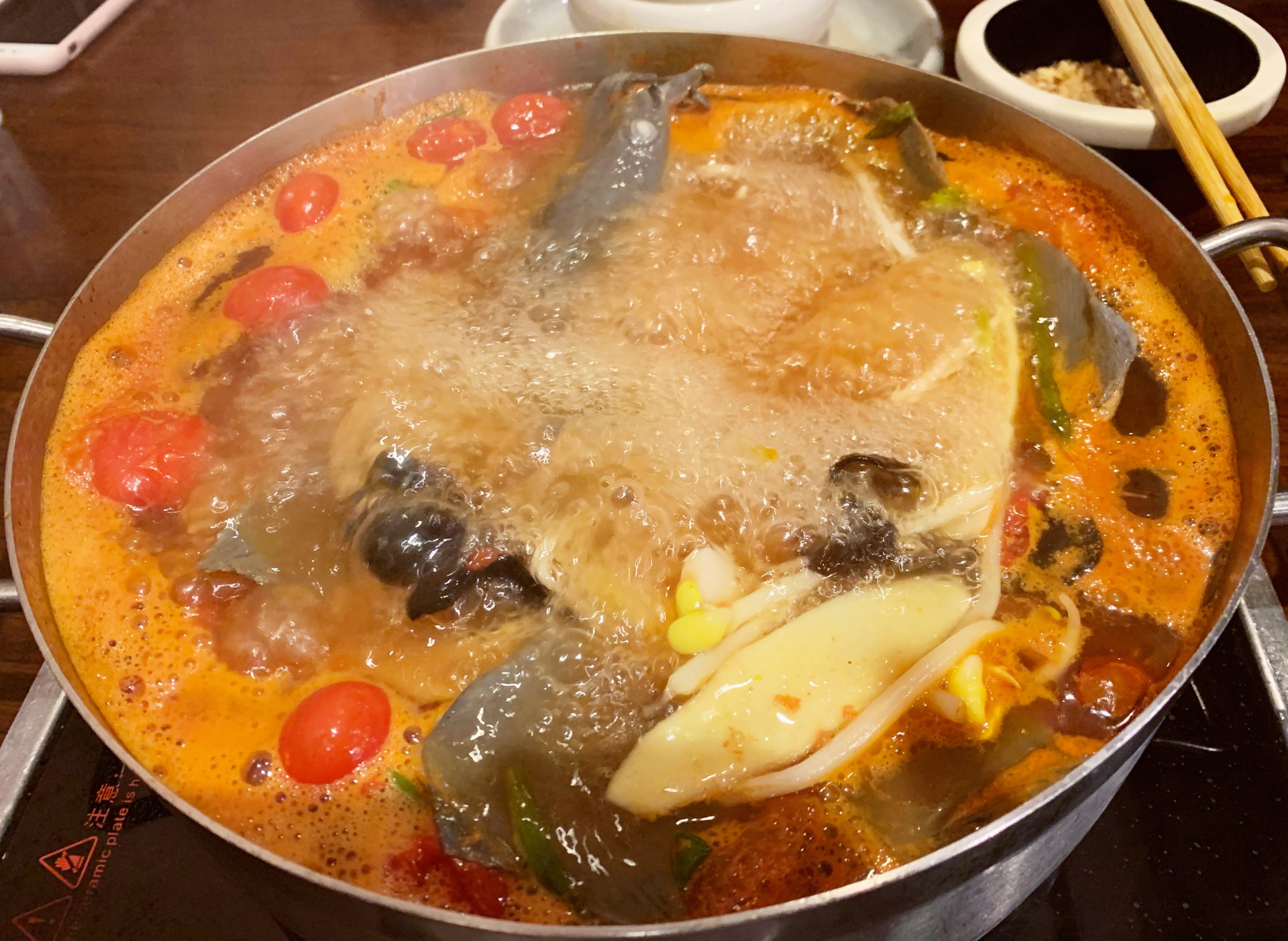 朋友来二贵前,提早在网上团购了酸汤鱼的套餐。套餐包括一条梭边鱼和金针菇、油麦菜各一份,以及两碗米饭。本想着吃一吃不够了再添菜,没想到鱼还挺大,只是在服务员的建议下,额外加了两份带着酱豆腐的花生碎蘸料,其实锅底的味道酸、咸适度很可口,蘸料不是必需的,这款套餐很实在。