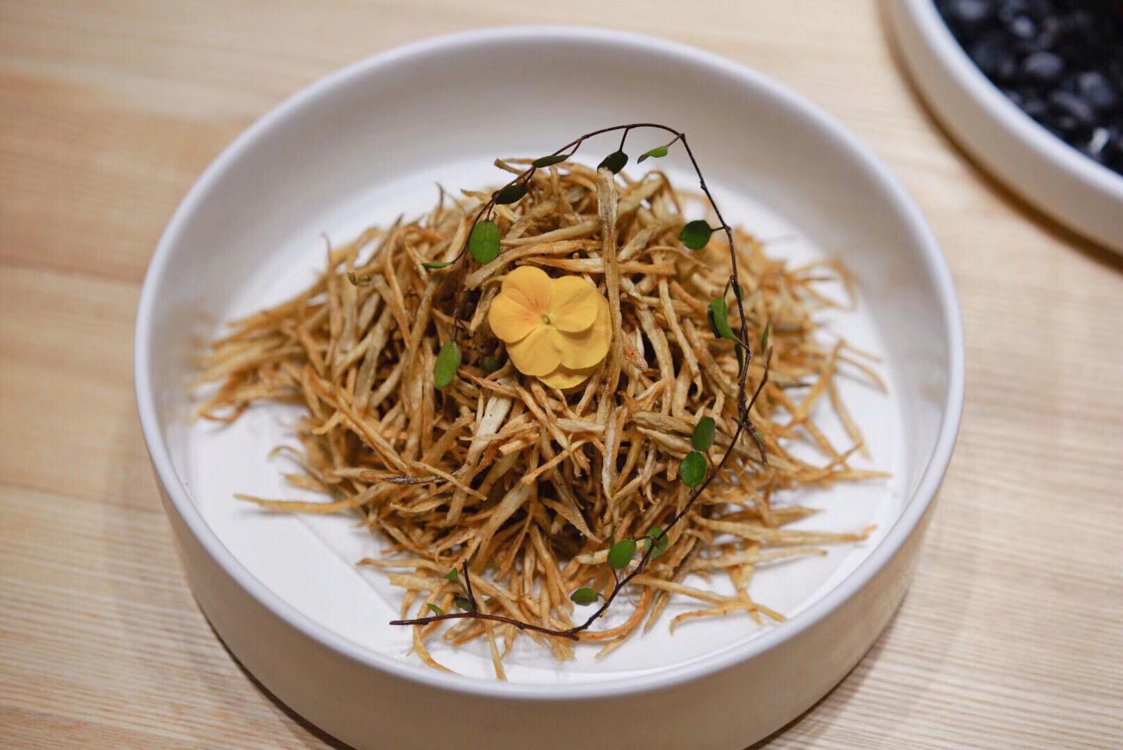 【酥炸牛蒡】一上桌我还以为是小时候吃的红薯干,没想到是酥炸牛蒡,口感酥脆,最为磨牙小食极好的选择